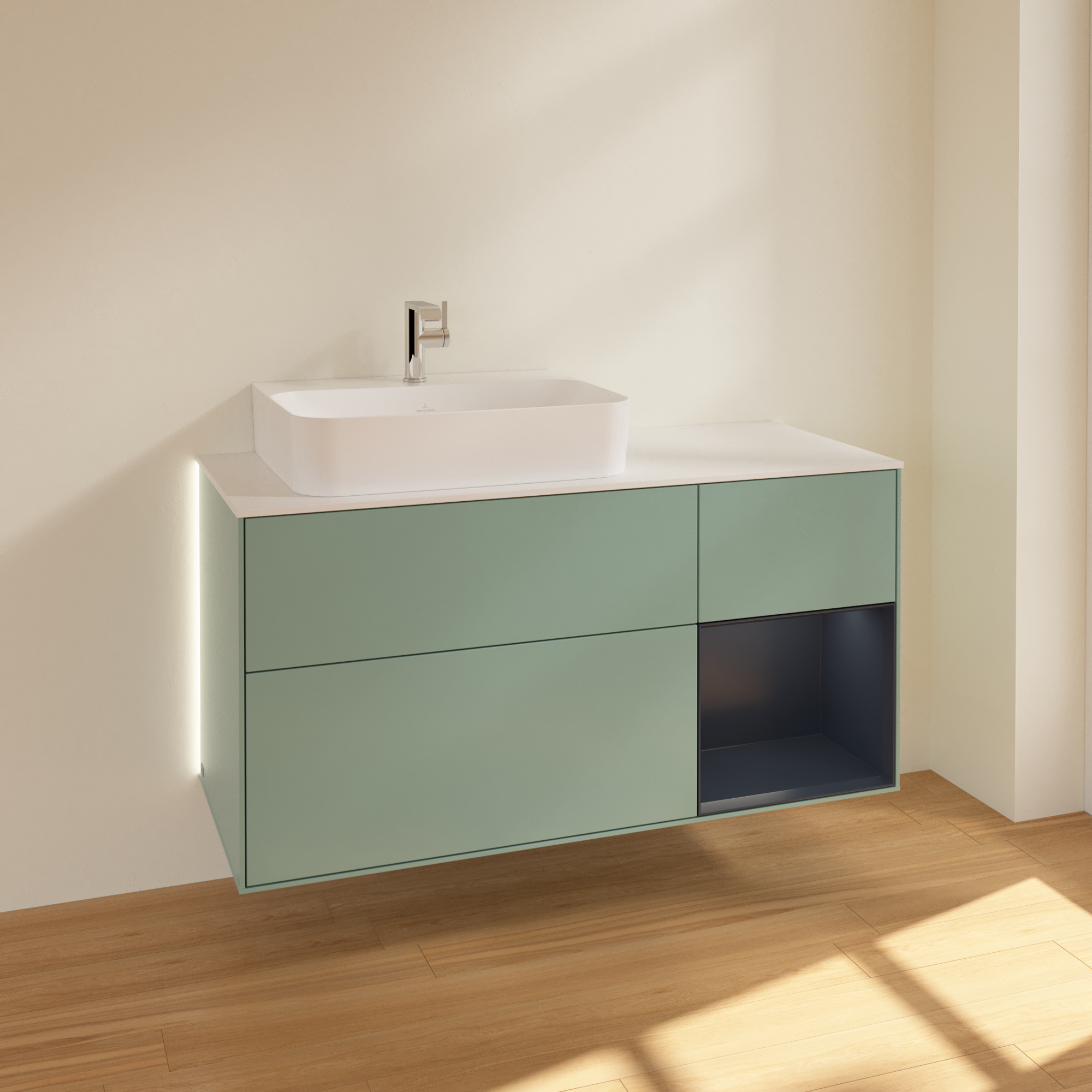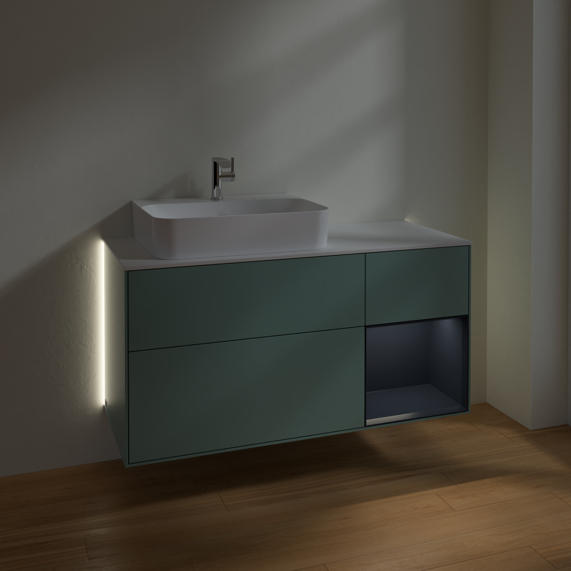 Finion Vanity unit, with lighting, 3 pull-out compartments, 1200x603x501mm, Body: Olive Matt Lacquer, Front: Olive Matt Lacquer, Shelf: Midnight Blue Matt Lacquer, Cover plate: Glass White Matt