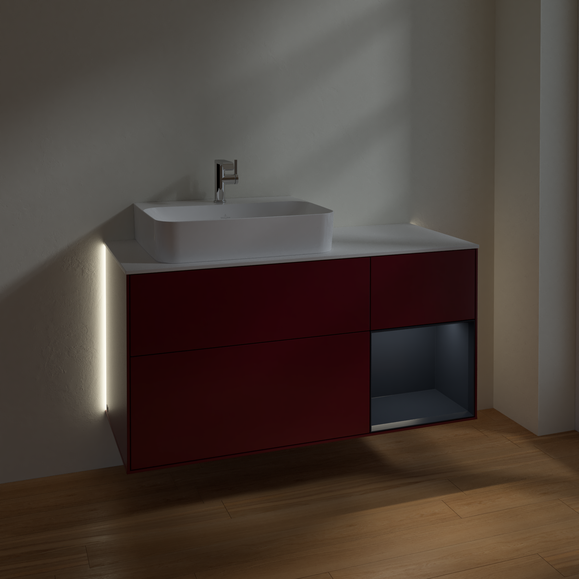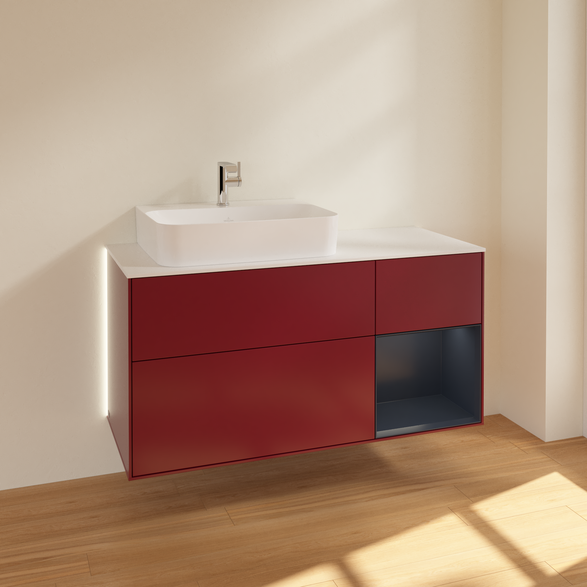 Finion Vanity unit, with lighting, 3 pull-out compartments, 1200x603x501mm, Body: Peony Matt Lacquer, Front: Peony Matt Lacquer, Shelf: Midnight Blue Matt Lacquer, Cover plate: Glass White Matt