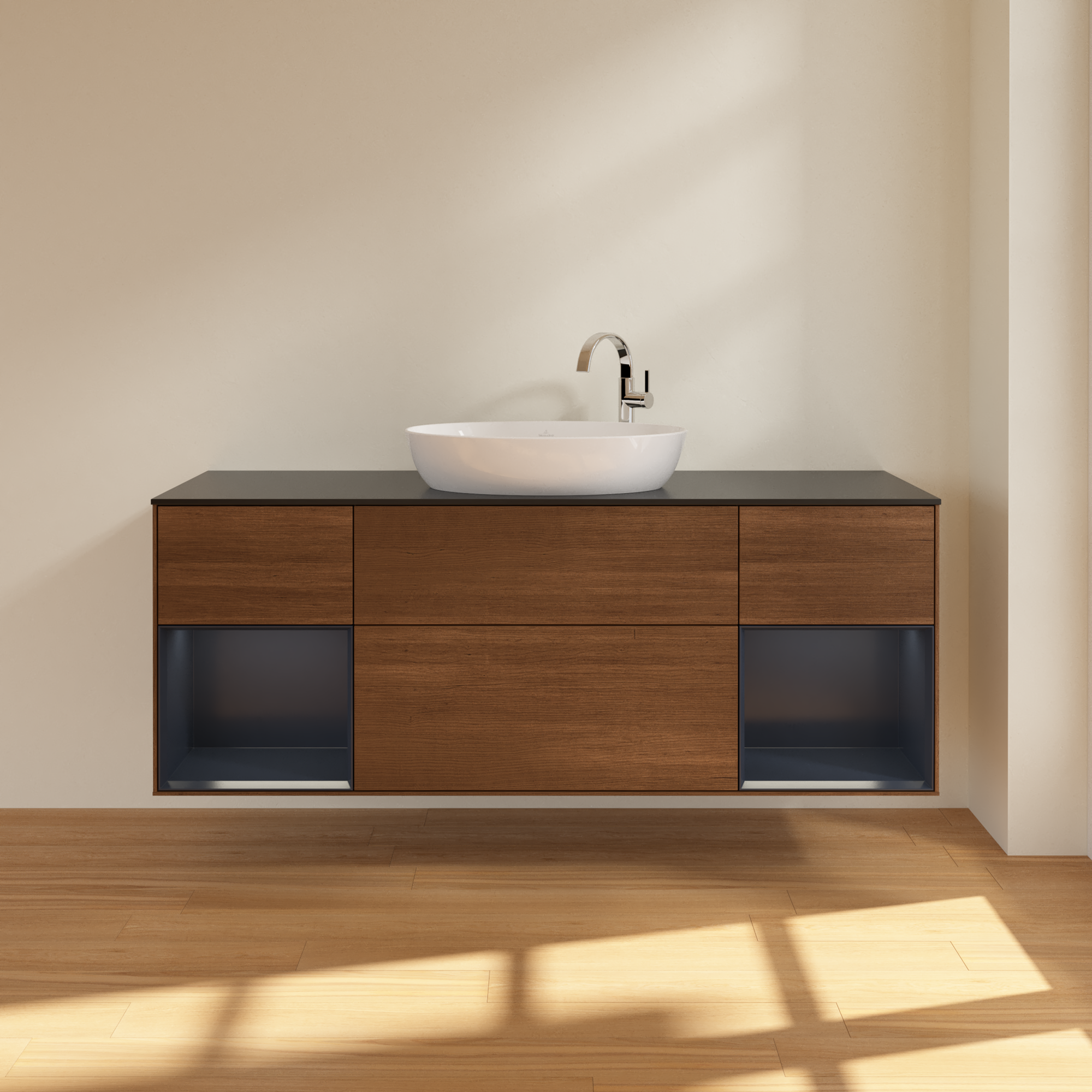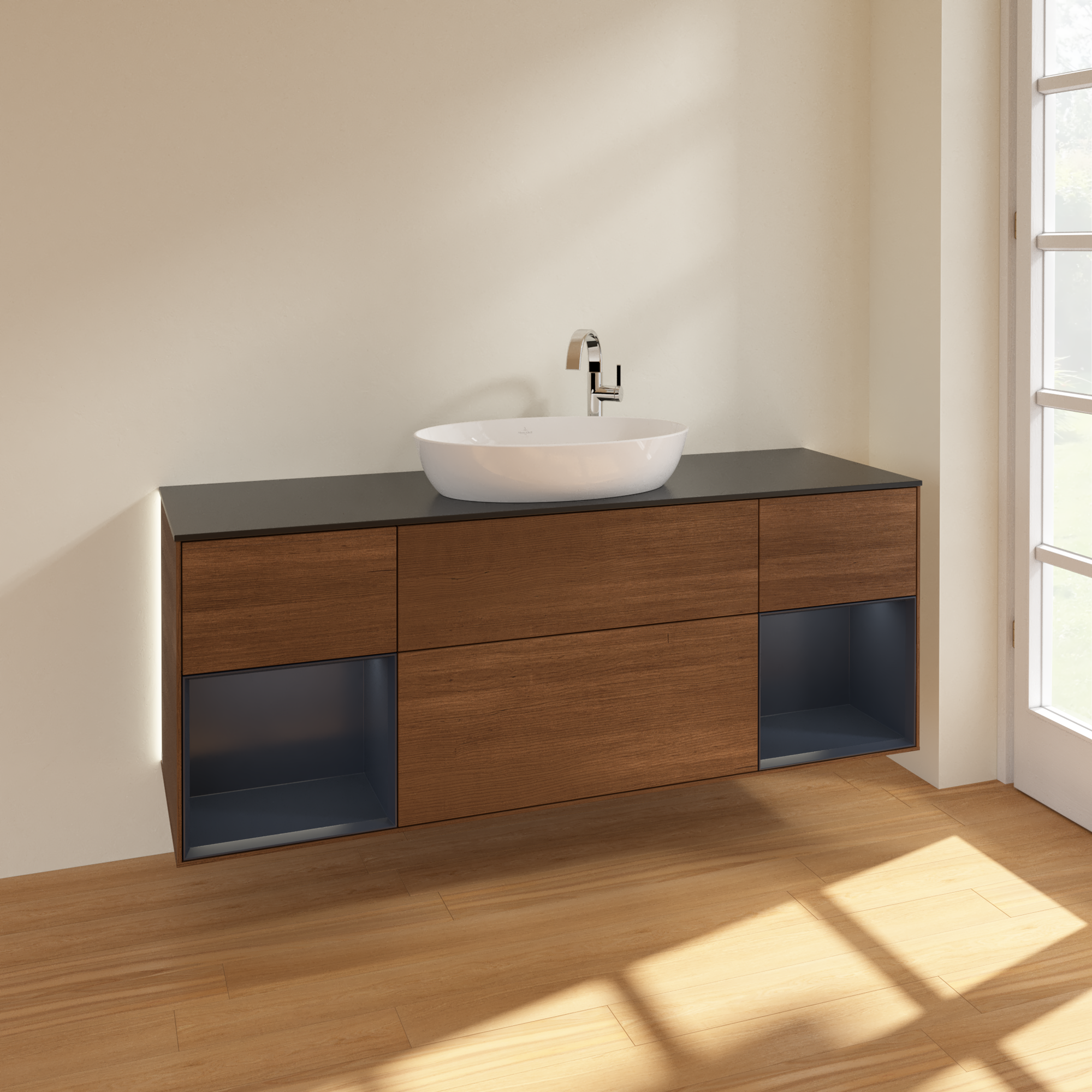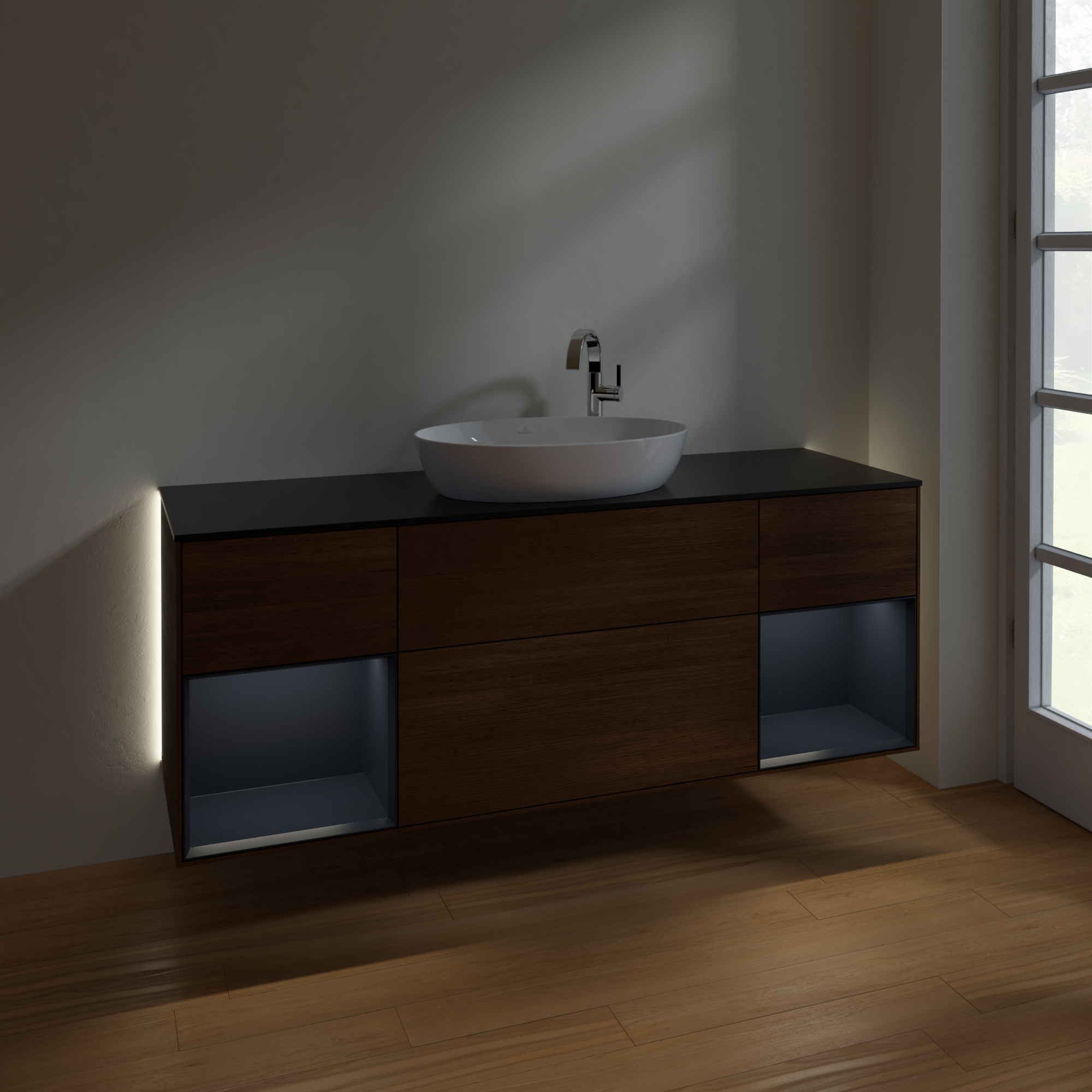 Finion Vanity unit, with lighting, 4 pull-out compartments, 1600x603x501mm, Body: Walnut Veneer, Front: Walnut Veneer, Shelf: Midnight Blue Matt Lacquer, Cover plate: Glass Black Matt