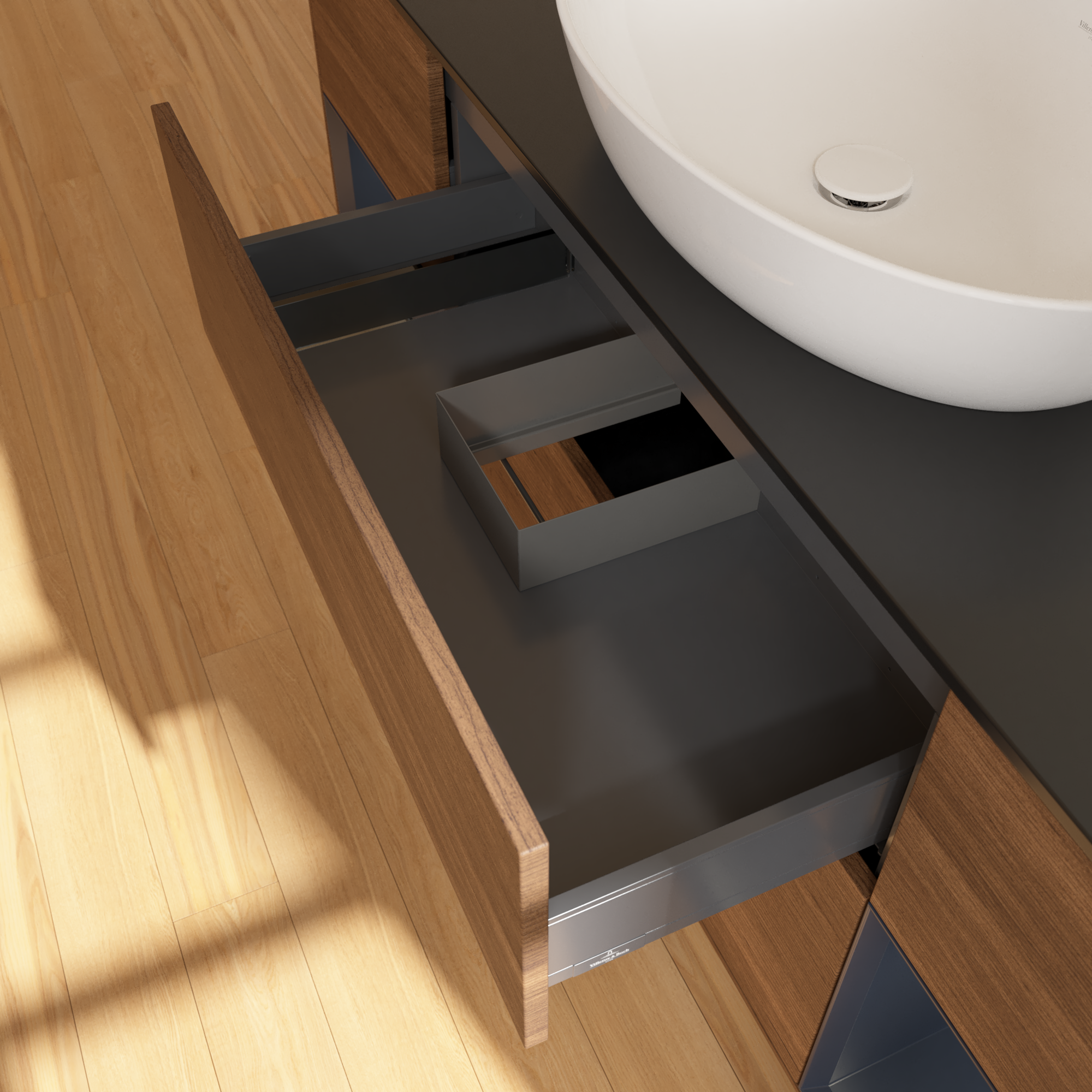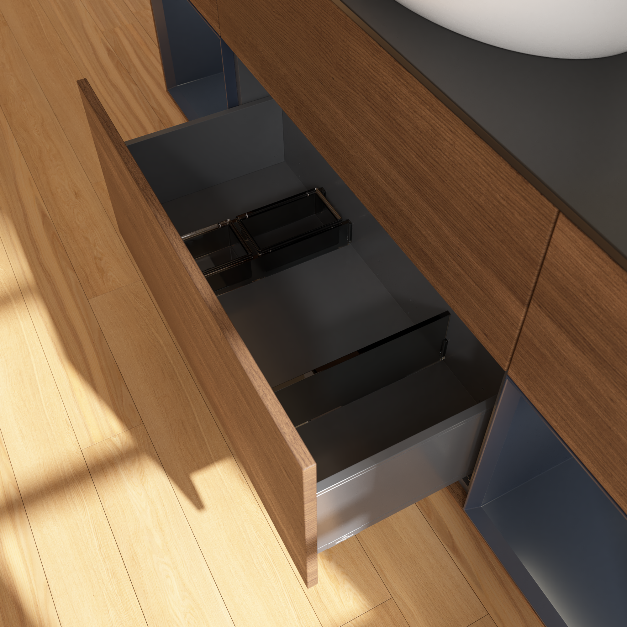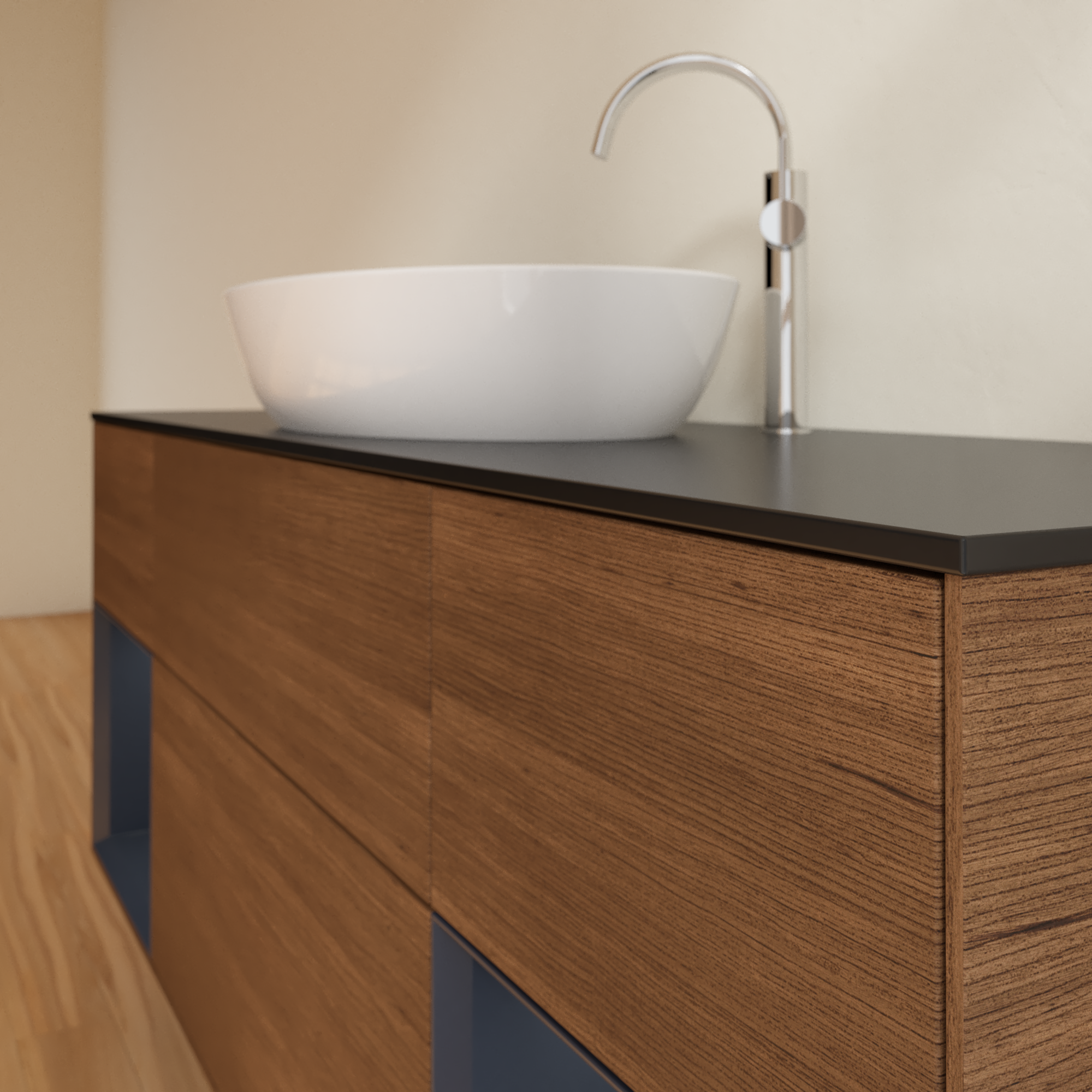 Finion Vanity unit, with lighting, 4 pull-out compartments, 1600x603x501mm, Body: Walnut Veneer, Front: Walnut Veneer, Shelf: Midnight Blue Matt Lacquer, Cover plate: Glass Black Matt