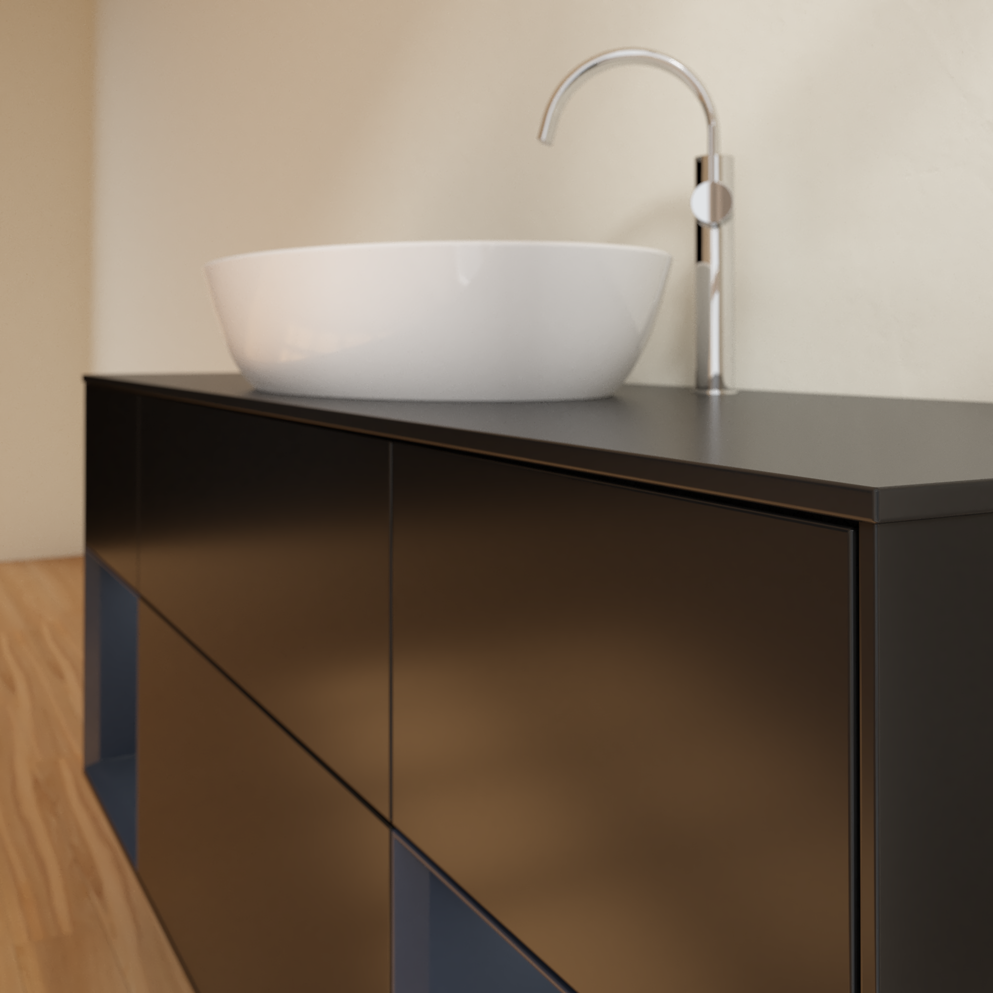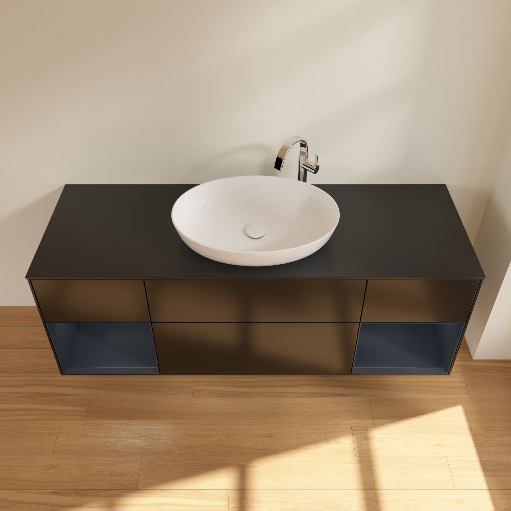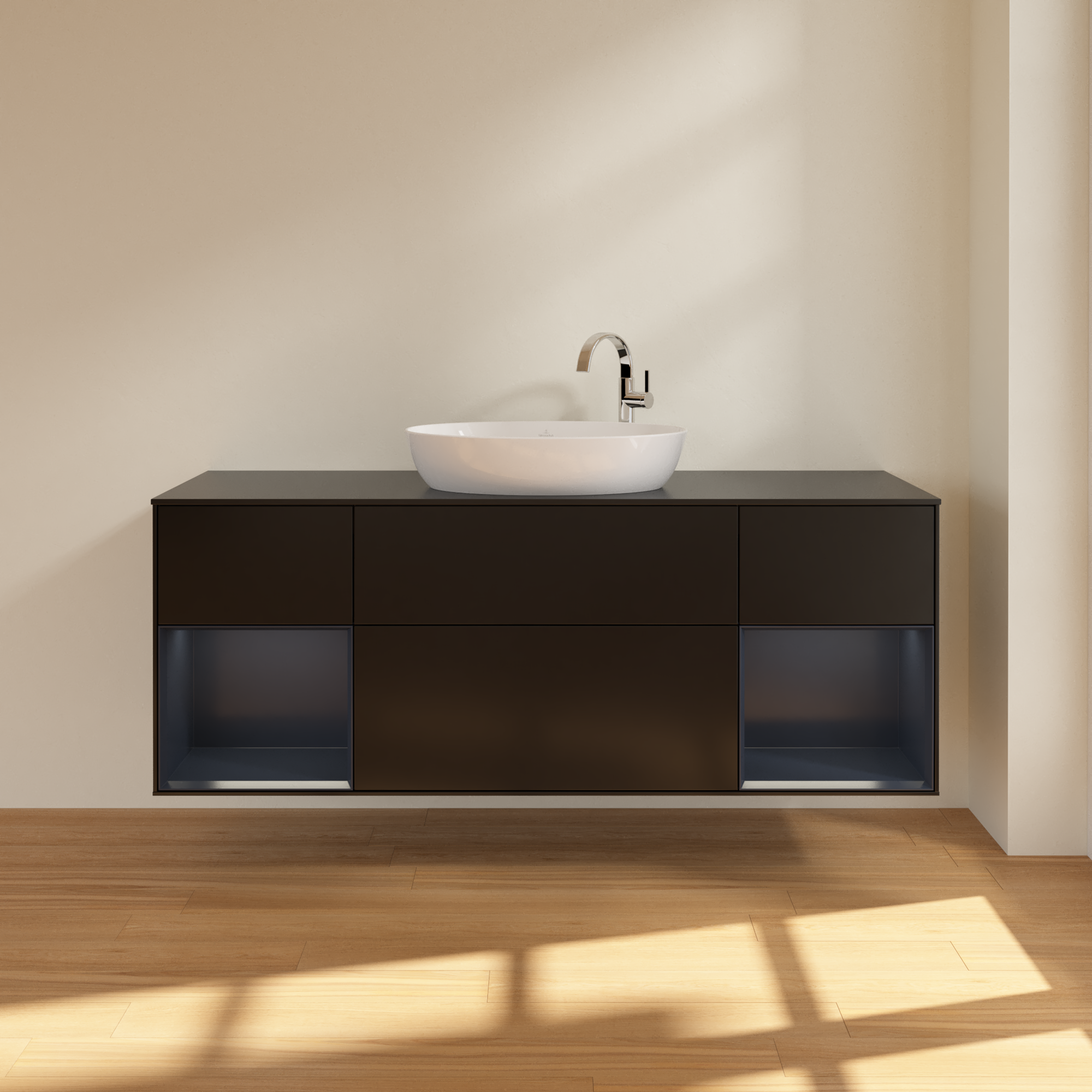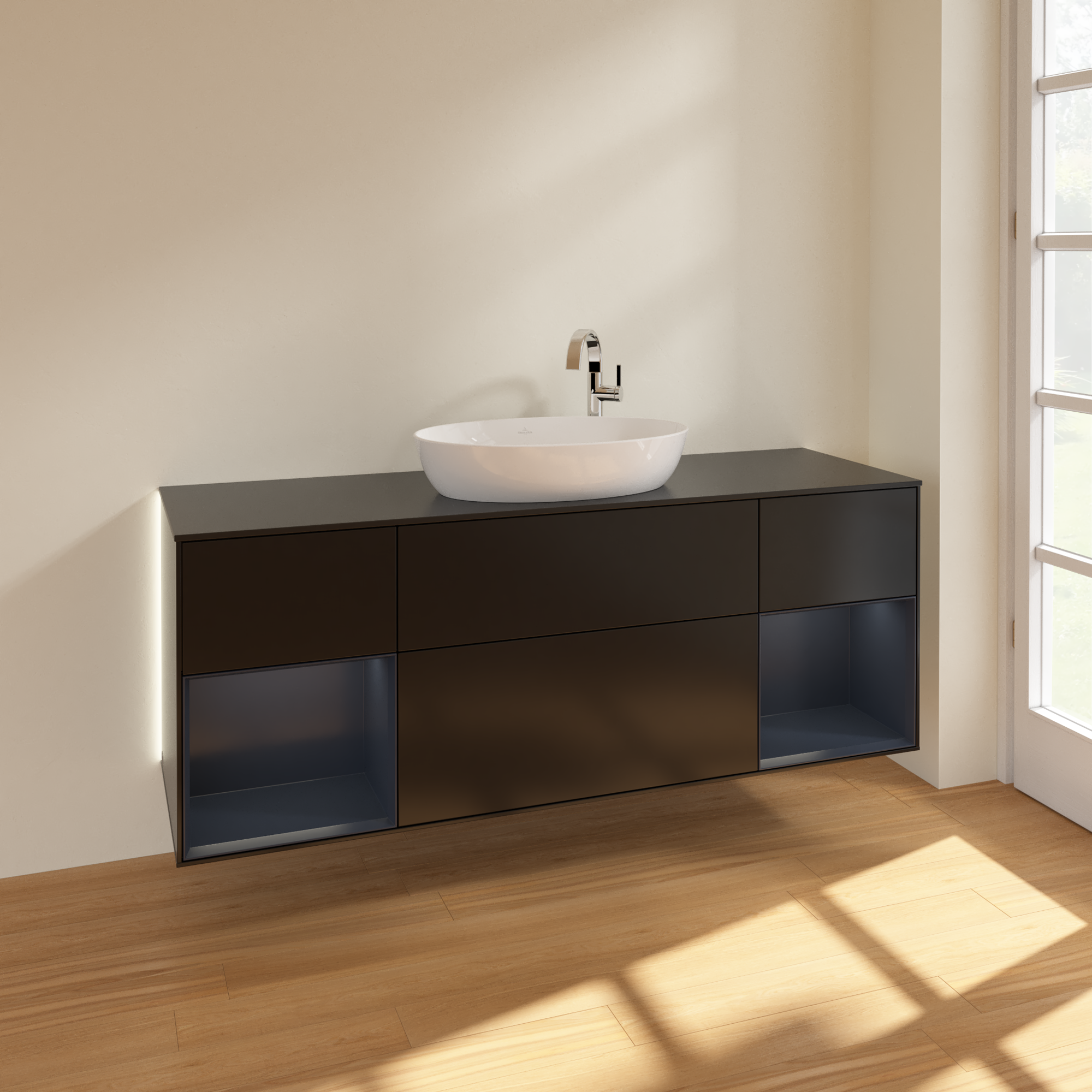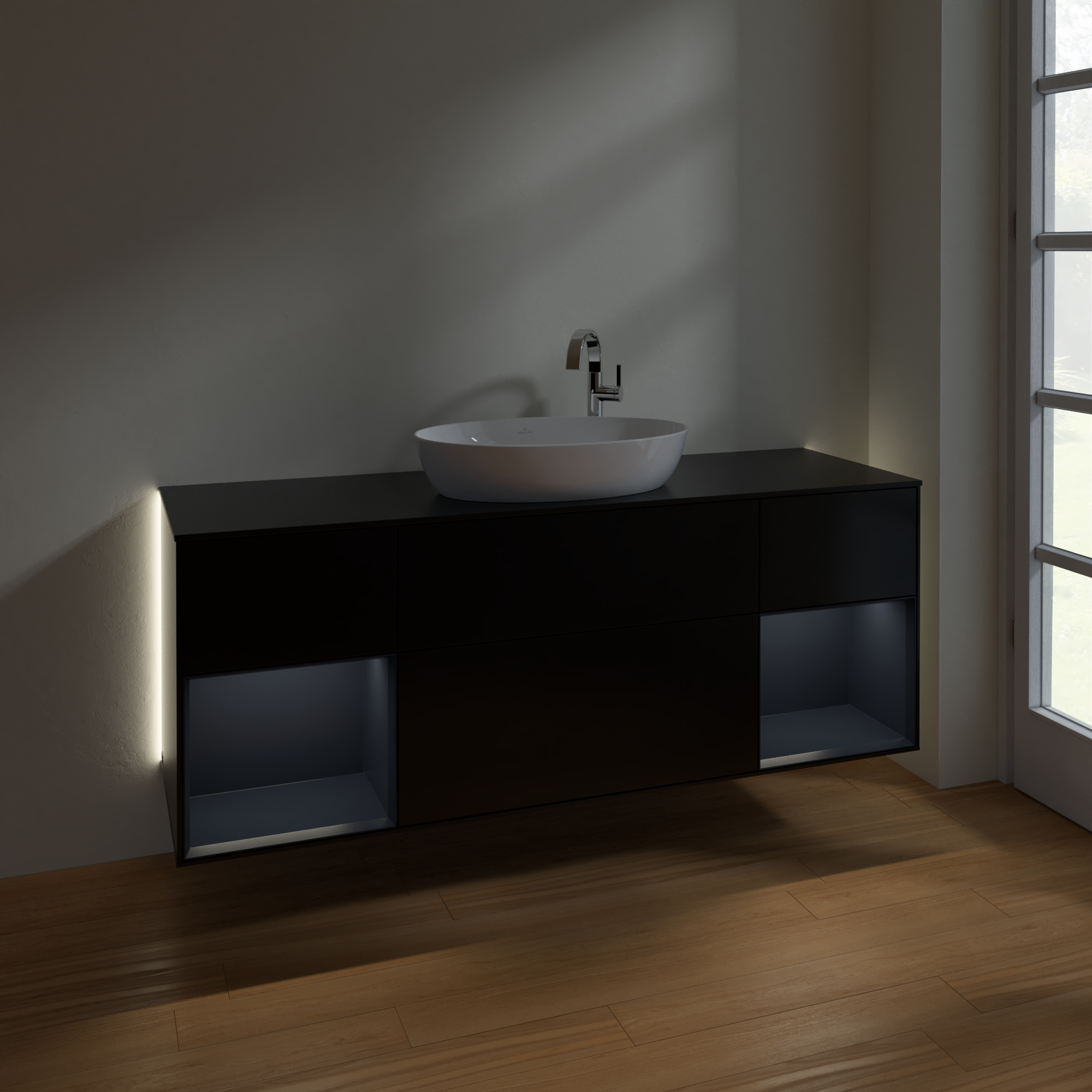 Finion Vanity unit, with lighting, 4 pull-out compartments, 1600x603x501mm, Body: Black Matt Lacquer, Front: Black Matt Lacquer, Shelf: Midnight Blue Matt Lacquer, Cover plate: Glass Black Matt