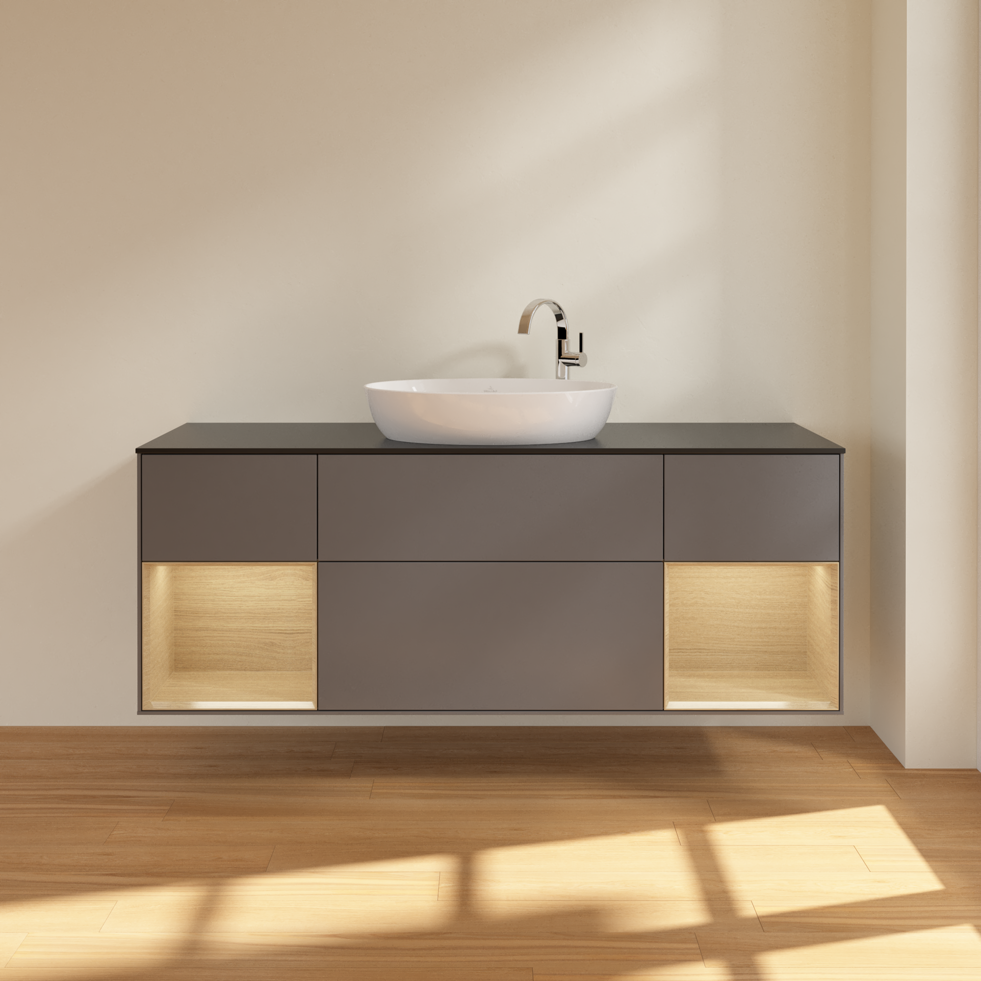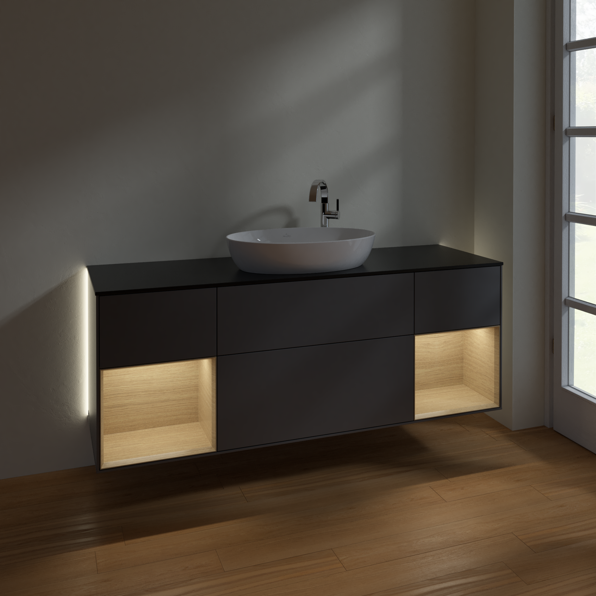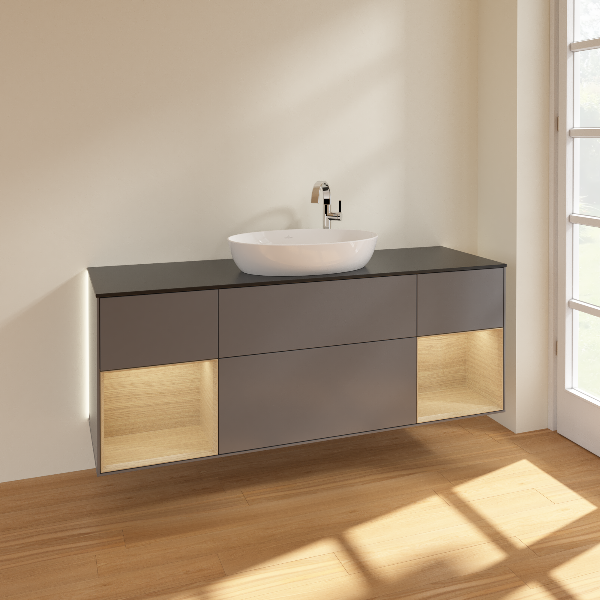 Finion Vanity unit, with lighting, 4 pull-out compartments, 1600x603x501mm, Body: Anthracite Matt Lacquer, Front: Anthracite Matt Lacquer, Shelf: Oak Veneer, Cover plate: Glass Black Matt