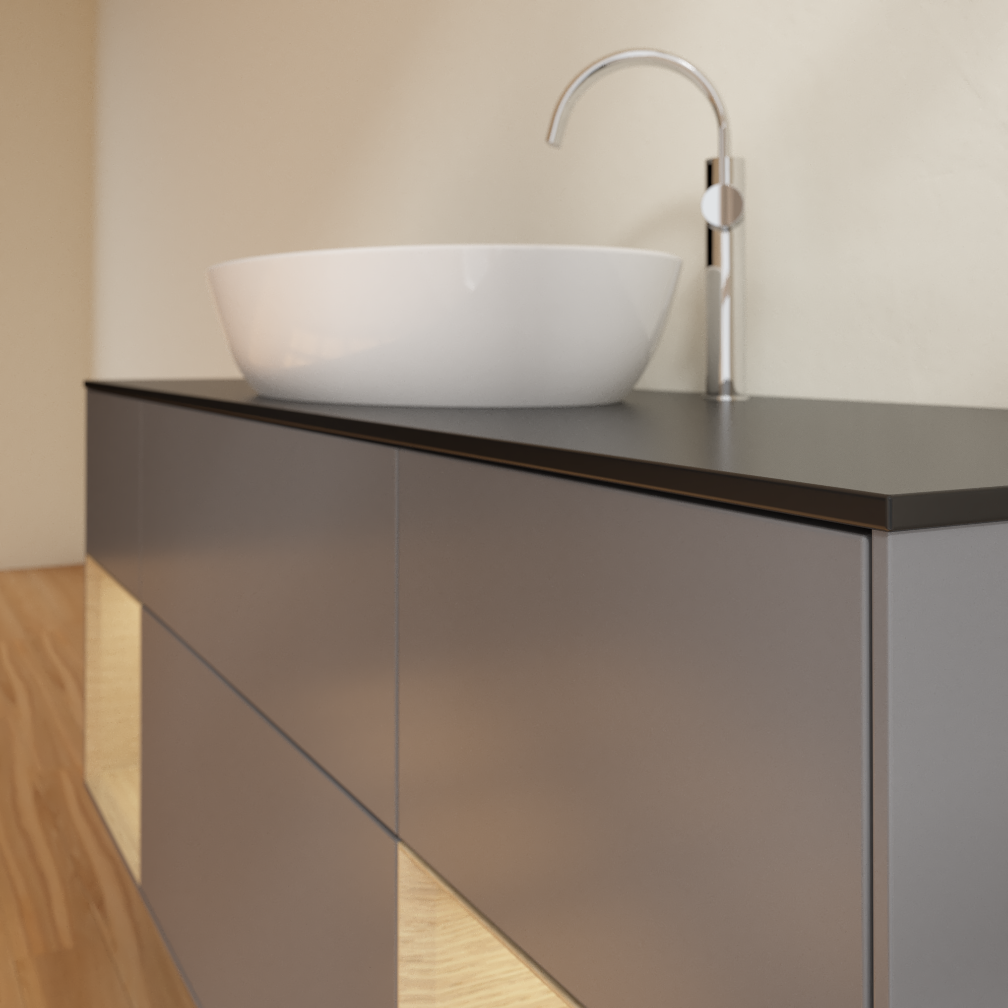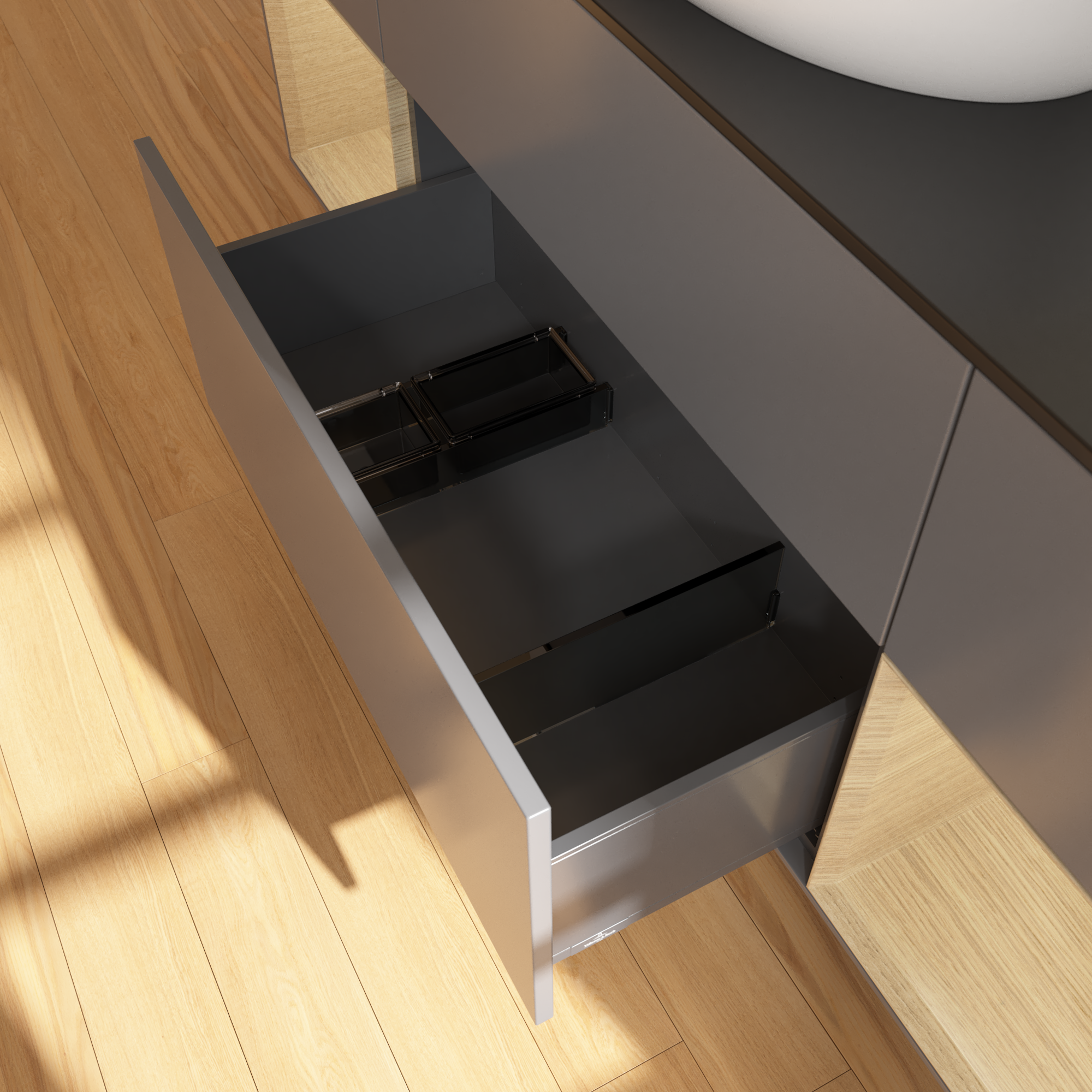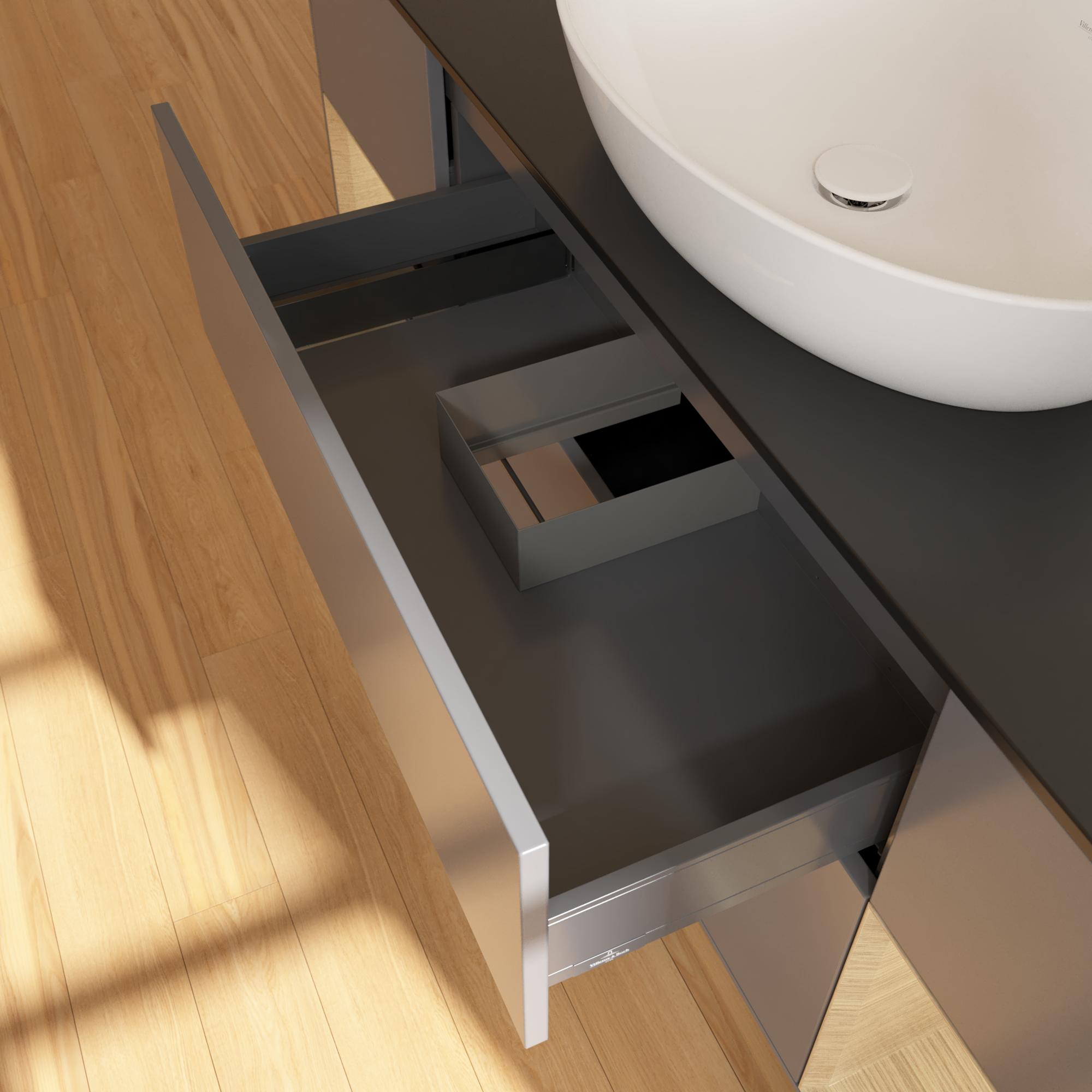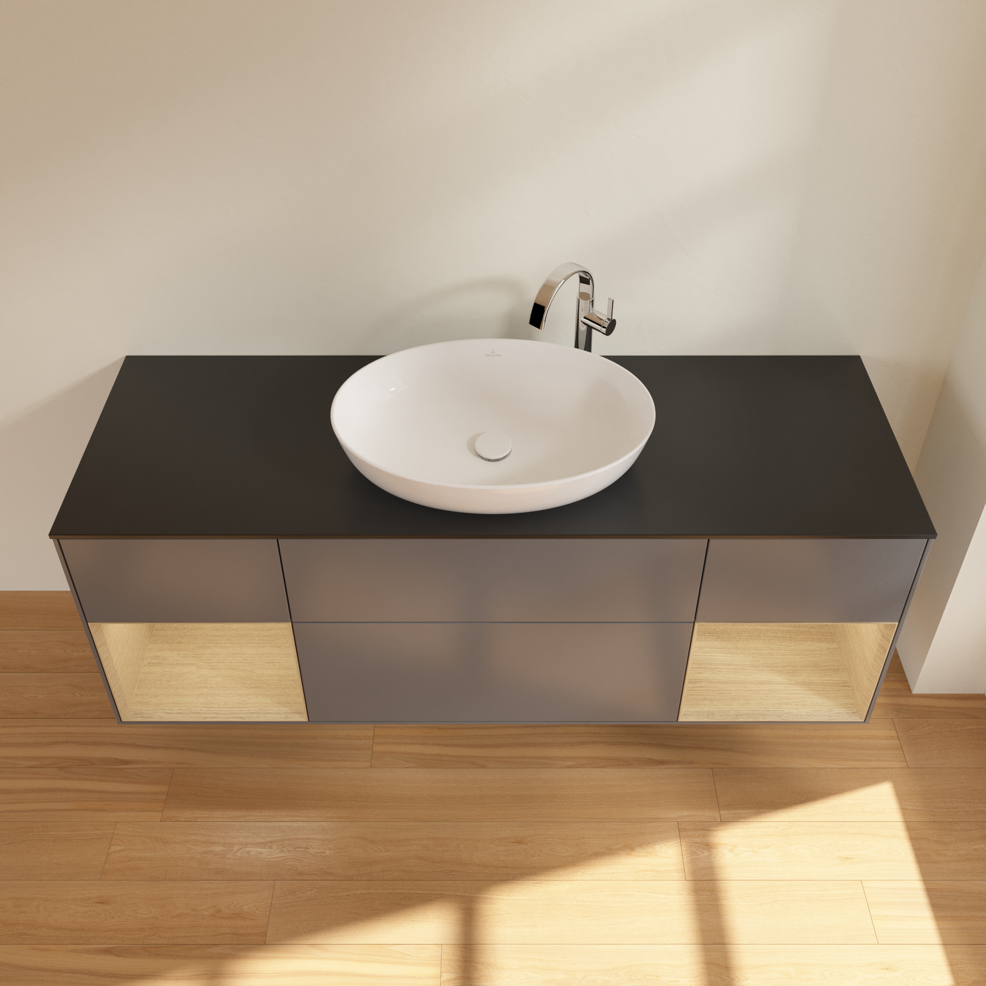 Finion Vanity unit, with lighting, 4 pull-out compartments, 1600x603x501mm, Body: Anthracite Matt Lacquer, Front: Anthracite Matt Lacquer, Shelf: Oak Veneer, Cover plate: Glass Black Matt