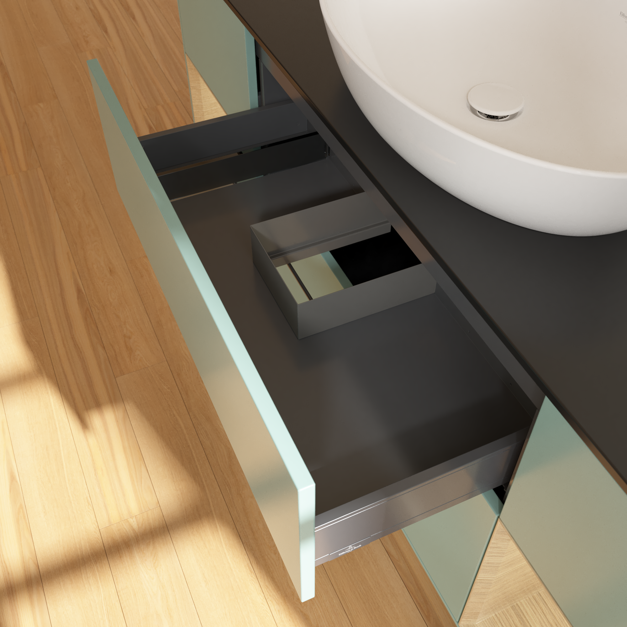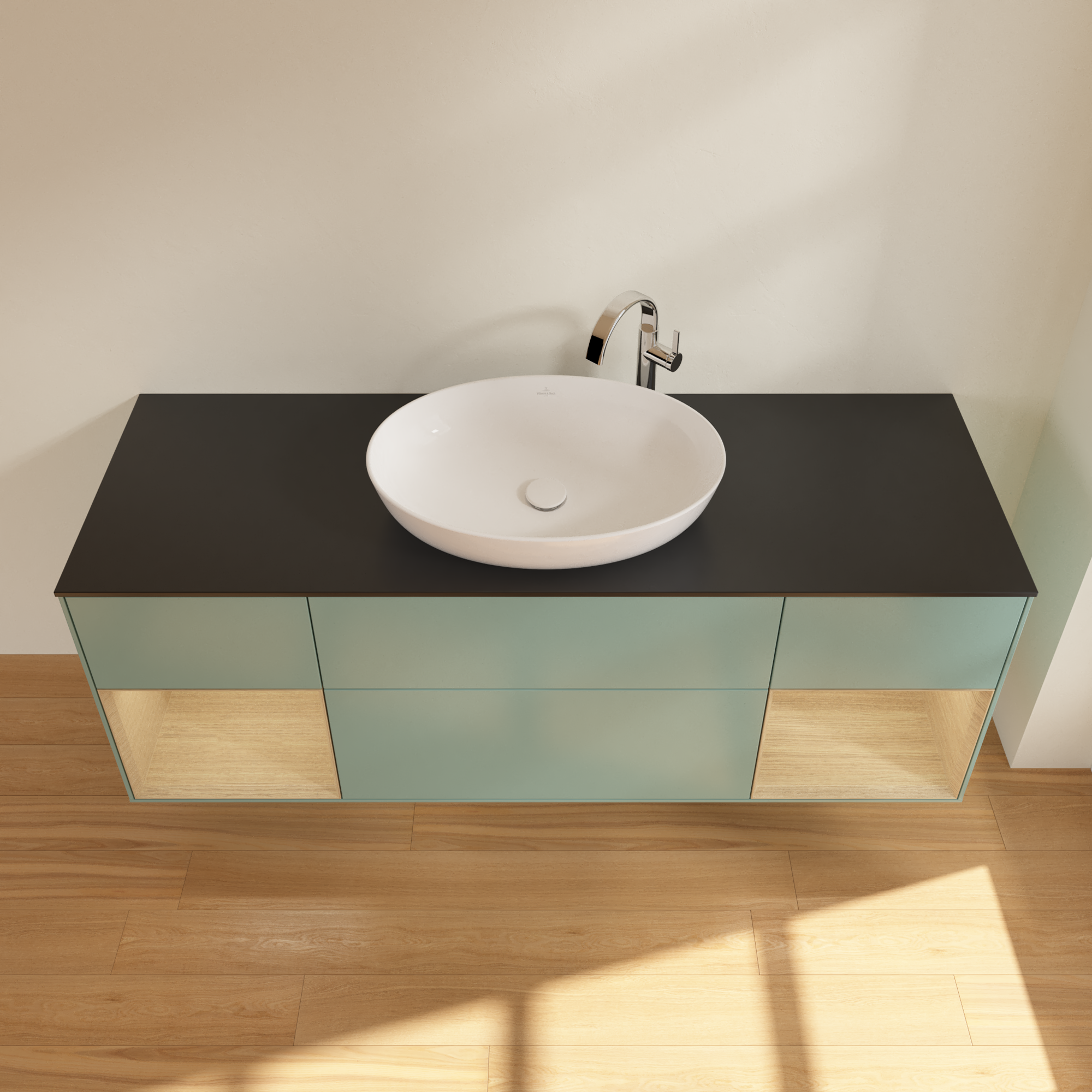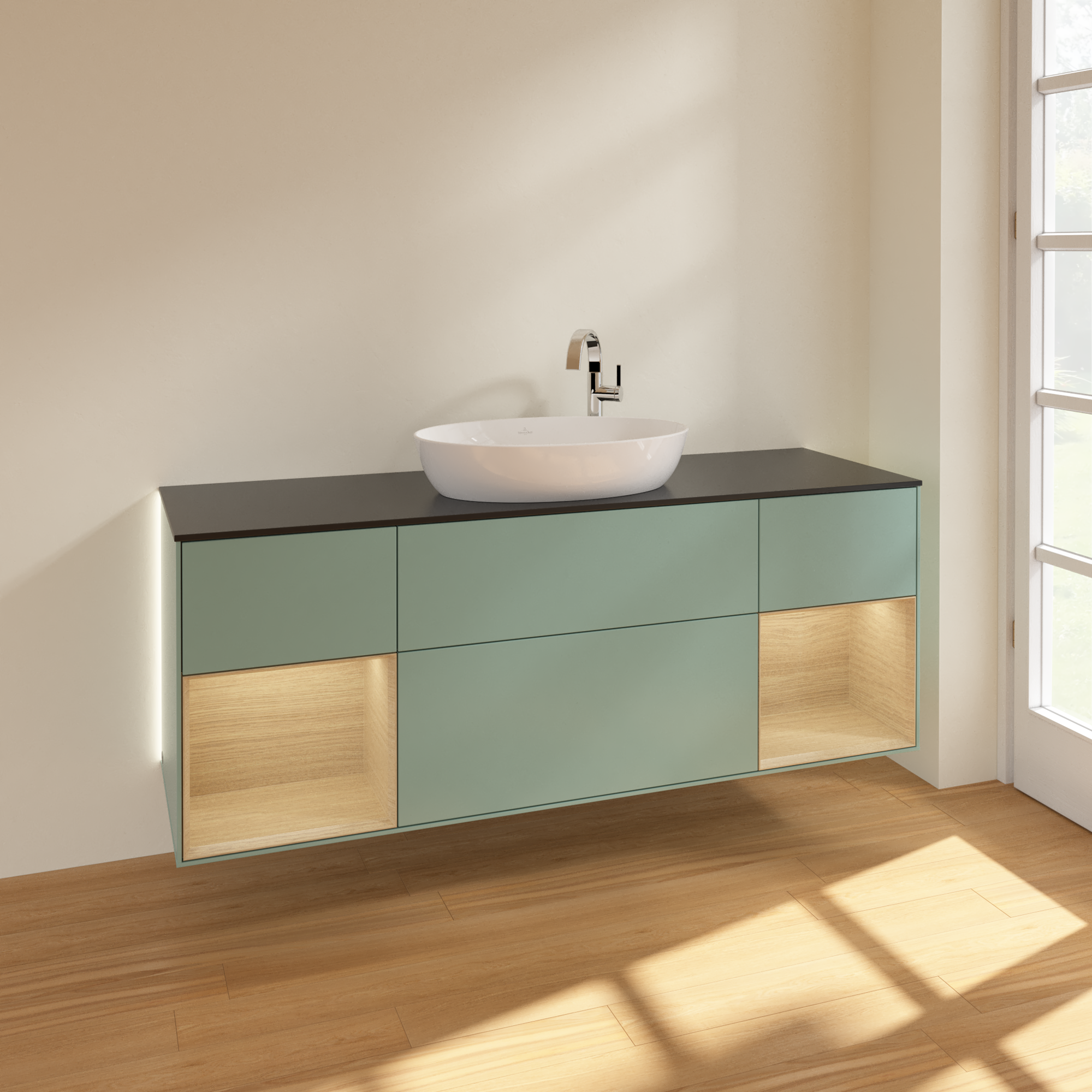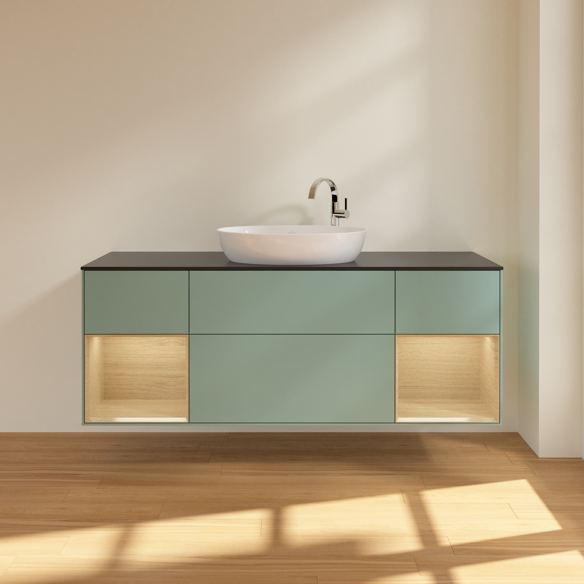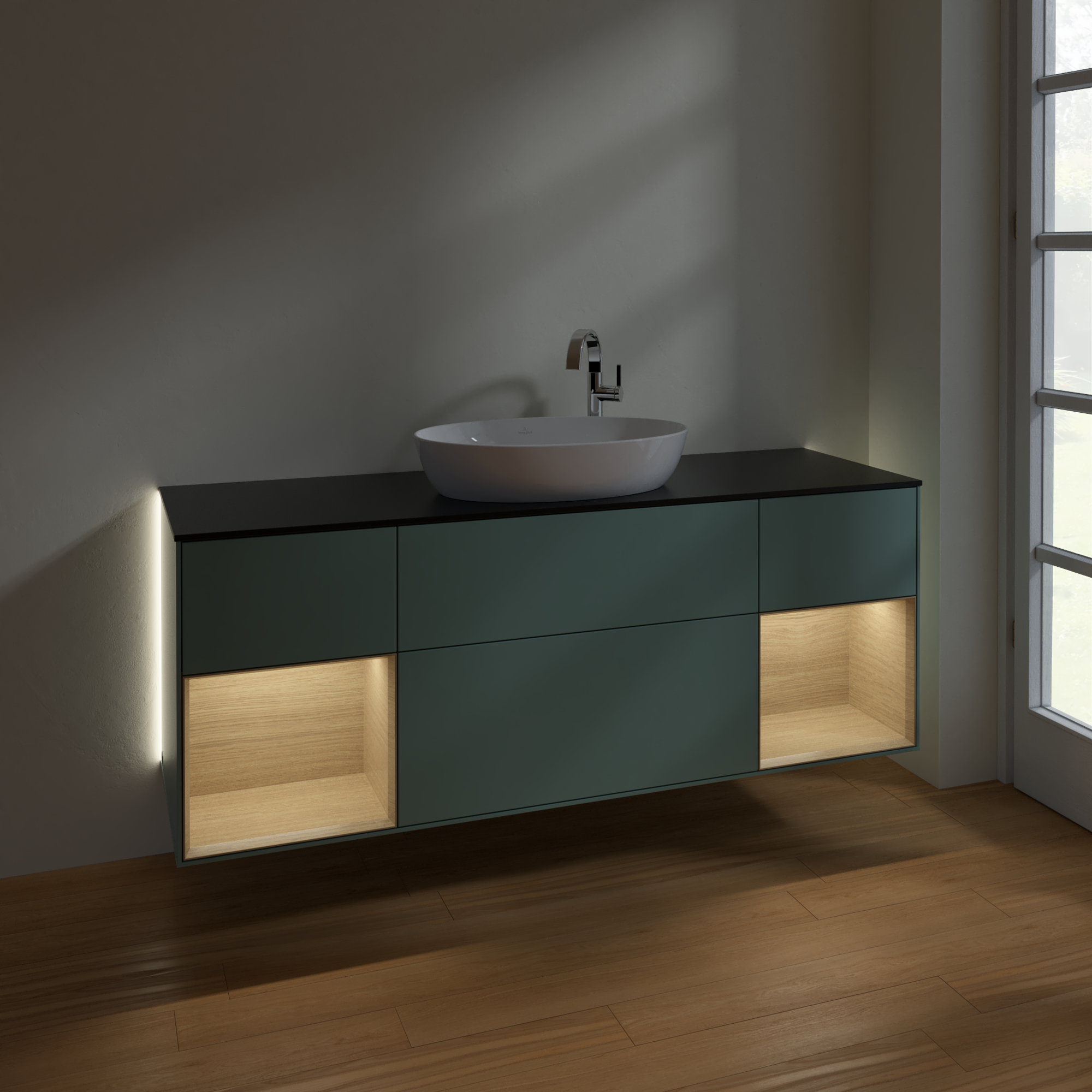 Finion Vanity unit, with lighting, 4 pull-out compartments, 1600x603x501mm, Body: Olive Matt Lacquer, Front: Olive Matt Lacquer, Shelf: Oak Veneer, Cover plate: Glass Black Matt