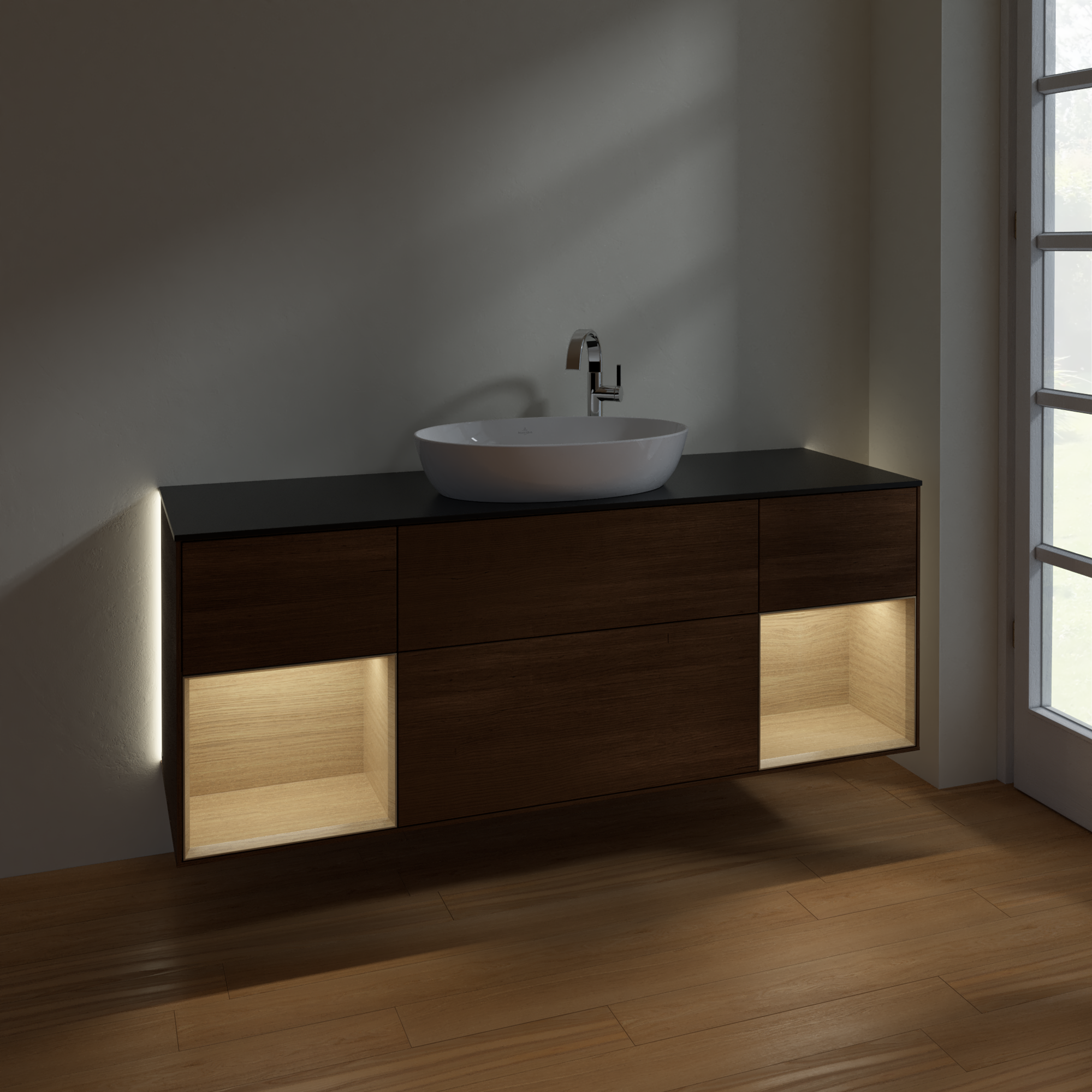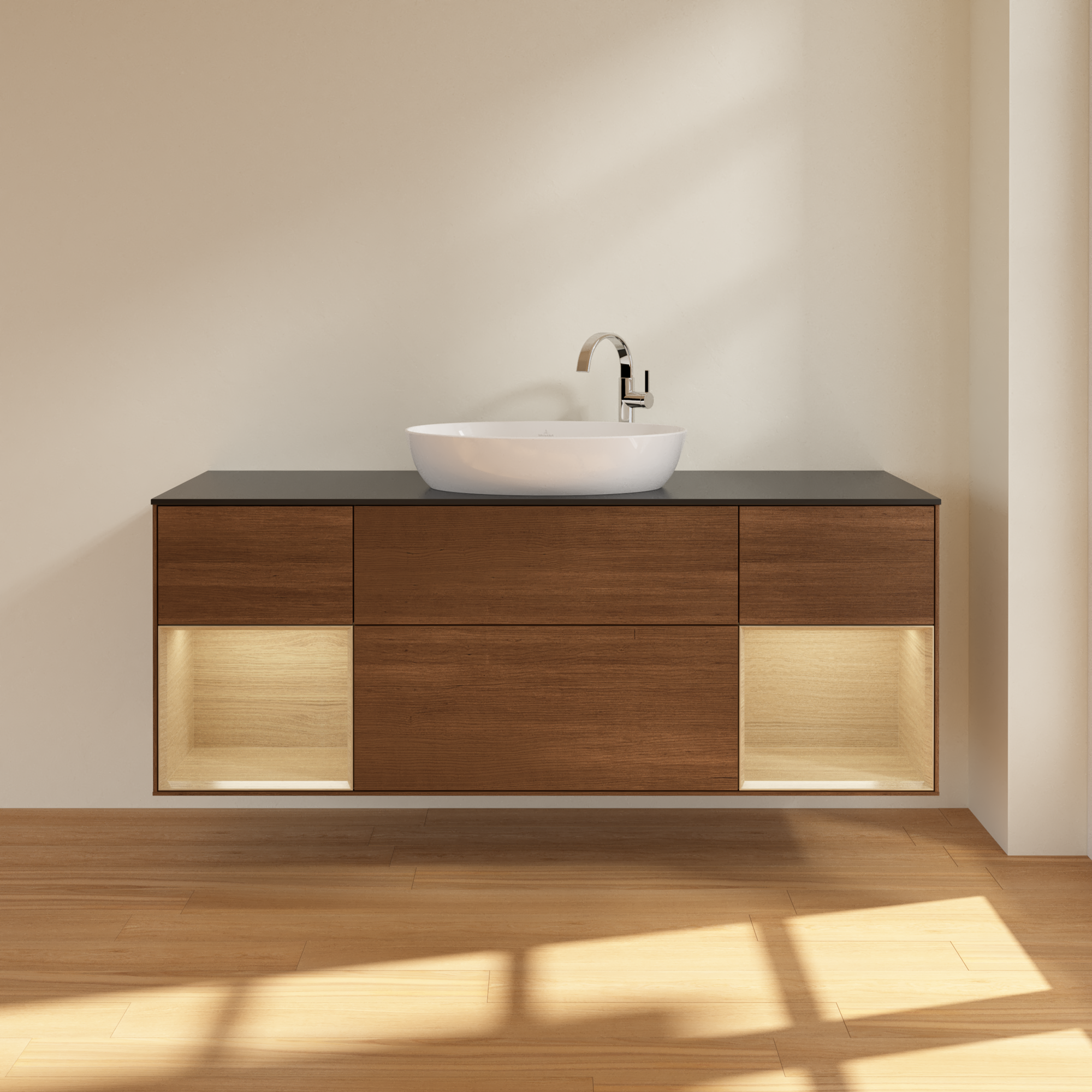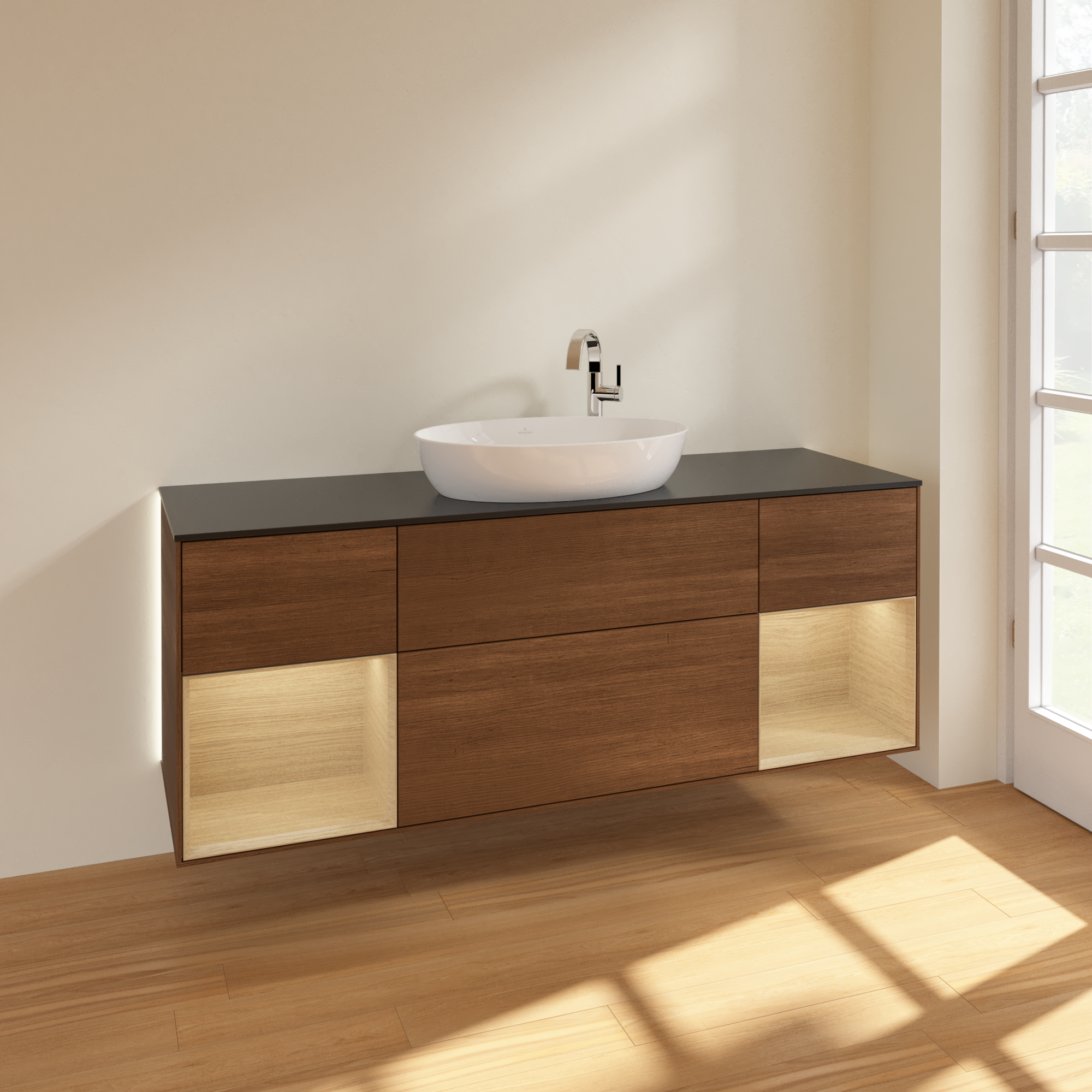Finion Vanity unit, with lighting, 4 pull-out compartments, 1600x603x501mm, Body: Walnut Veneer, Front: Walnut Veneer, Shelf: Oak Veneer, Cover plate: Glass Black Matt
