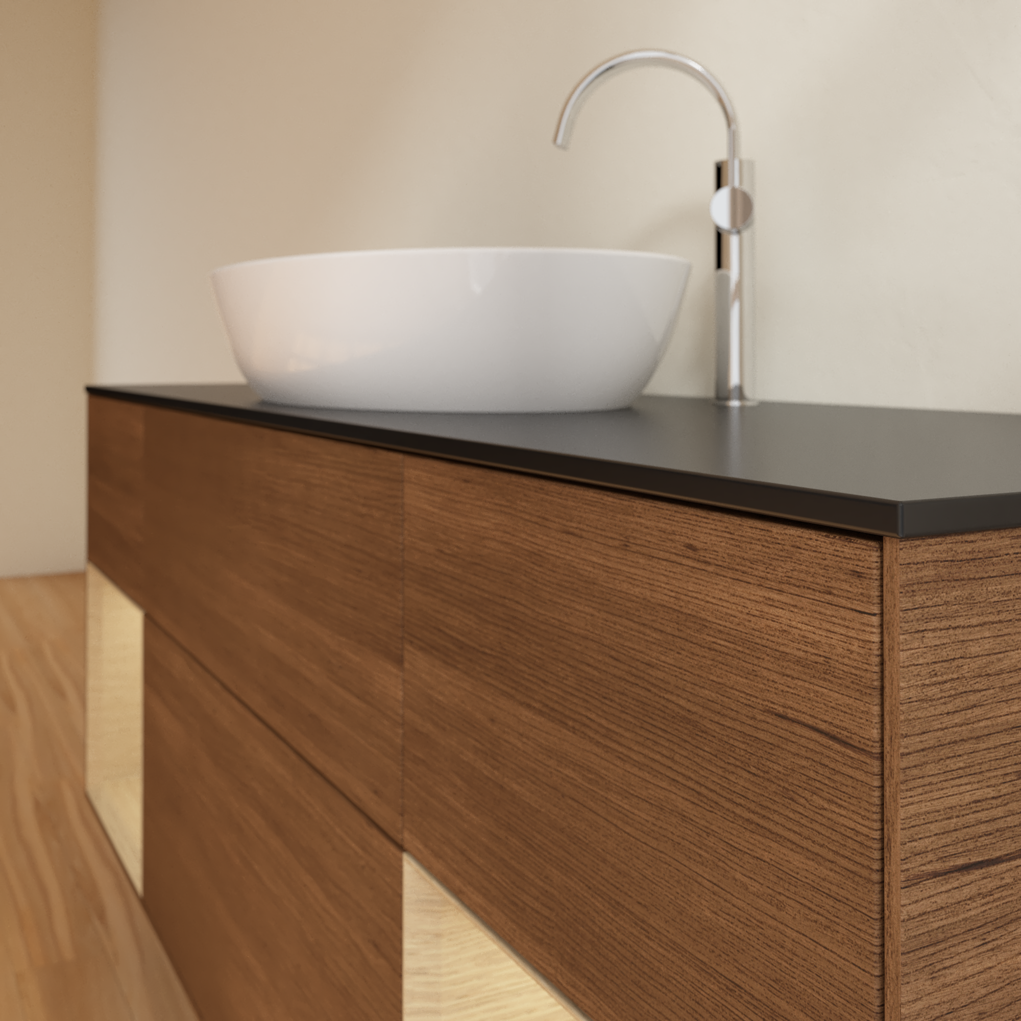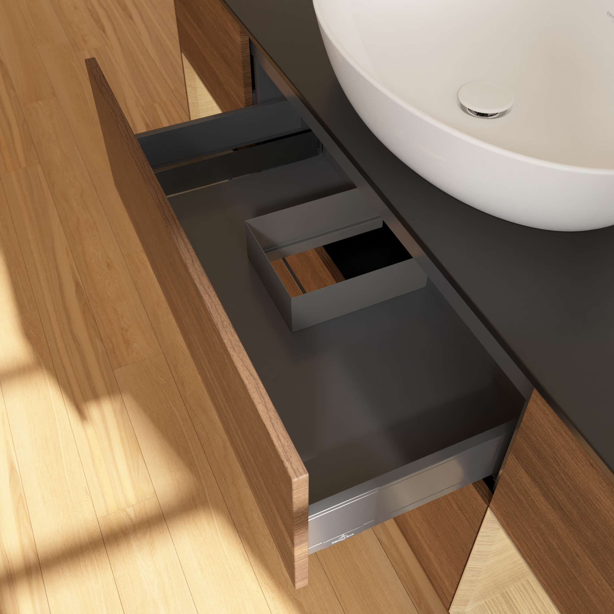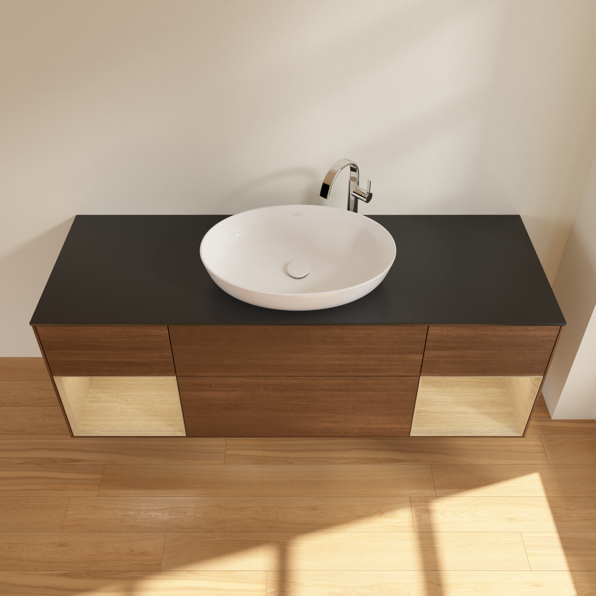Finion Vanity unit, with lighting, 4 pull-out compartments, 1600x603x501mm, Body: Walnut Veneer, Front: Walnut Veneer, Shelf: Oak Veneer, Cover plate: Glass Black Matt