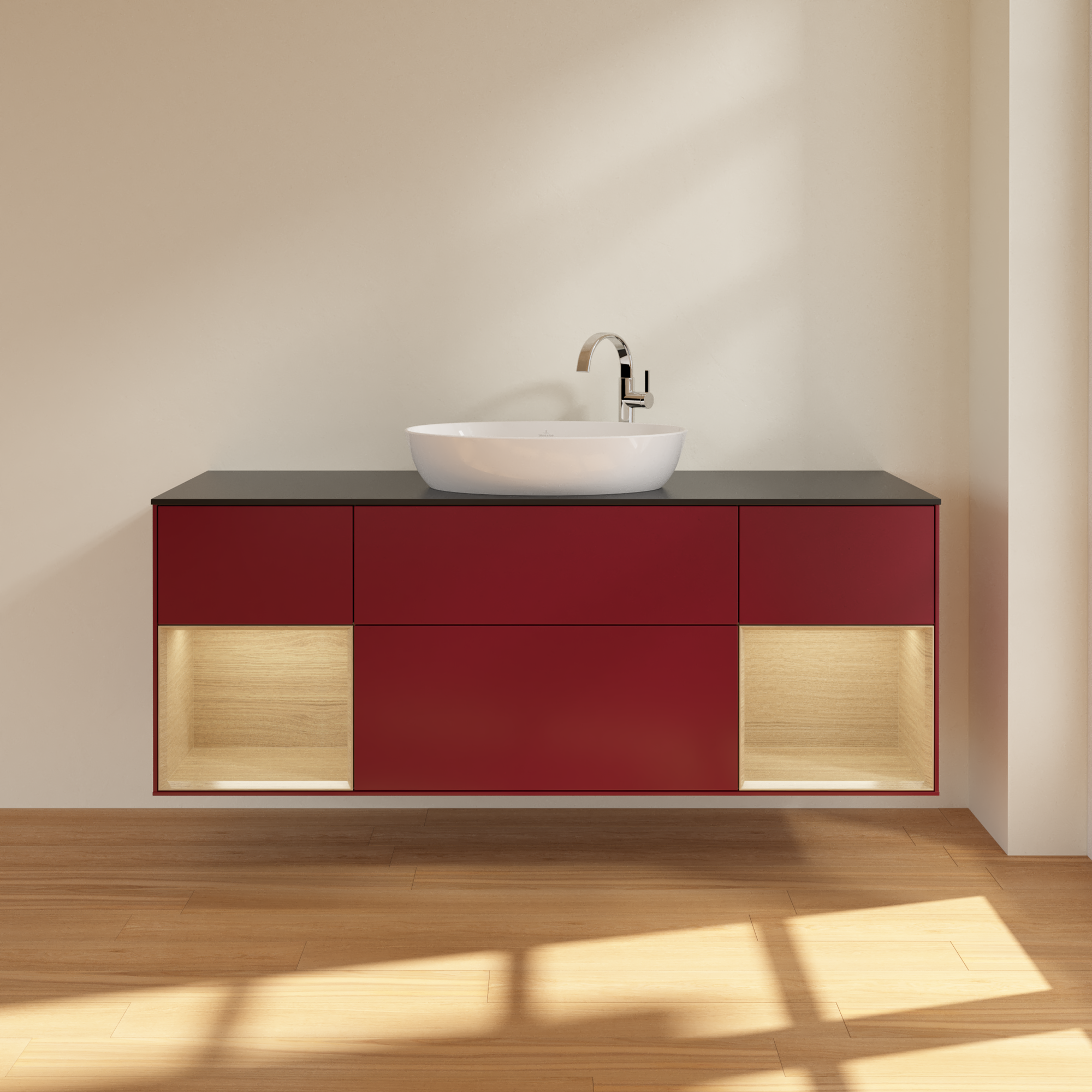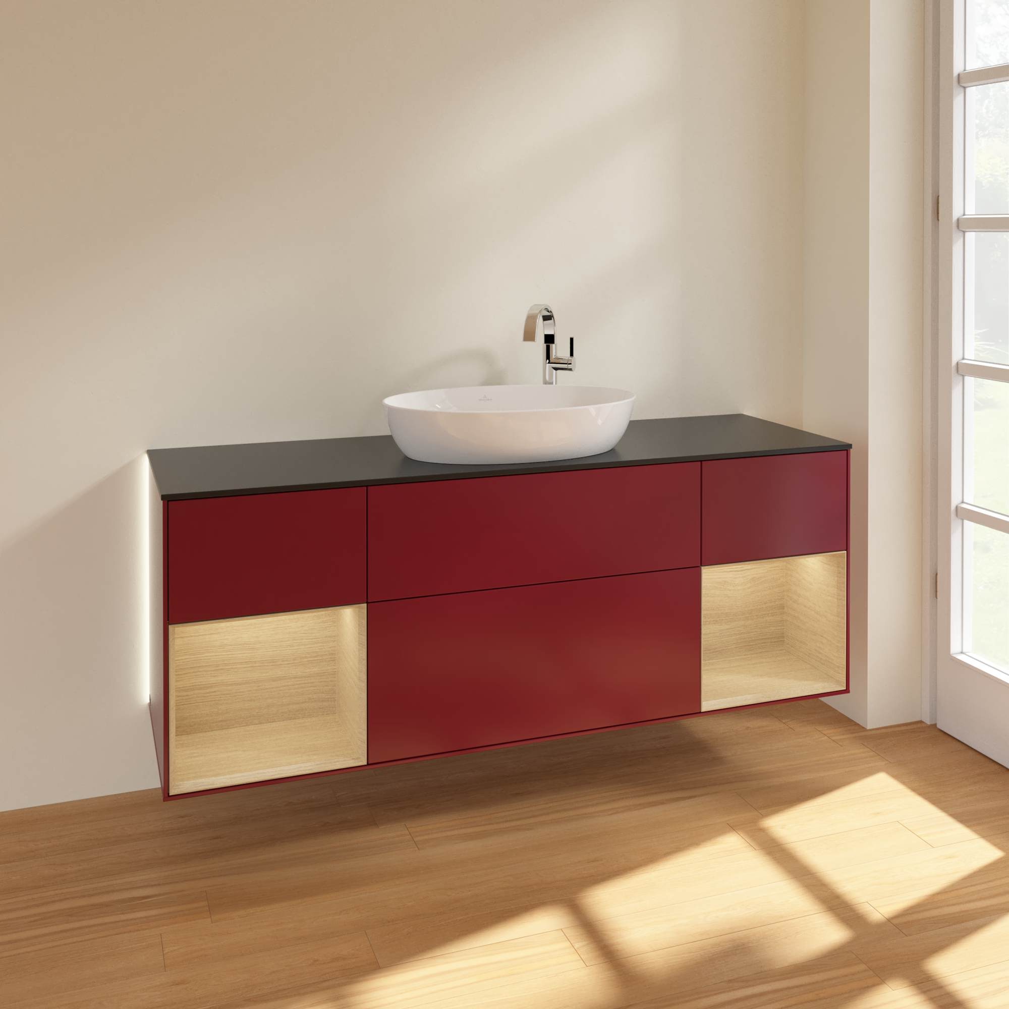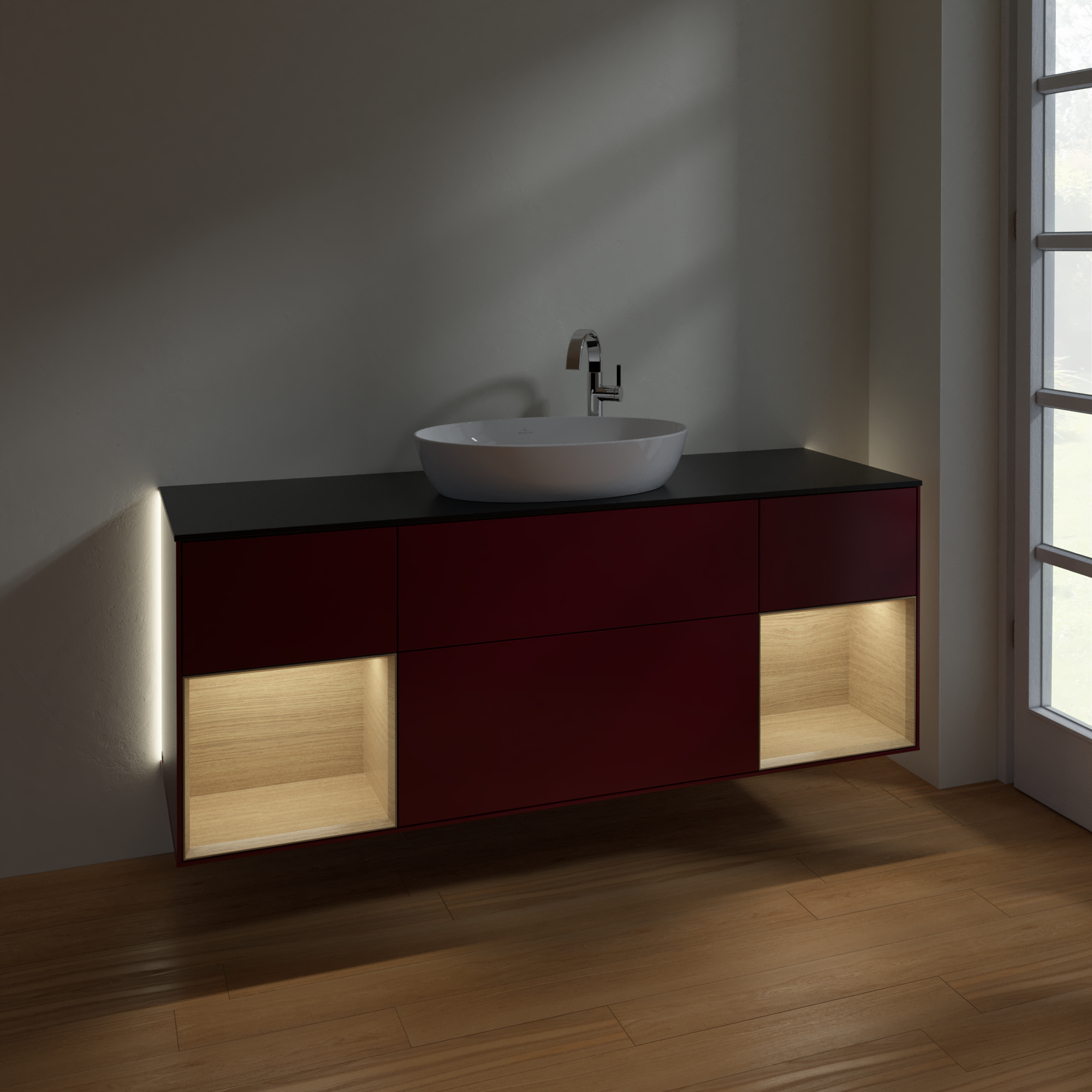 Finion Vanity unit, with lighting, 4 pull-out compartments, 1600x603x501mm, Body: Peony Matt Lacquer, Front: Peony Matt Lacquer, Shelf: Oak Veneer, Cover plate: Glass Black Matt