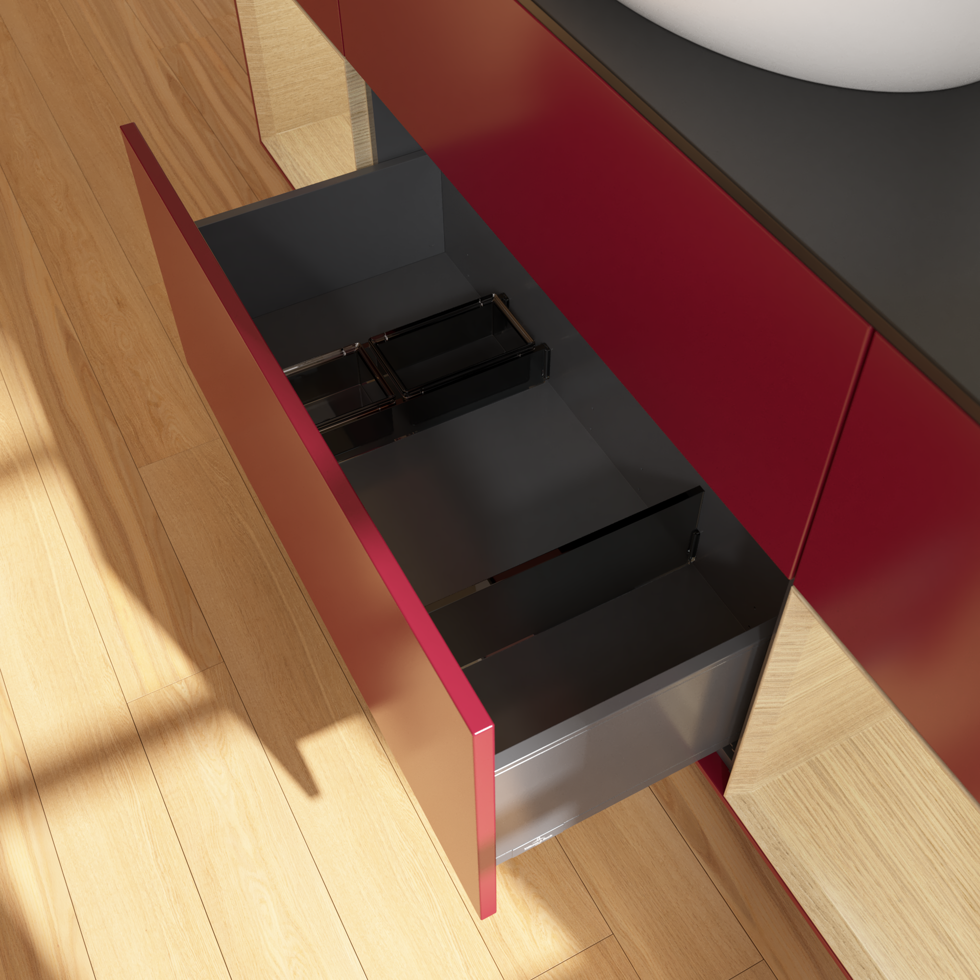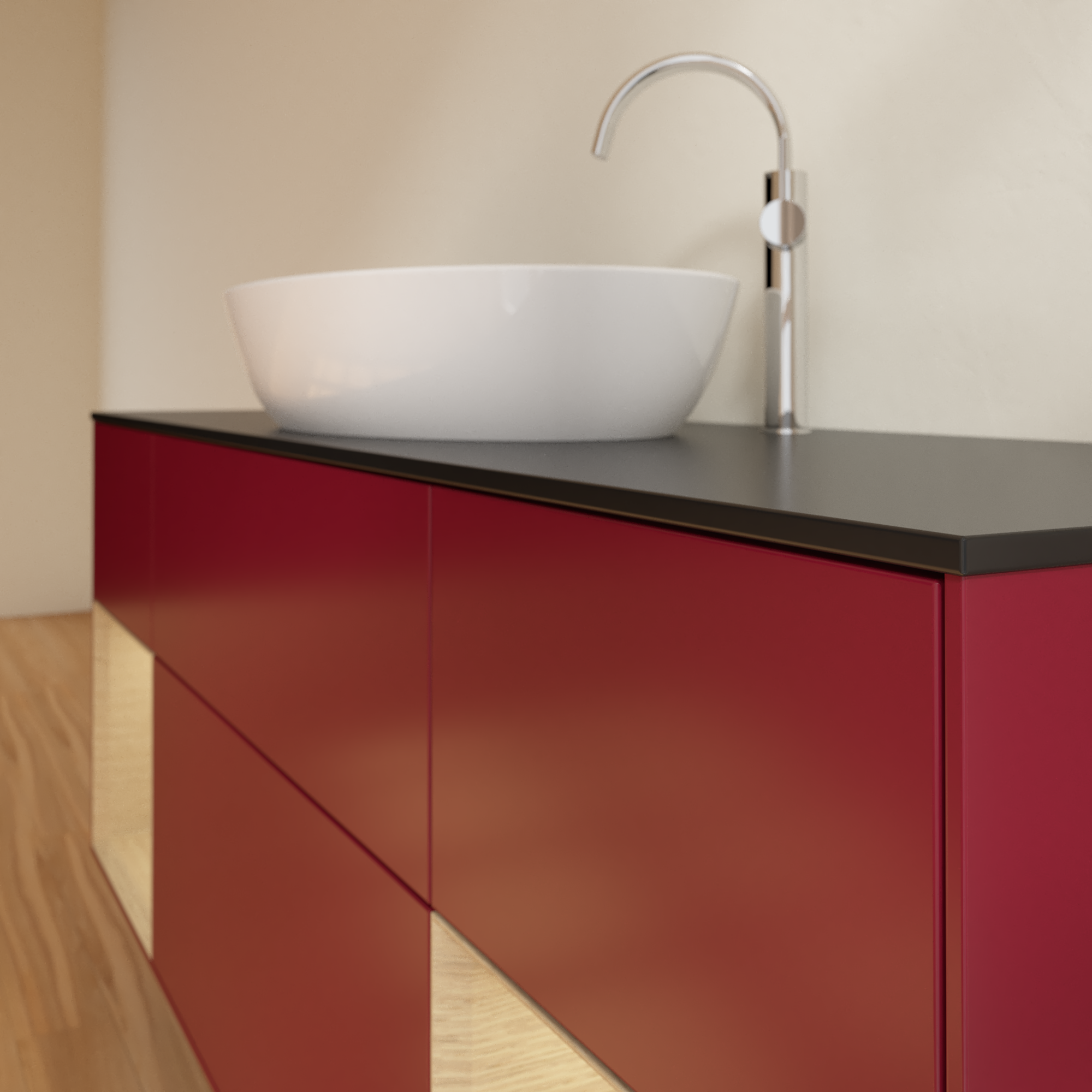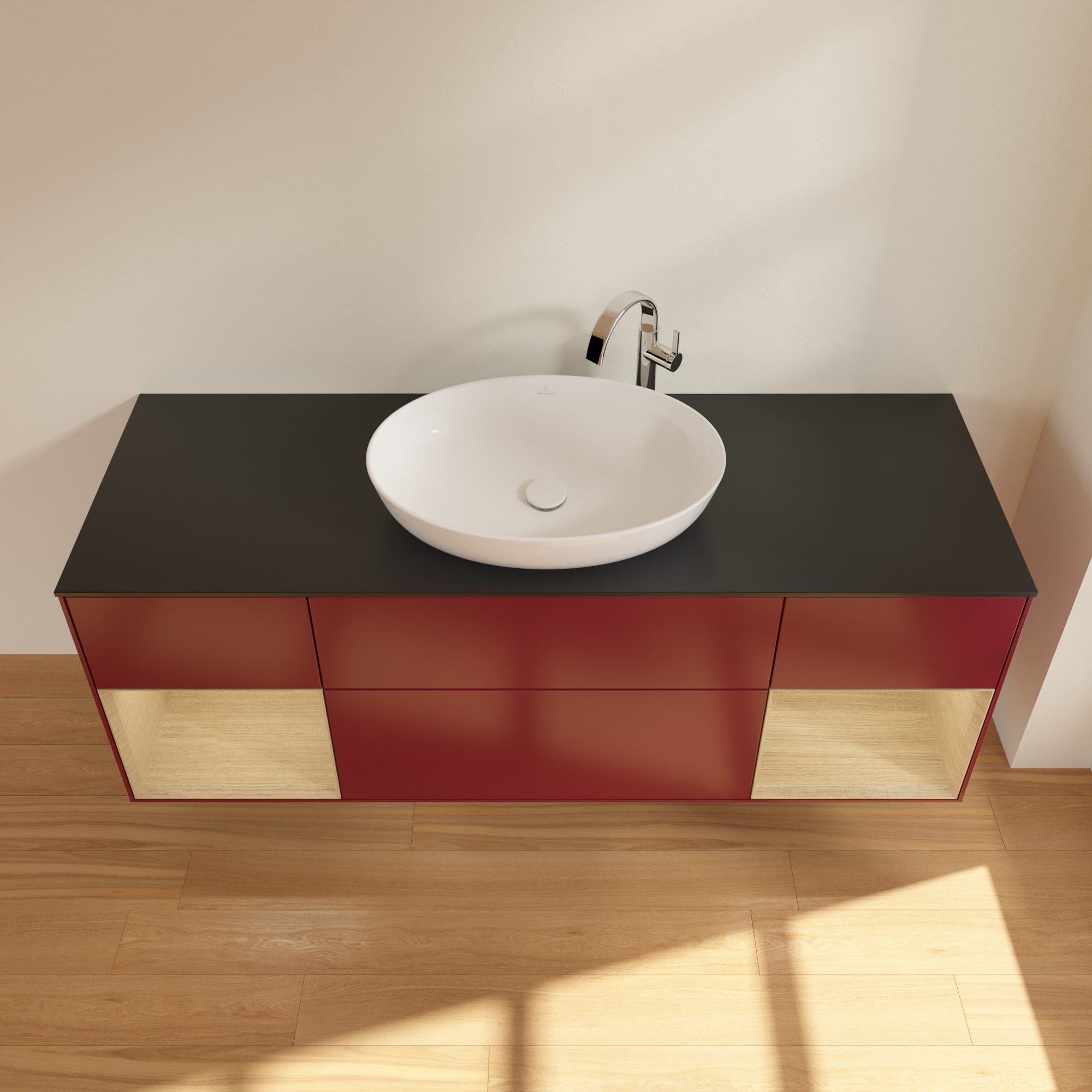 Finion Vanity unit, with lighting, 4 pull-out compartments, 1600x603x501mm, Body: Peony Matt Lacquer, Front: Peony Matt Lacquer, Shelf: Oak Veneer, Cover plate: Glass Black Matt