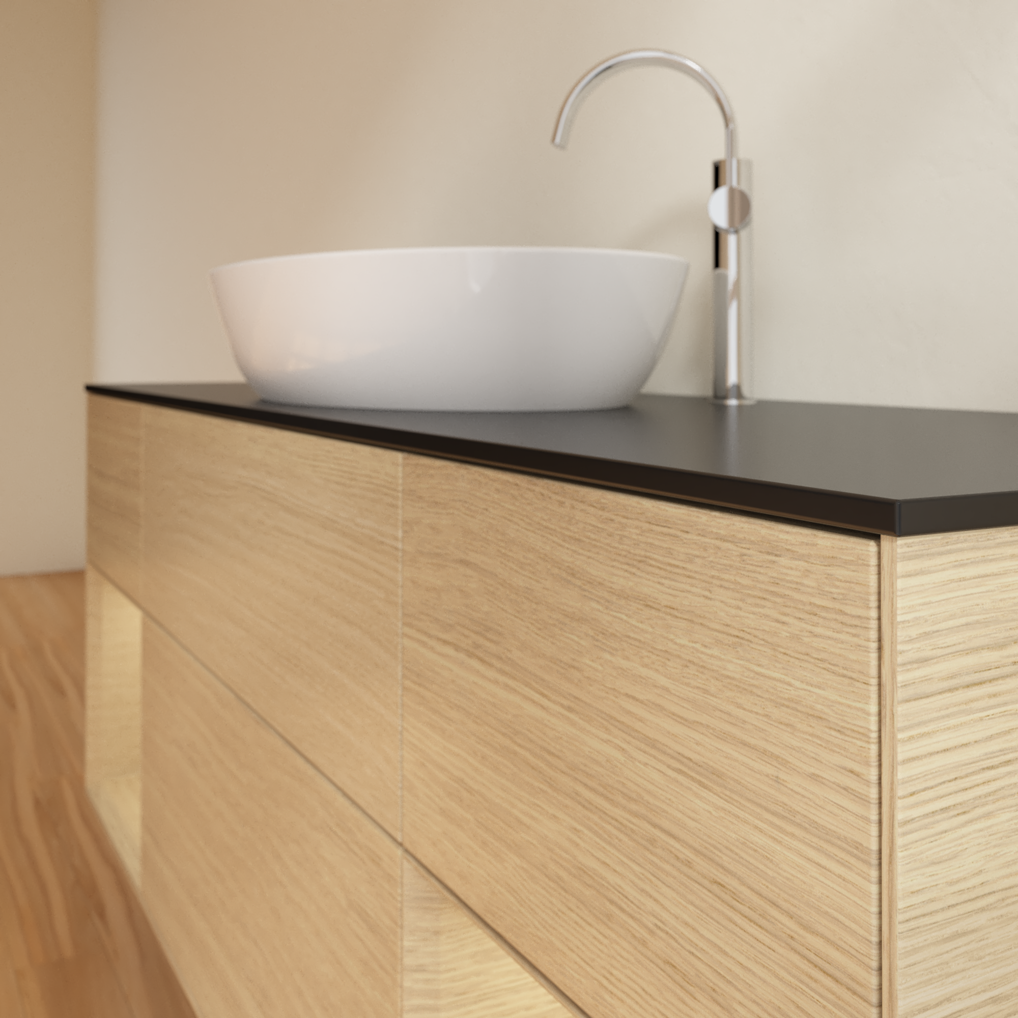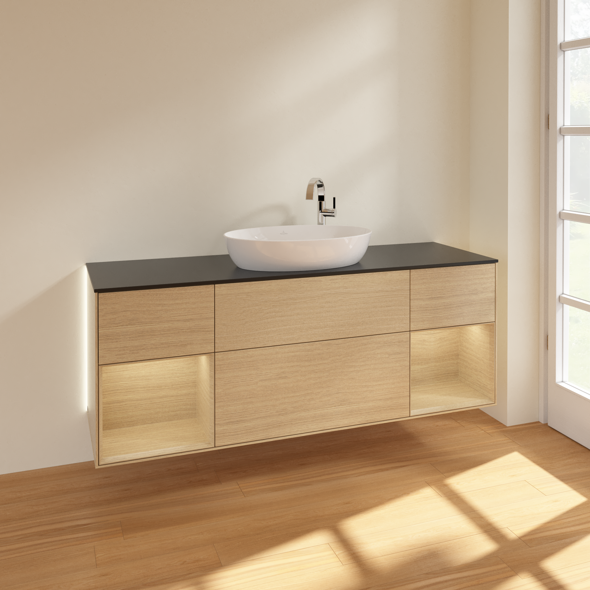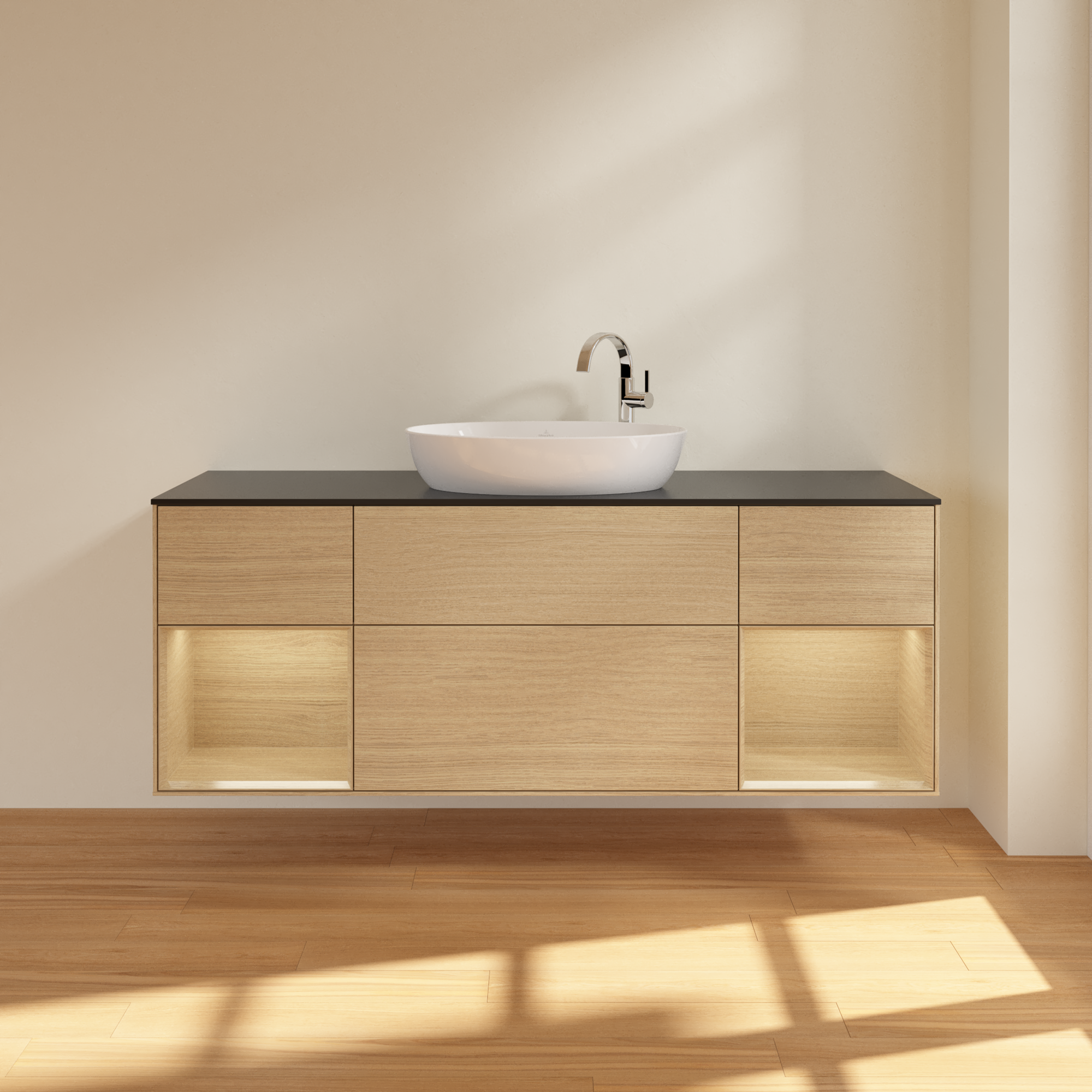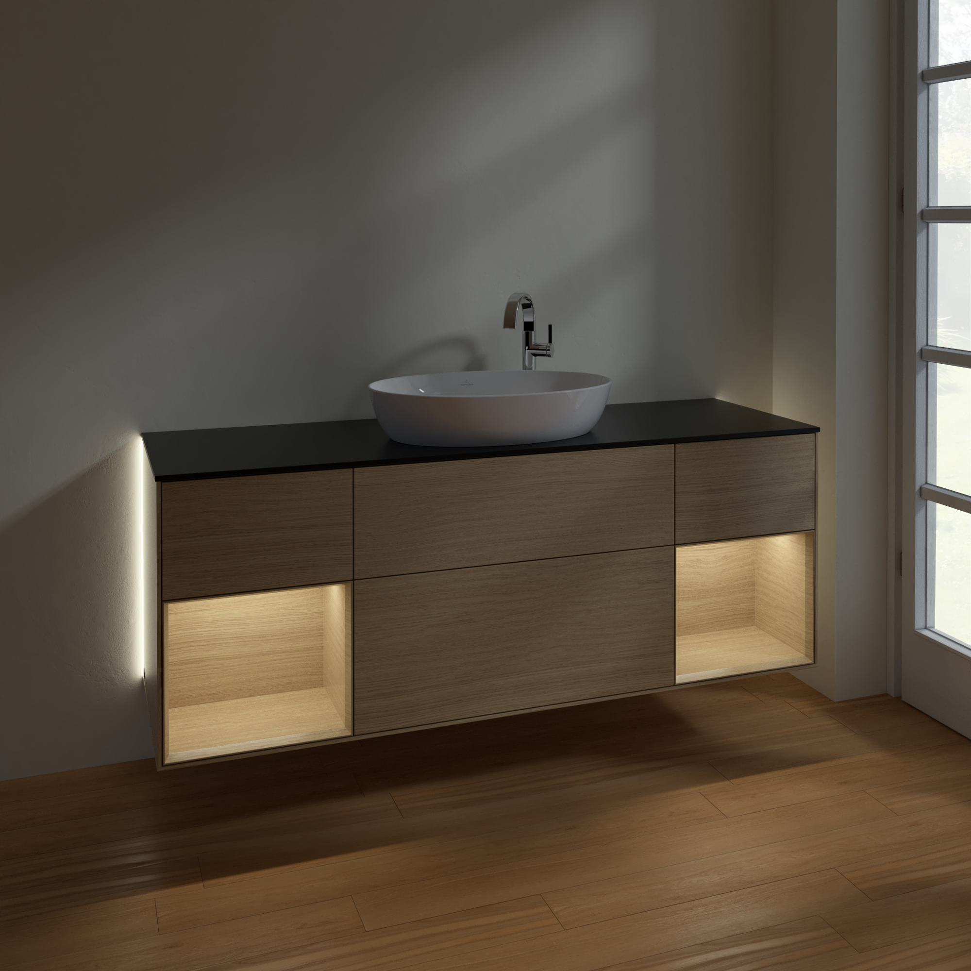 Finion Vanity unit, with lighting, 4 pull-out compartments, 1600x603x501mm, Body: Oak Veneer, Front: Oak Veneer, Shelf: Oak Veneer, Cover plate: Glass Black Matt