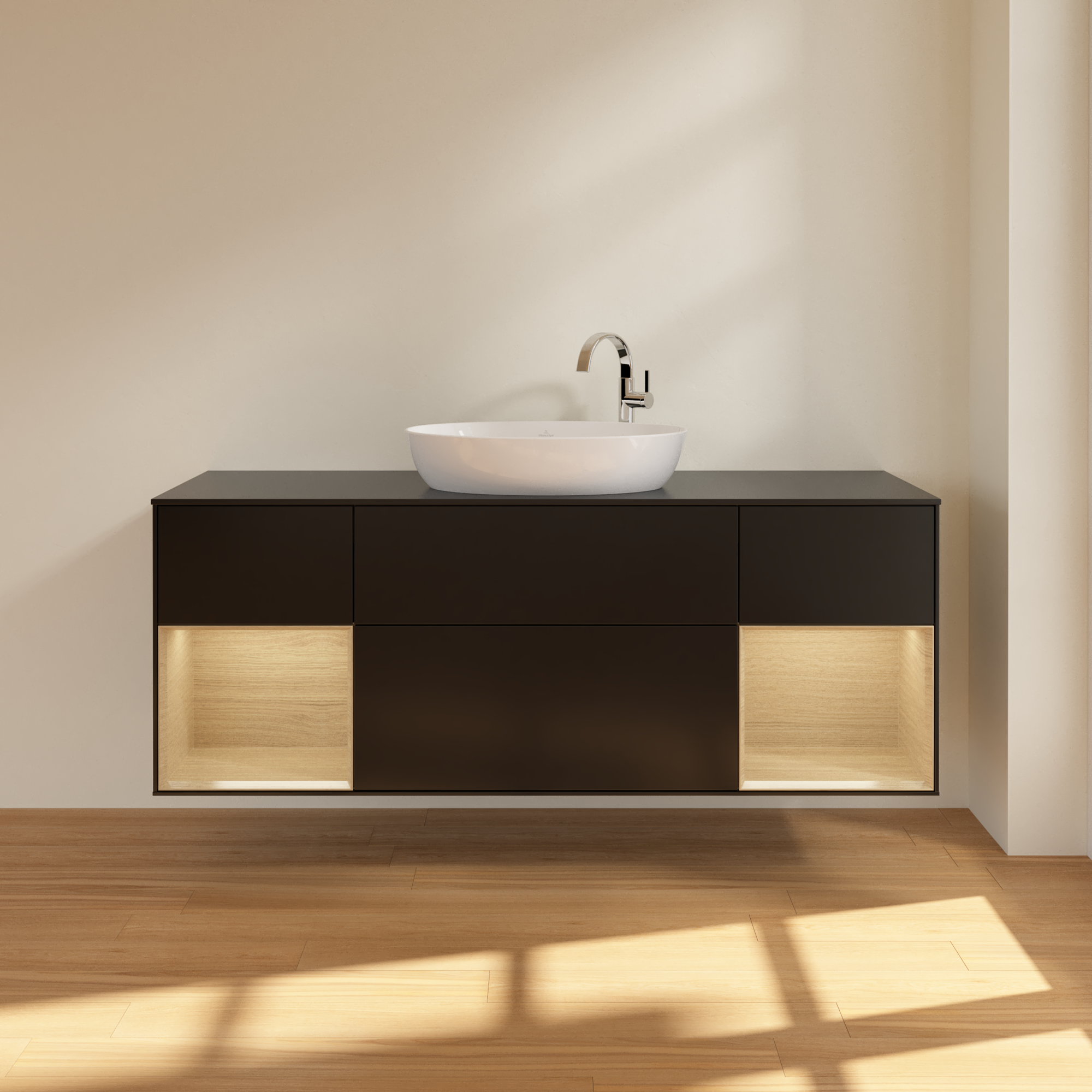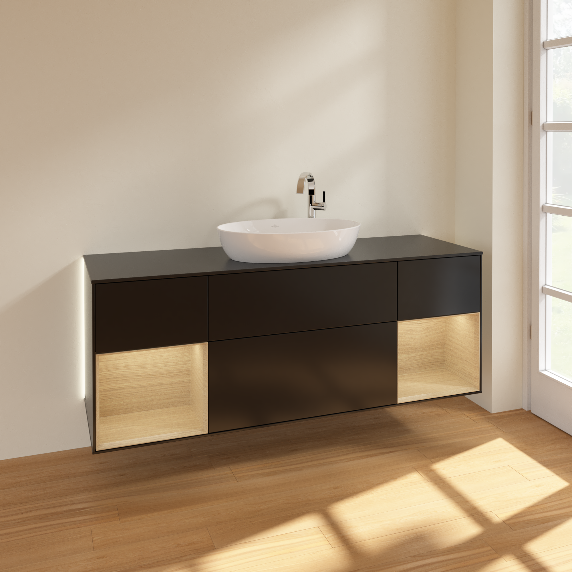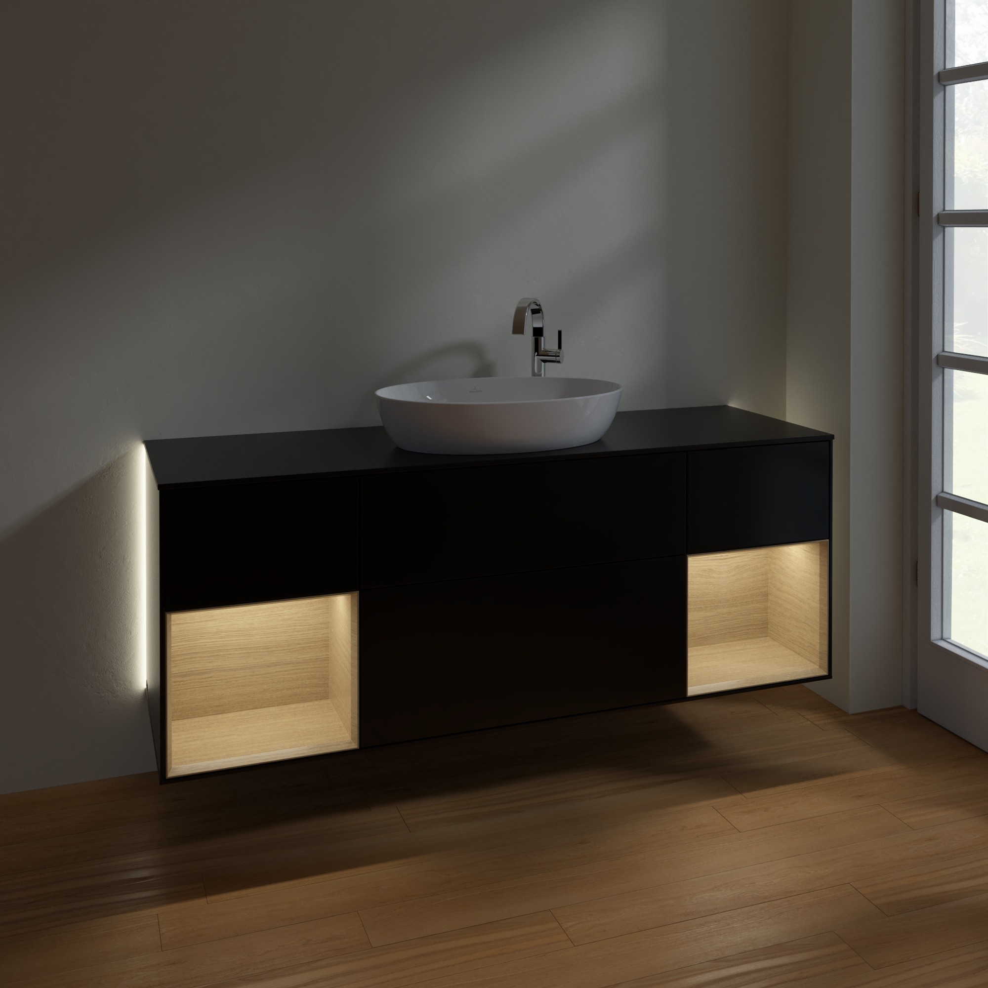 Finion Vanity unit, with lighting, 4 pull-out compartments, 1600x603x501mm, Body: Black Matt Lacquer, Front: Black Matt Lacquer, Shelf: Oak Veneer, Cover plate: Glass Black Matt