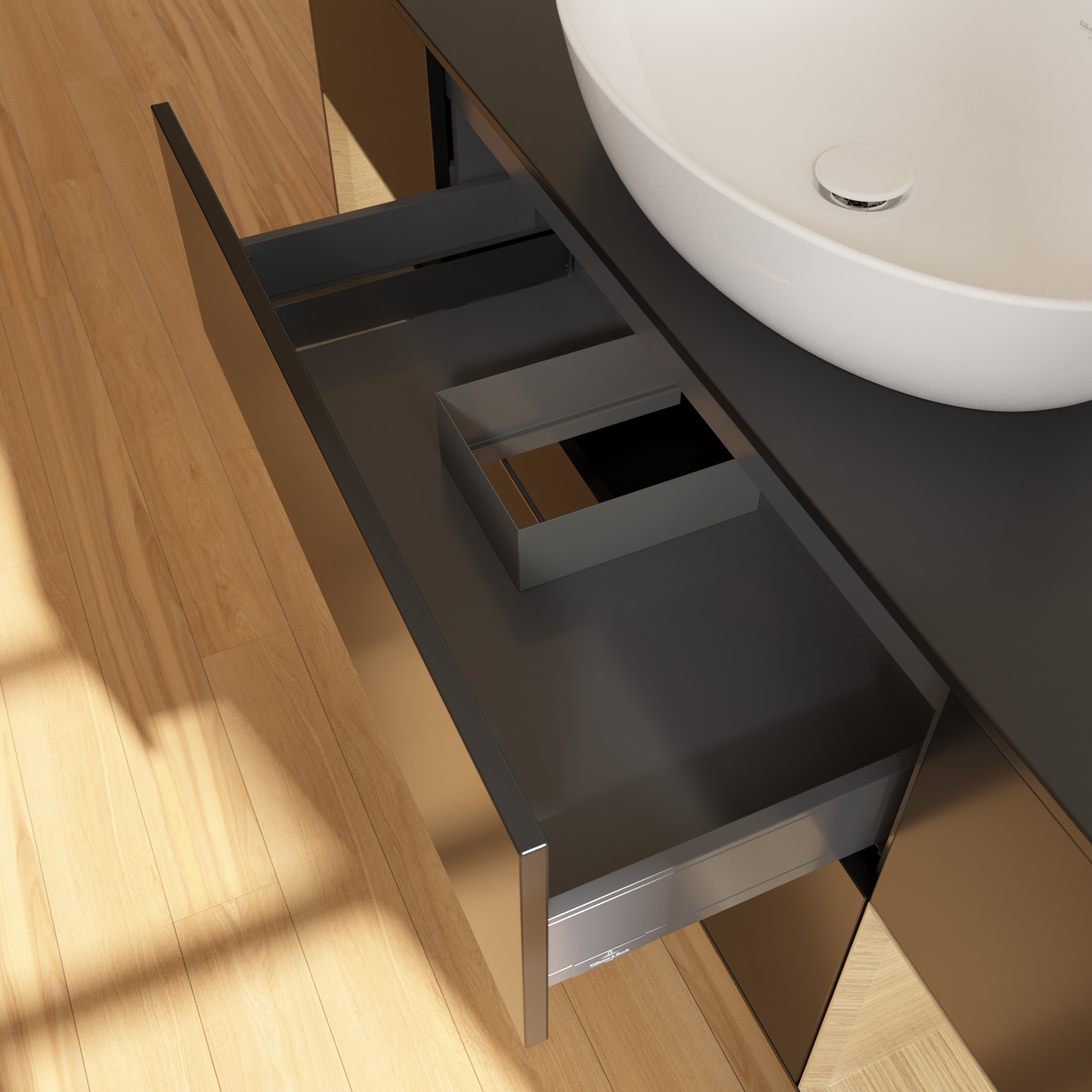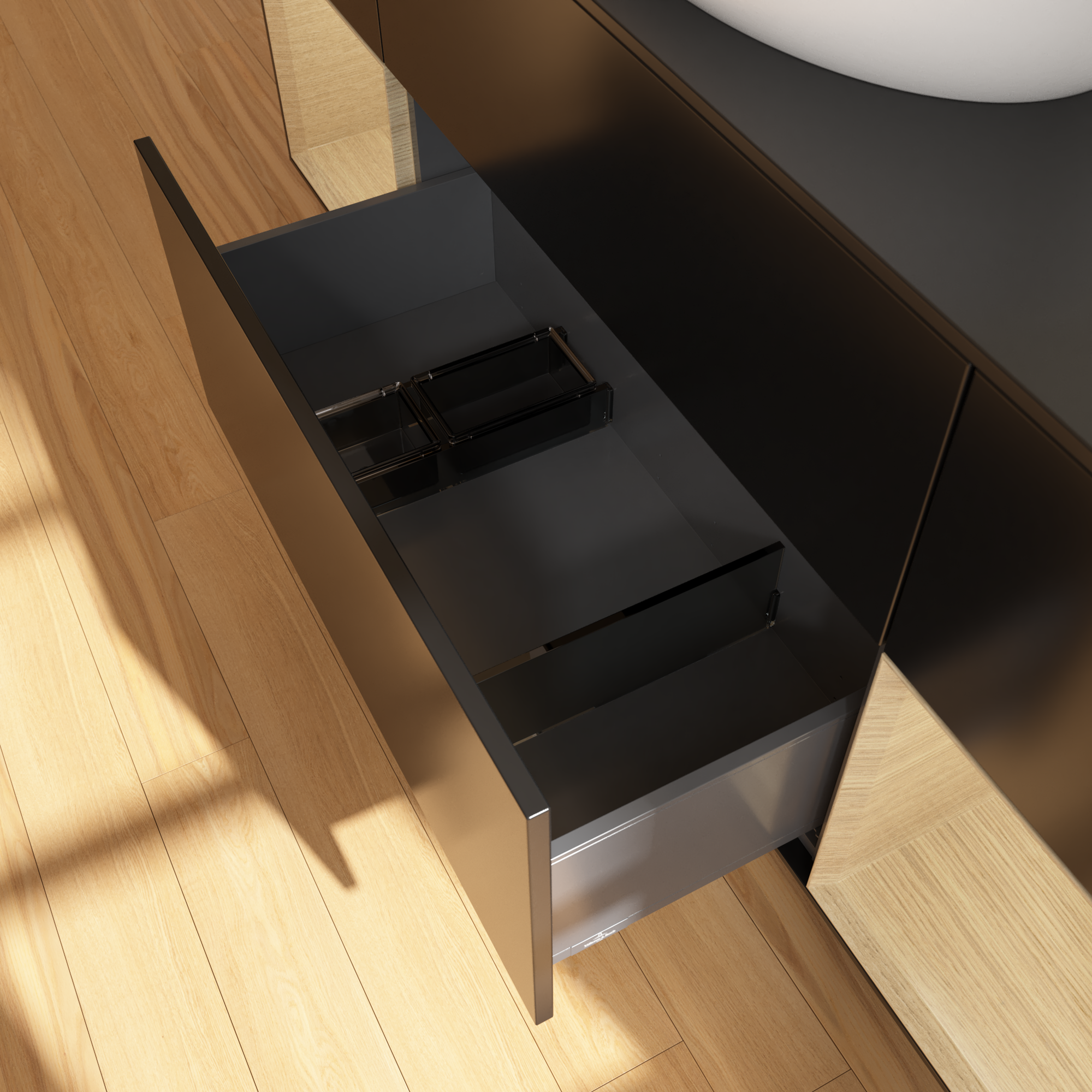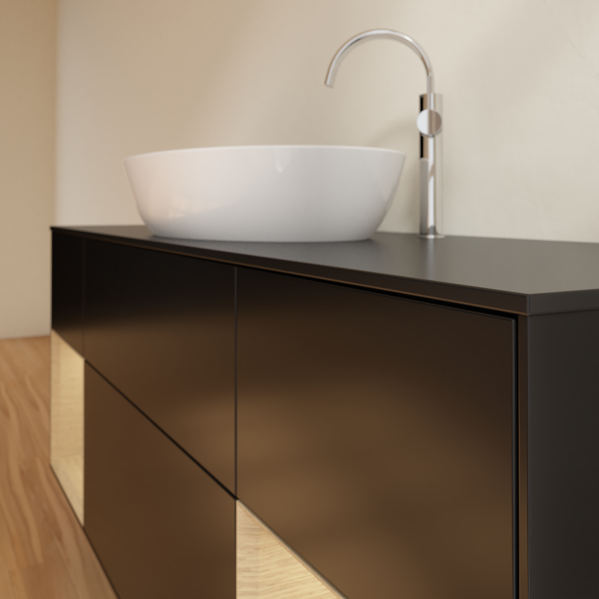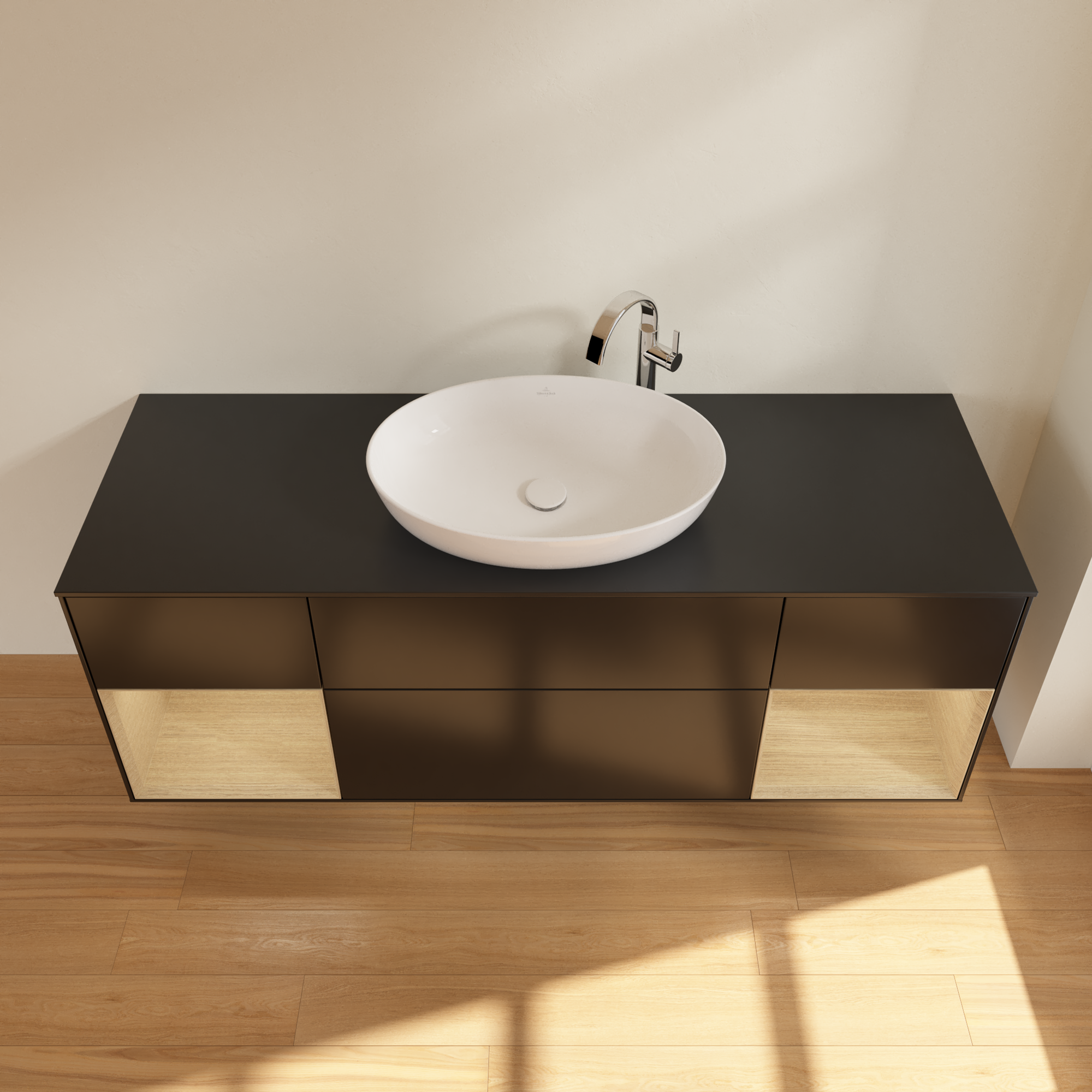 Finion Vanity unit, with lighting, 4 pull-out compartments, 1600x603x501mm, Body: Black Matt Lacquer, Front: Black Matt Lacquer, Shelf: Oak Veneer, Cover plate: Glass Black Matt
