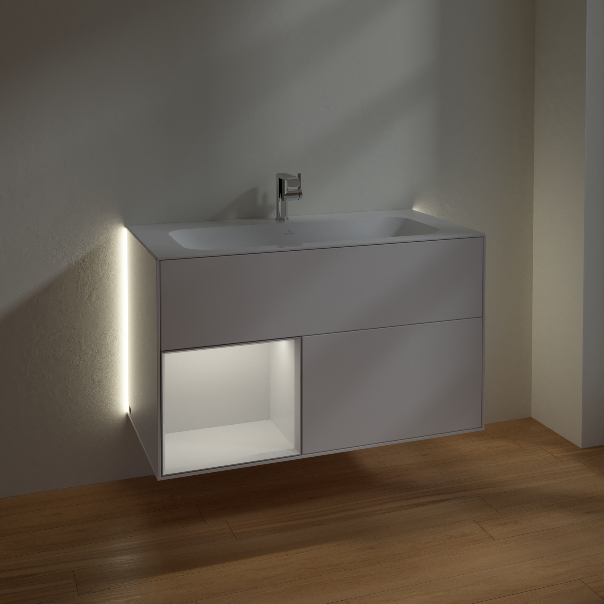 Finion Vanity unit, with lighting, 2 pull-out compartments, 996x591x498mm, Body: White Matt Lacquer, Front: White Matt Lacquer, Shelf: Glossy White Lacquer
