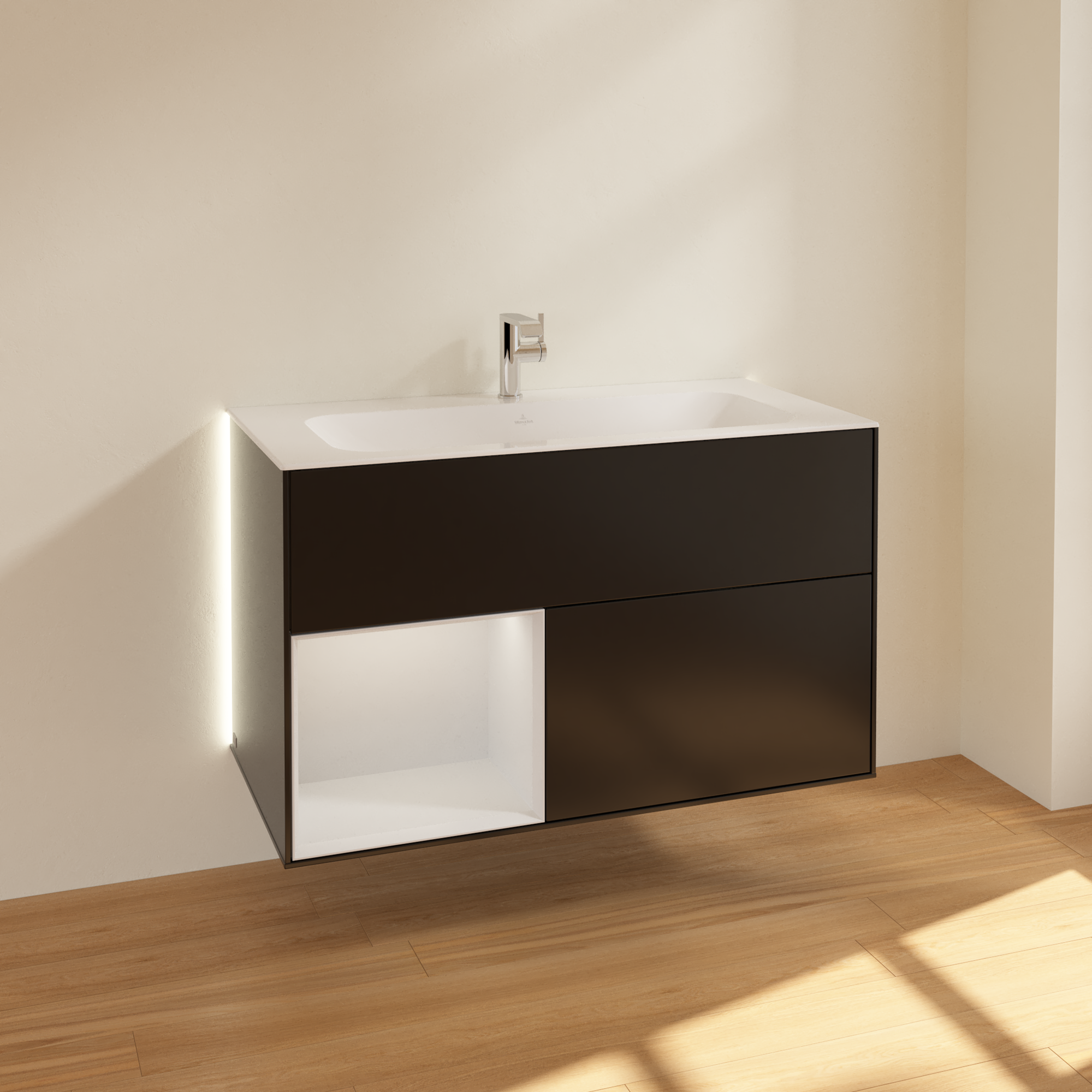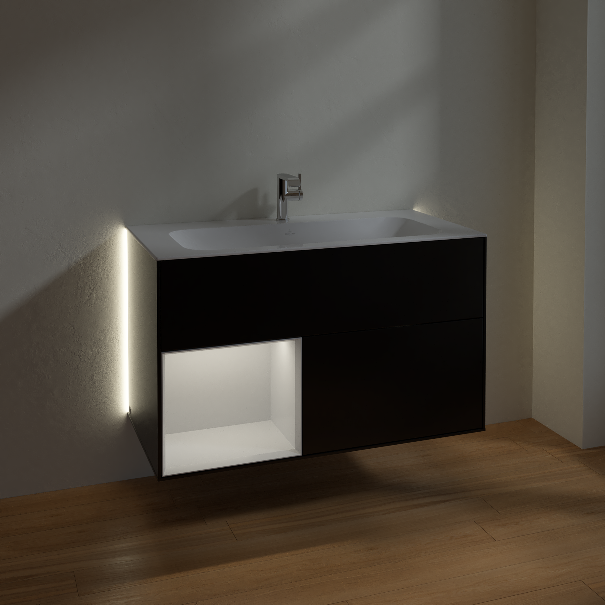 Finion Vanity unit, with lighting, 2 pull-out compartments, 996x591x498mm, Body: Black Matt Lacquer, Front: Black Matt Lacquer, Shelf: Glossy White Lacquer