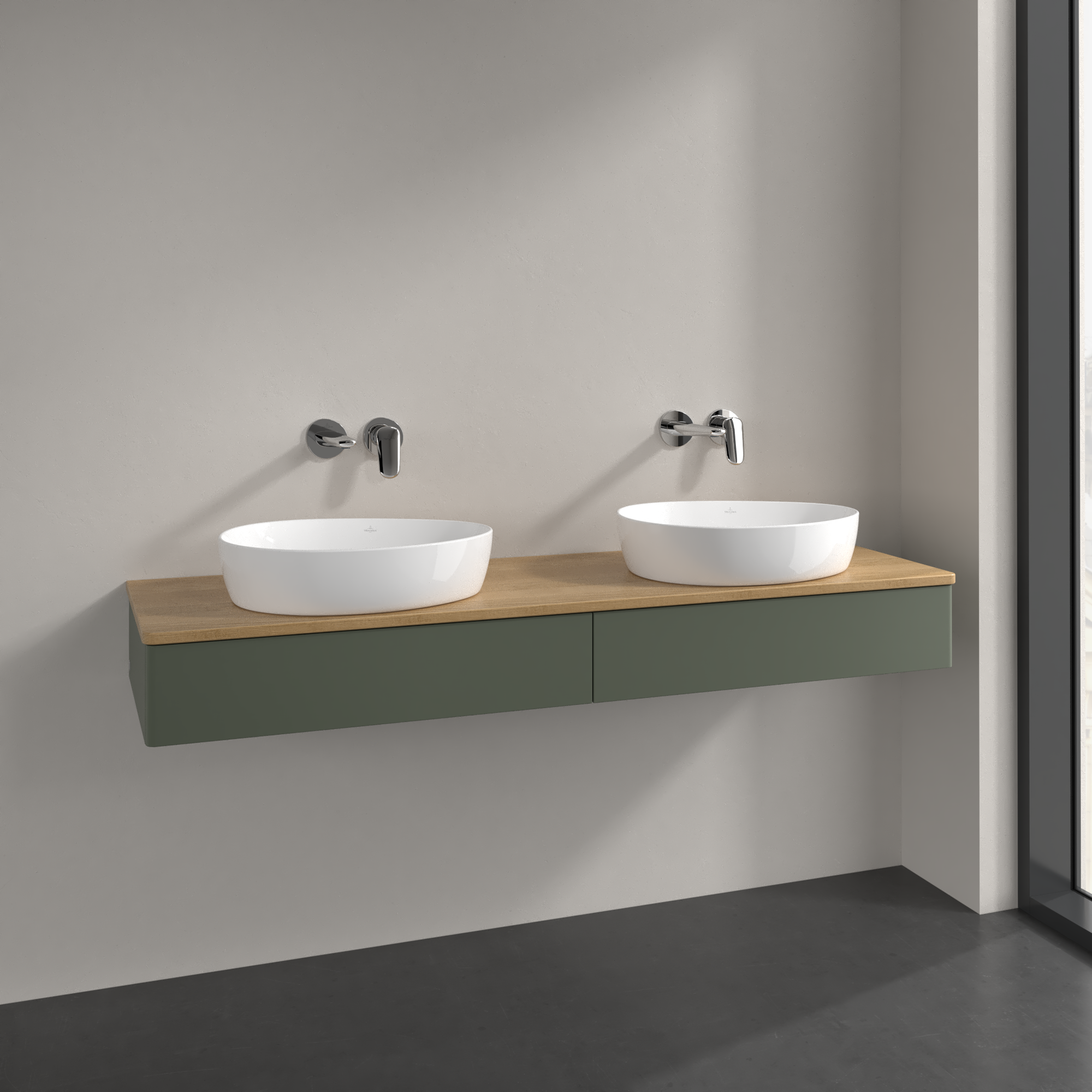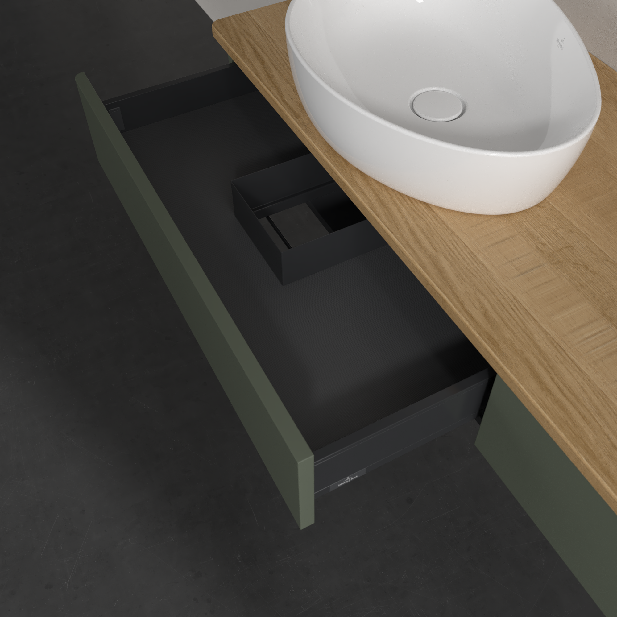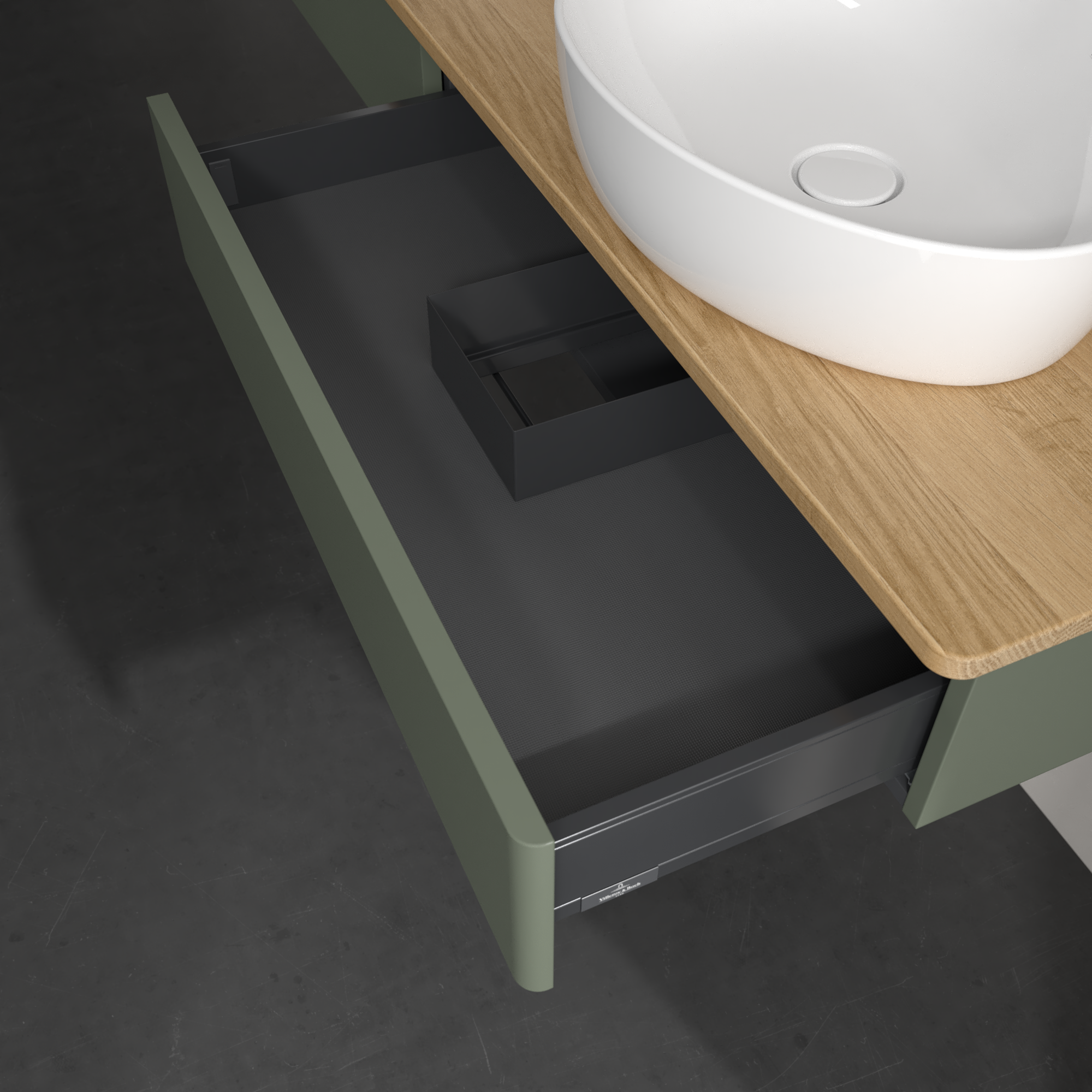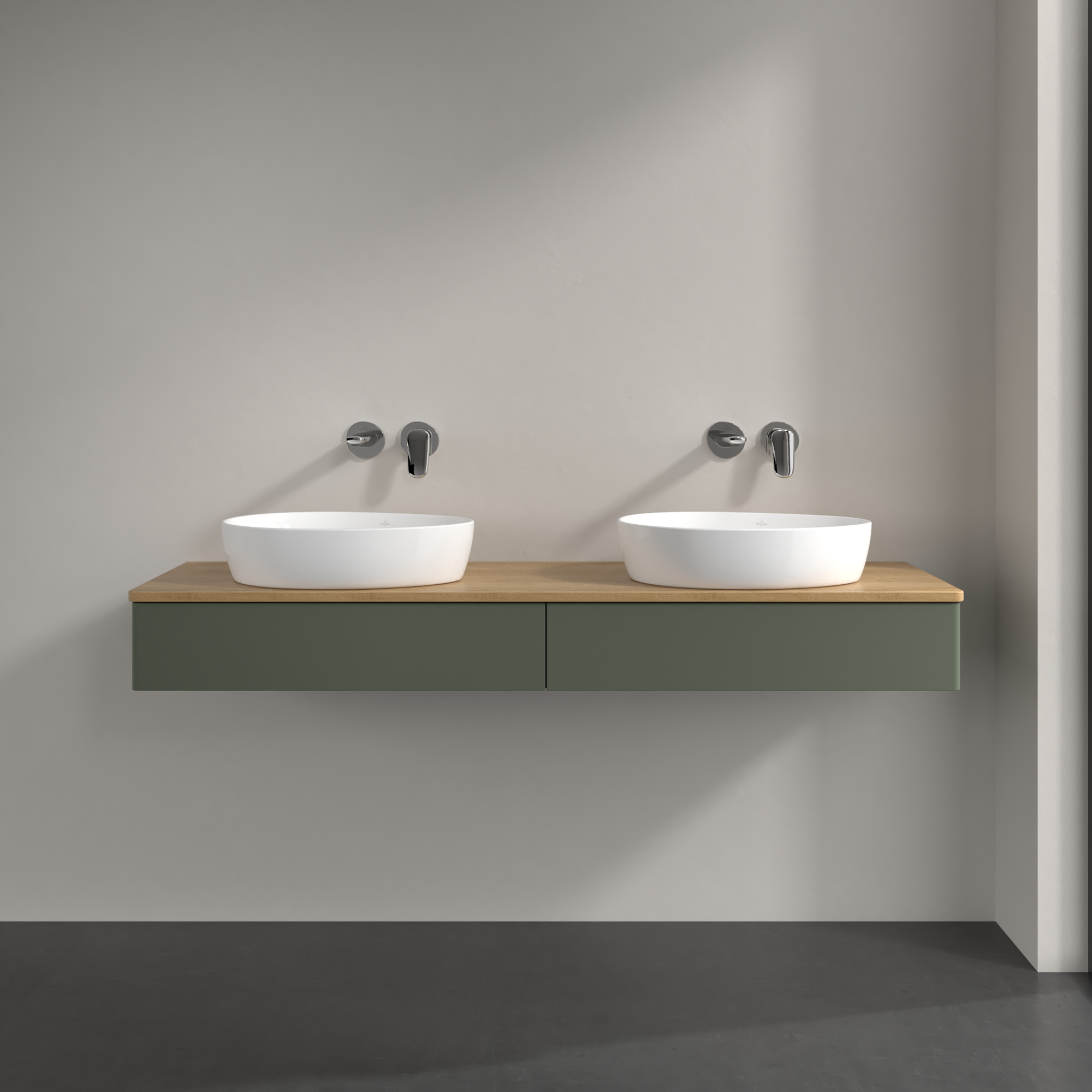 Antao Vanity unit, 2 pull-out compartments, 1600x190x500mm, Front without structure, Body: Leaf Green Matt Lacquer, Front: Leaf Green Matt Lacquer, Cover plate: Honey Oak