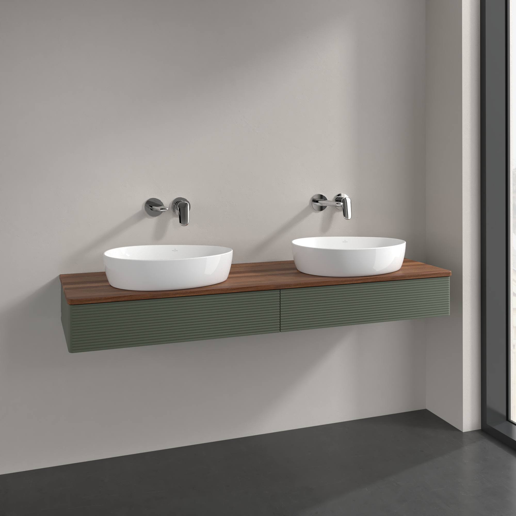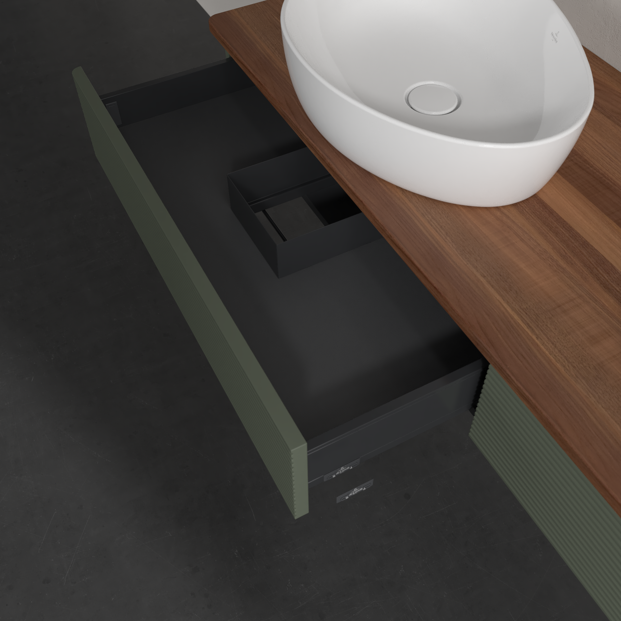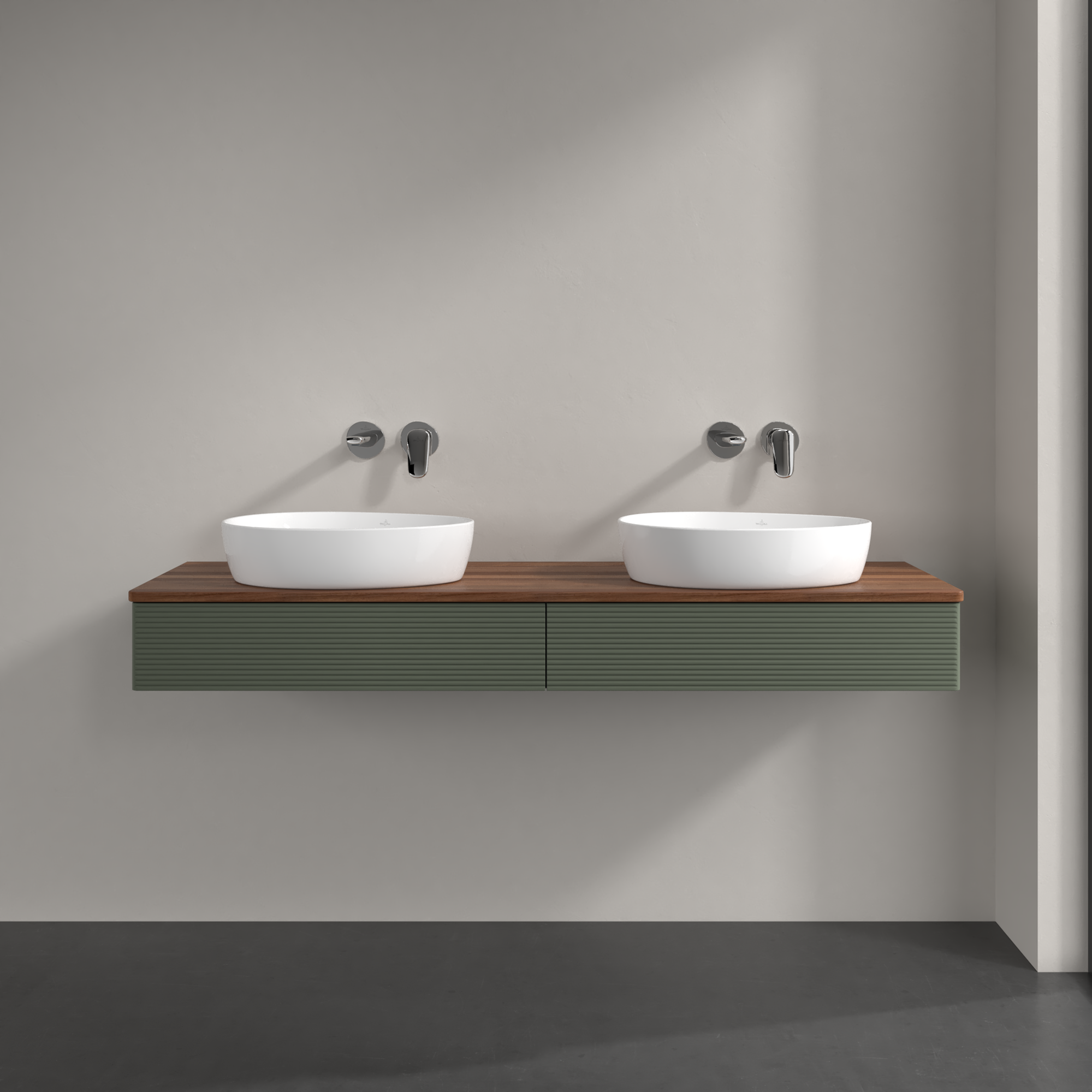 Antao Vanity unit, 2 pull-out compartments, 1600x190x500mm, Front with grain texture, Body: Leaf Green Matt Lacquer, Front: Leaf Green Matt Lacquer, Cover plate: Warm Walnut