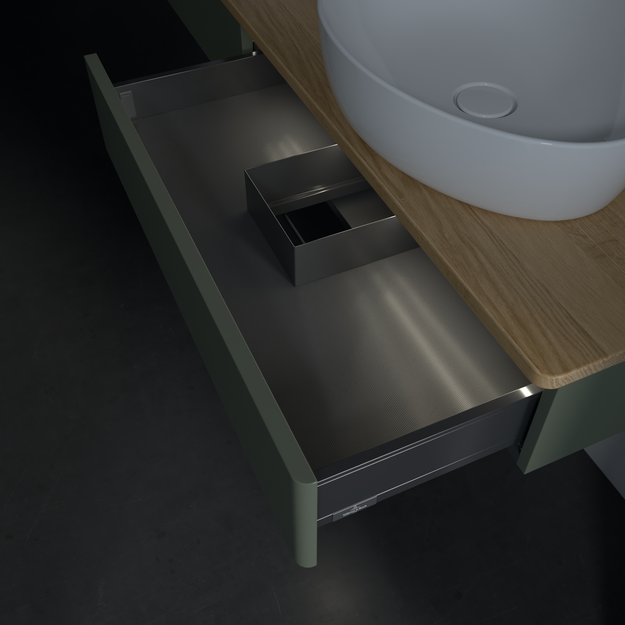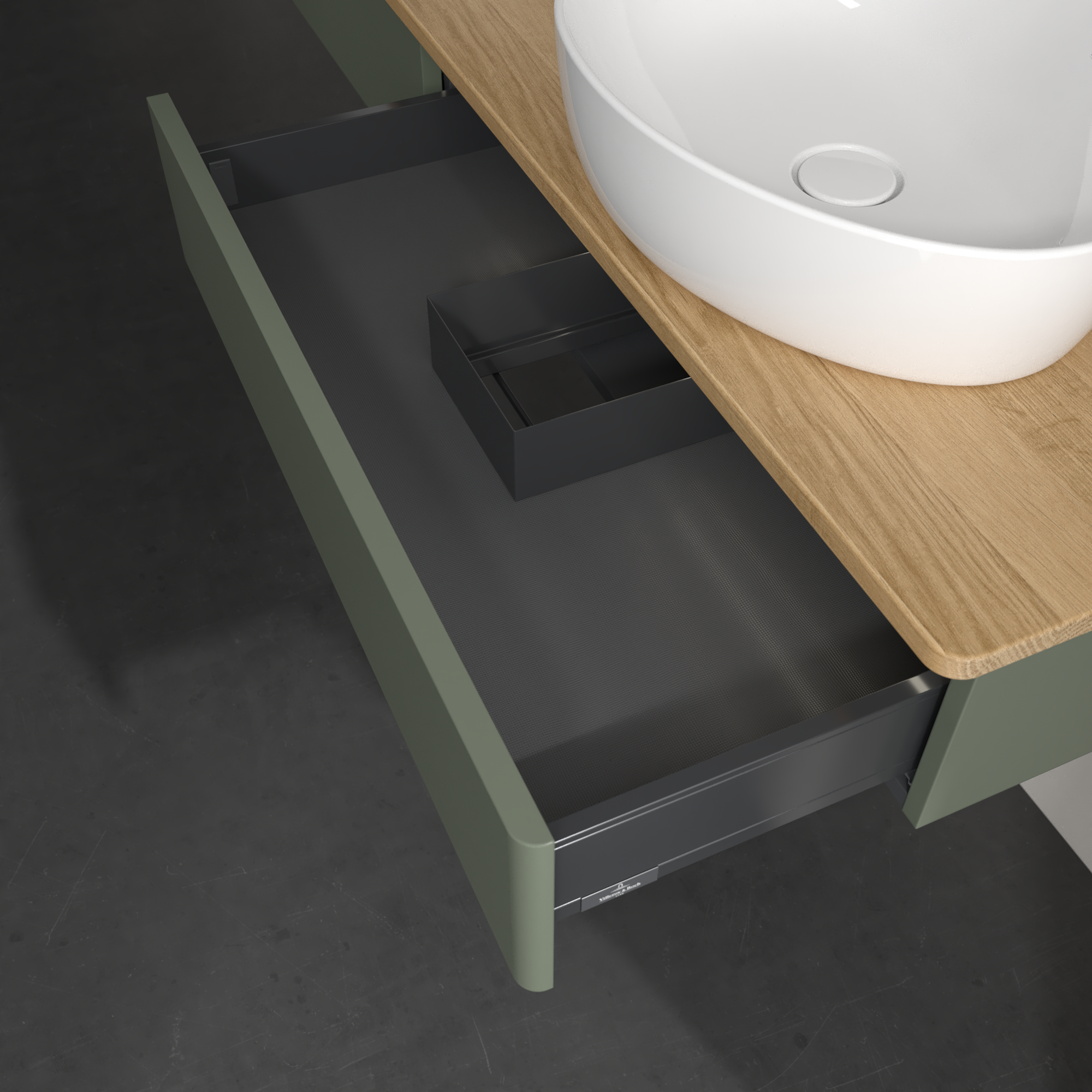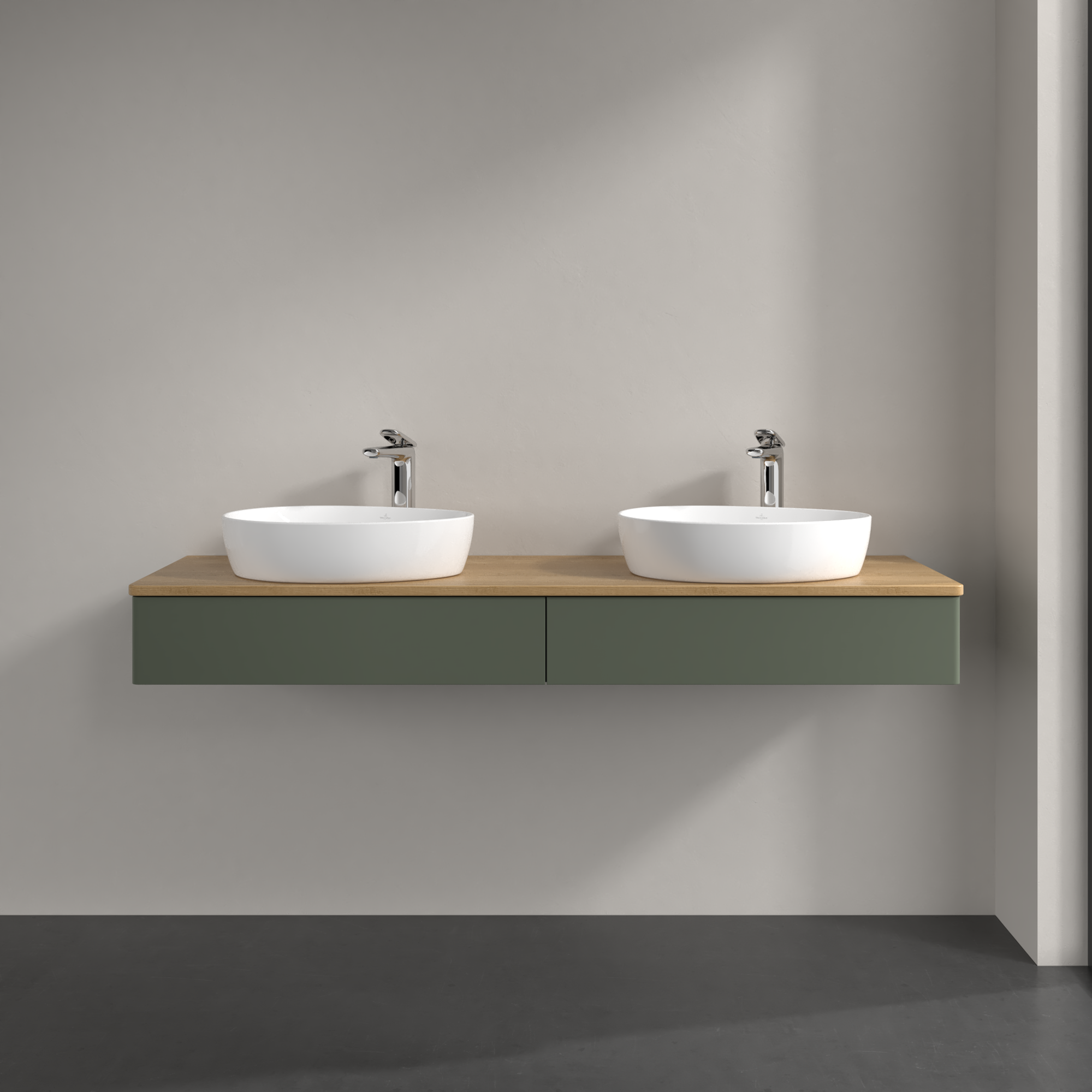 Antao Vanity unit, with lighting, 2 pull-out compartments, 1600x190x500mm, Front without structure, Body: Leaf Green Matt Lacquer, Front: Leaf Green Matt Lacquer, Cover plate: Honey Oak