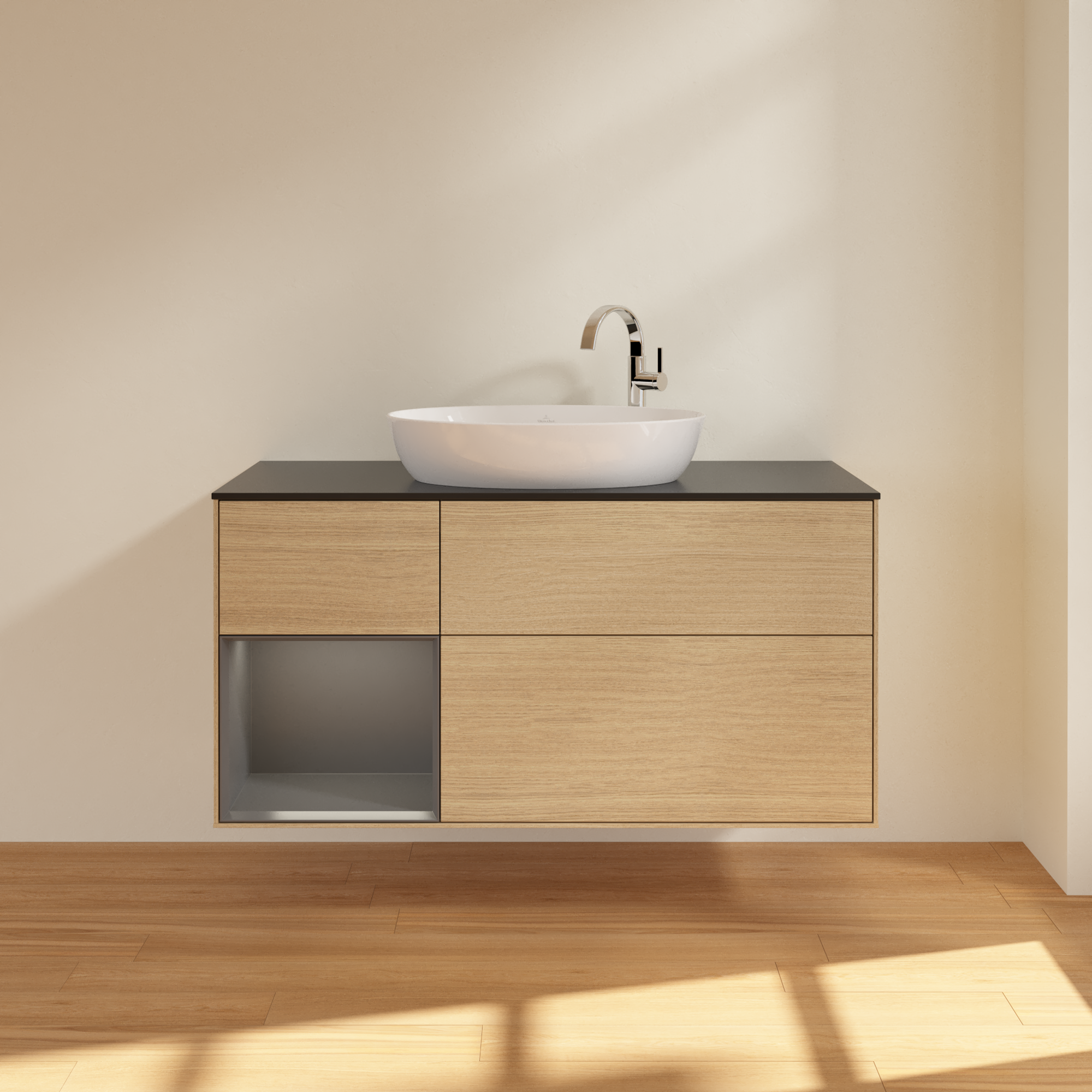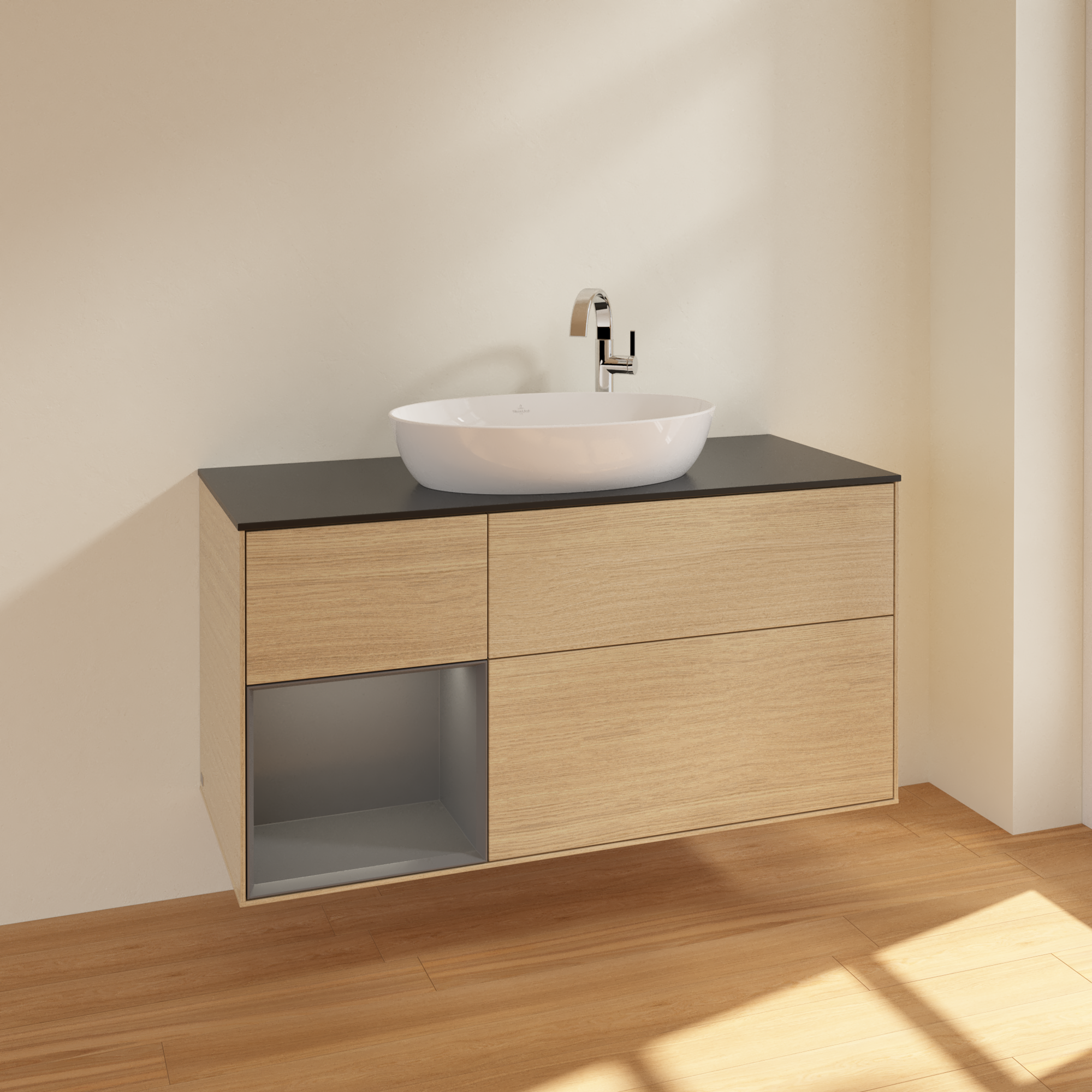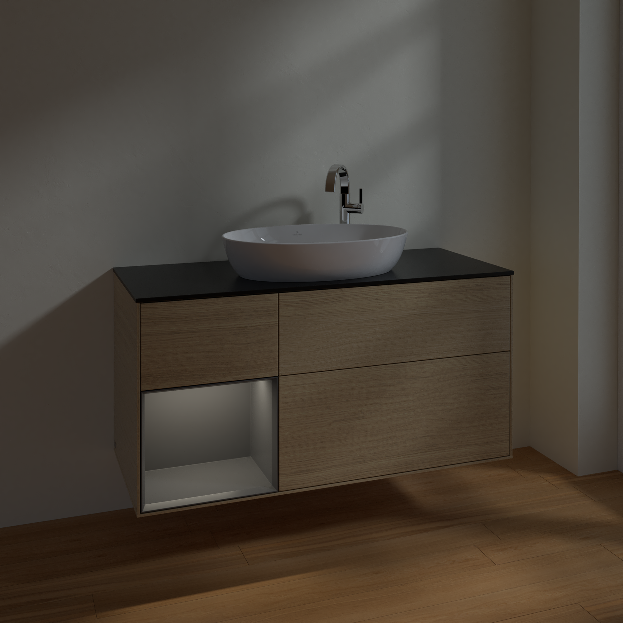Finion Vanity unit, with lighting, 3 pull-out compartments, 1200x603x501mm, Body: Oak Veneer, Front: Oak Veneer, Shelf: Anthracite Matt Lacquer, Cover plate: Glass Black Matt