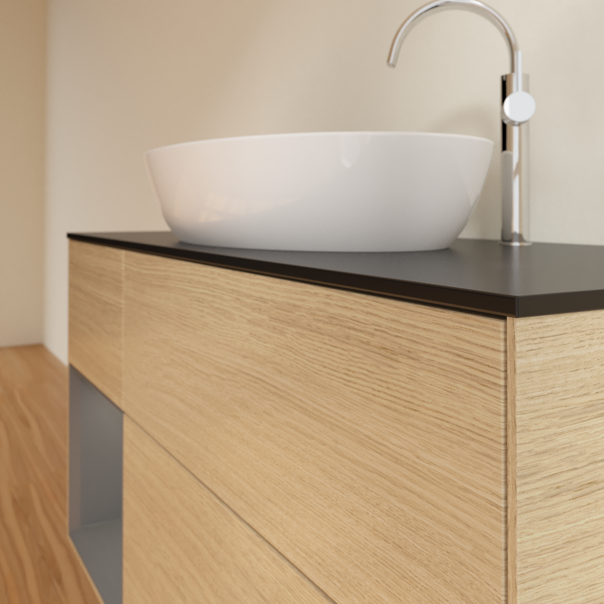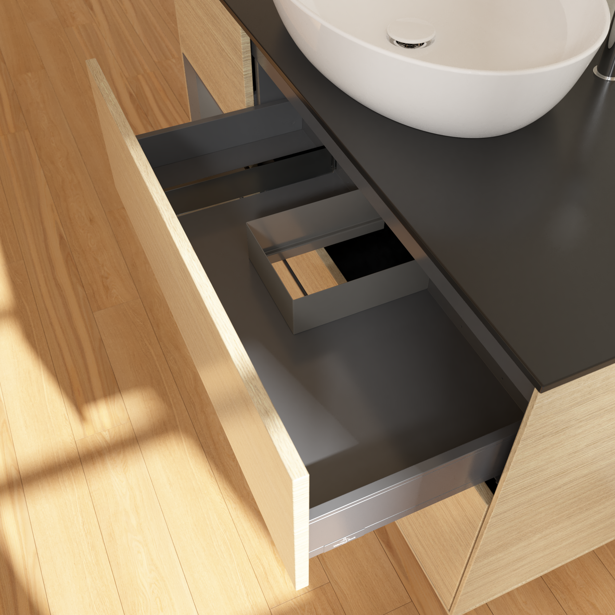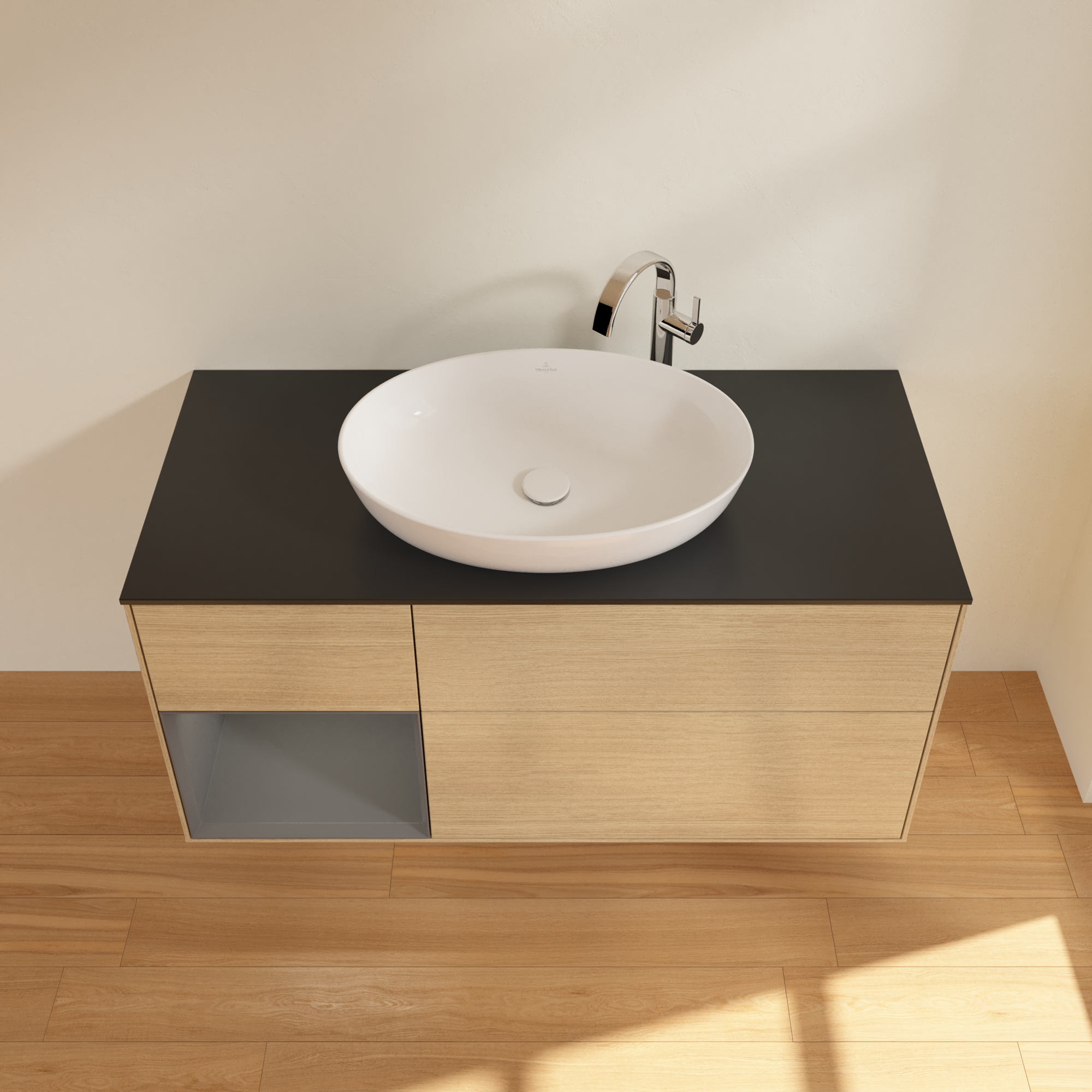 Finion Vanity unit, with lighting, 3 pull-out compartments, 1200x603x501mm, Body: Oak Veneer, Front: Oak Veneer, Shelf: Anthracite Matt Lacquer, Cover plate: Glass Black Matt