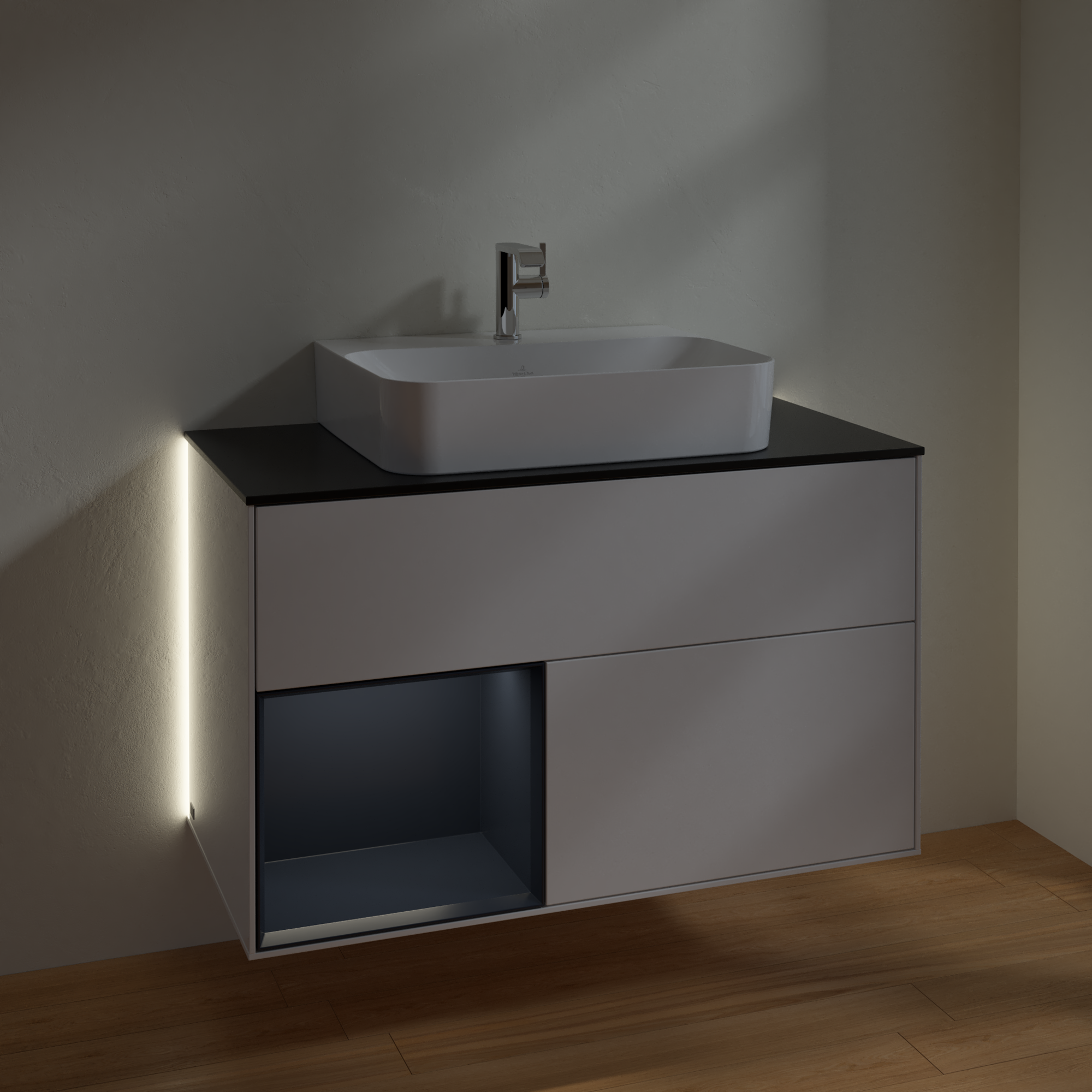 Finion Vanity unit, with lighting, 2 pull-out compartments, 1000x603x501mm, Body: Glossy White Lacquer, Front: Glossy White Lacquer, Shelf: Midnight Blue Matt Lacquer, Cover plate: Glass Black Matt