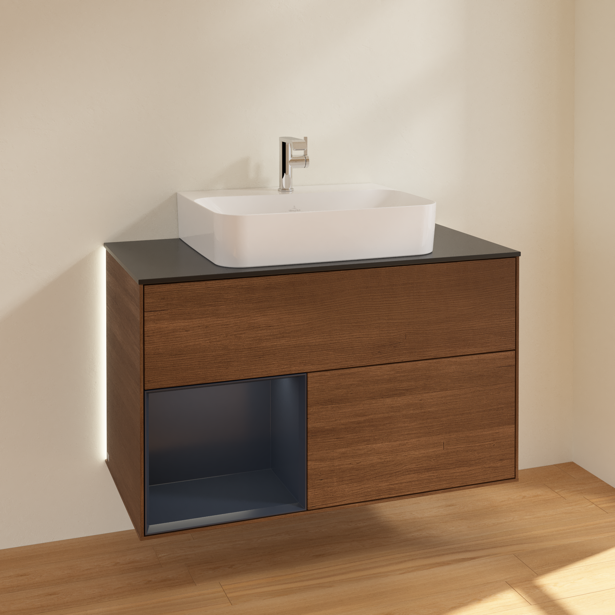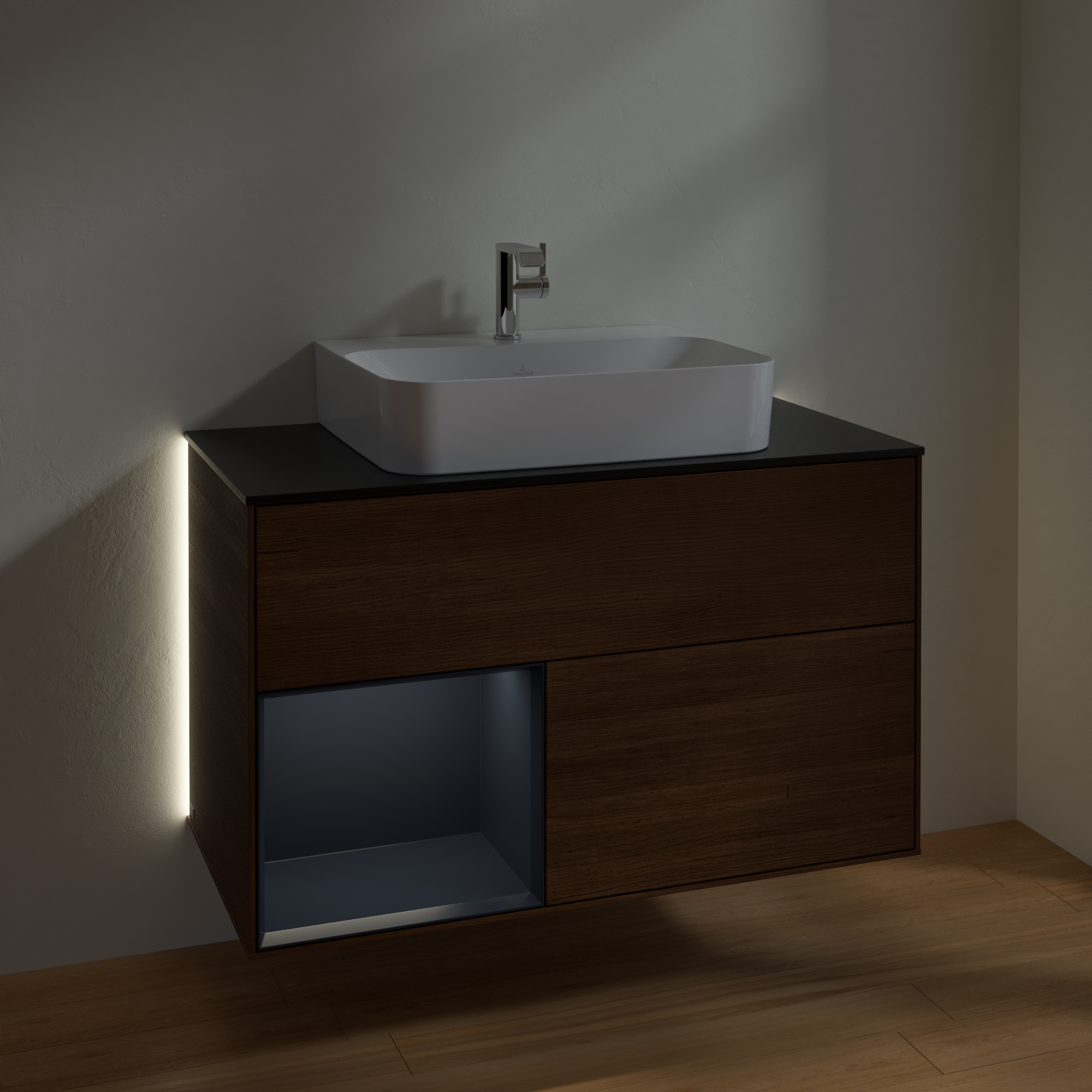 Finion Vanity unit, with lighting, 2 pull-out compartments, 1000x603x501mm, Body: Walnut Veneer, Front: Walnut Veneer, Shelf: Midnight Blue Matt Lacquer, Cover plate: Glass Black Matt