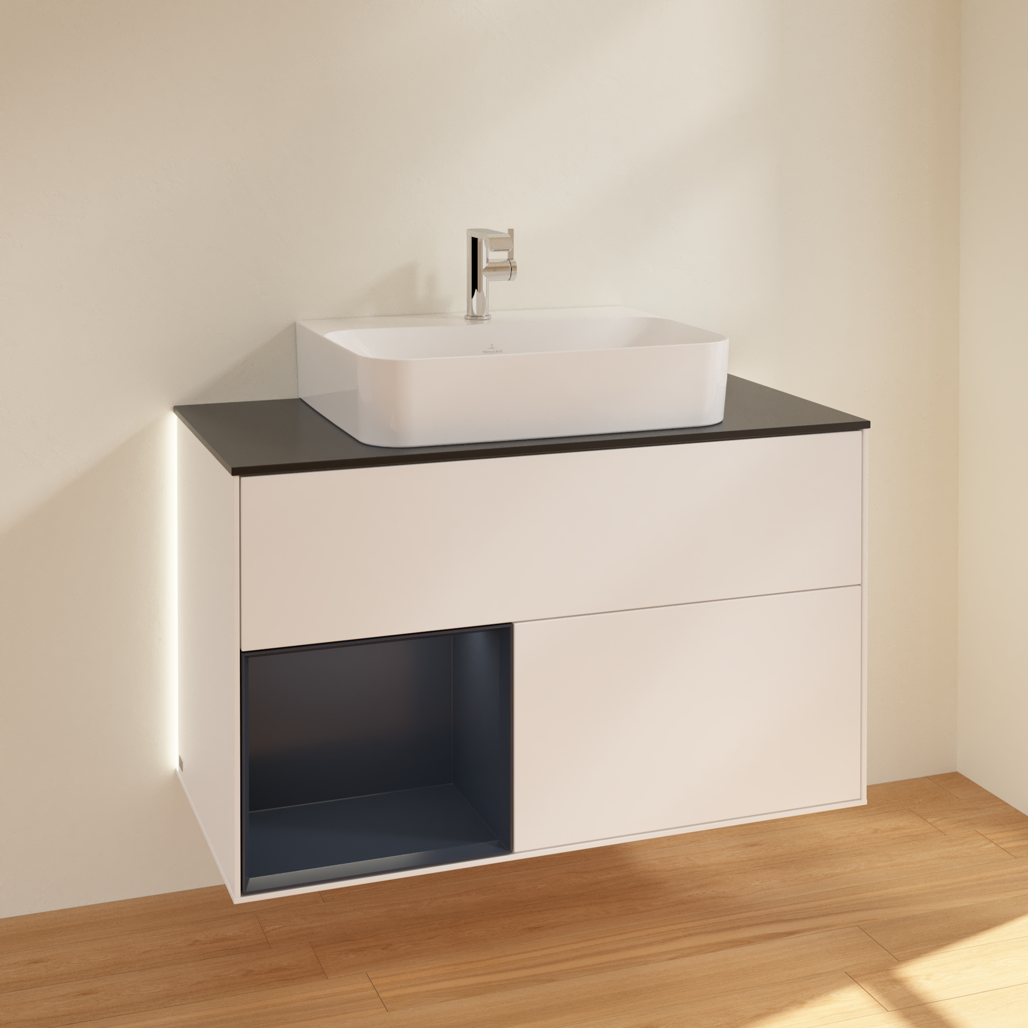 Finion Vanity unit, with lighting, 2 pull-out compartments, 1000x603x501mm, Body: White Matt Lacquer, Front: White Matt Lacquer, Shelf: Midnight Blue Matt Lacquer, Cover plate: Glass Black Matt