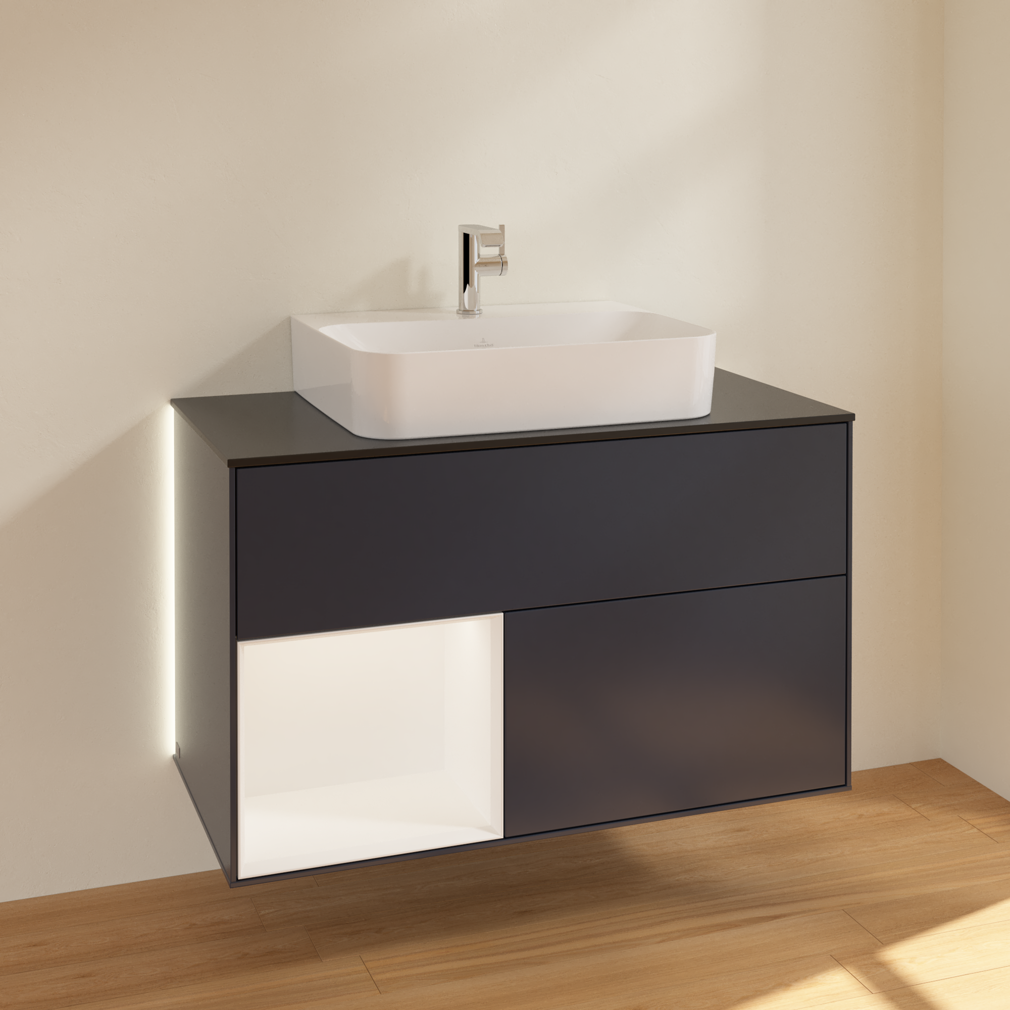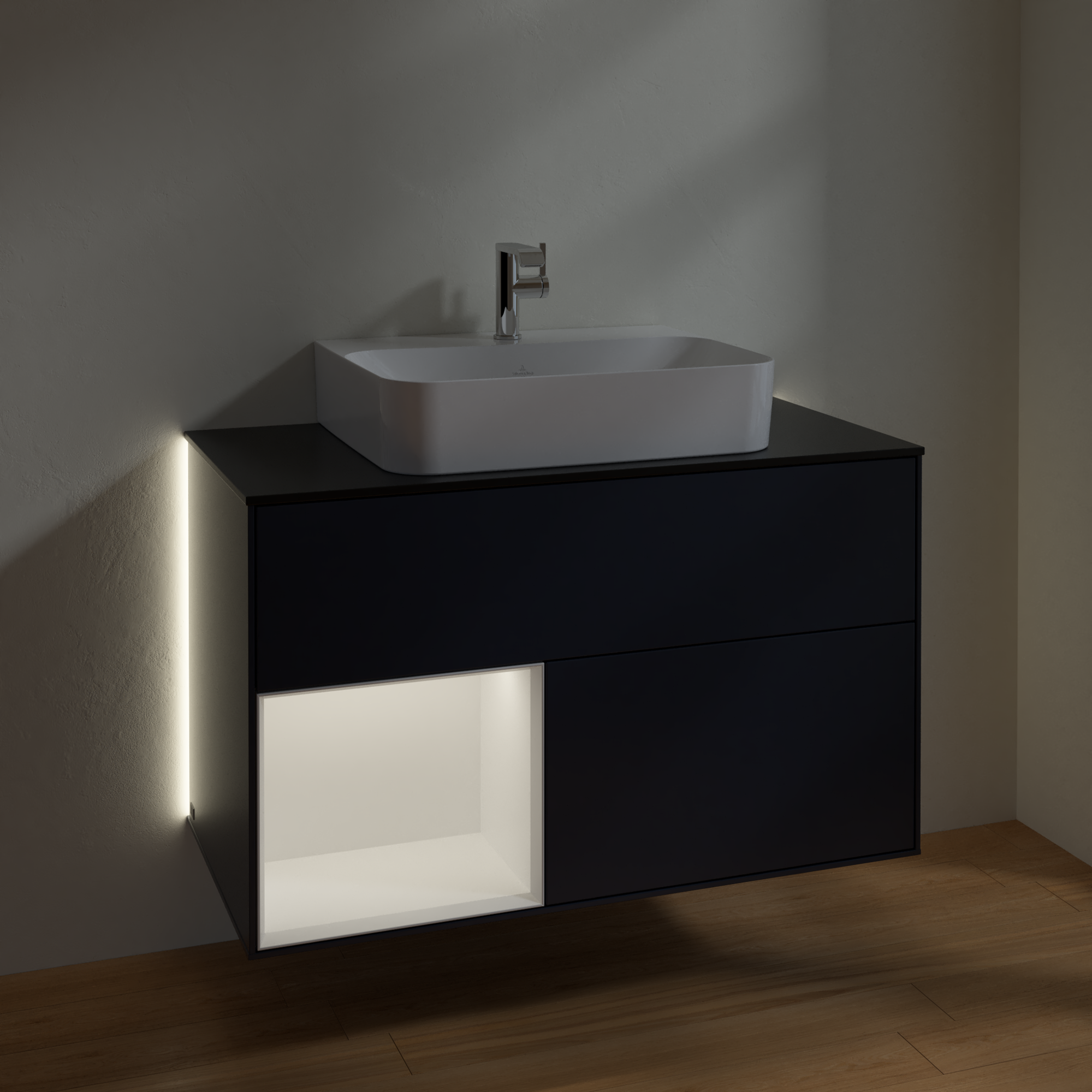 Finion Vanity unit, with lighting, 2 pull-out compartments, 1000x603x501mm, Body: Midnight Blue Matt Lacquer, Front: Midnight Blue Matt Lacquer, Shelf: White Matt Lacquer, Cover plate: Glass Black Matt