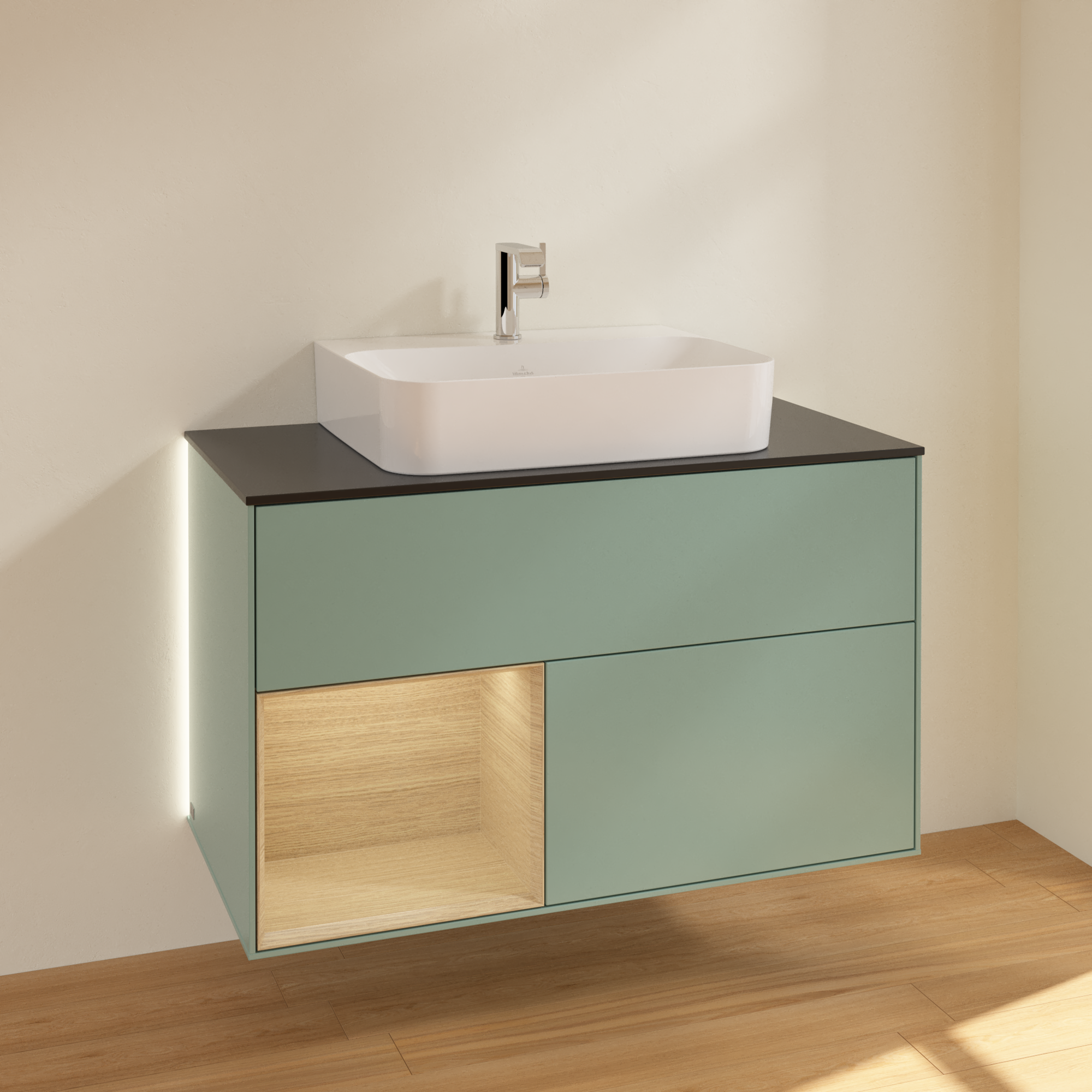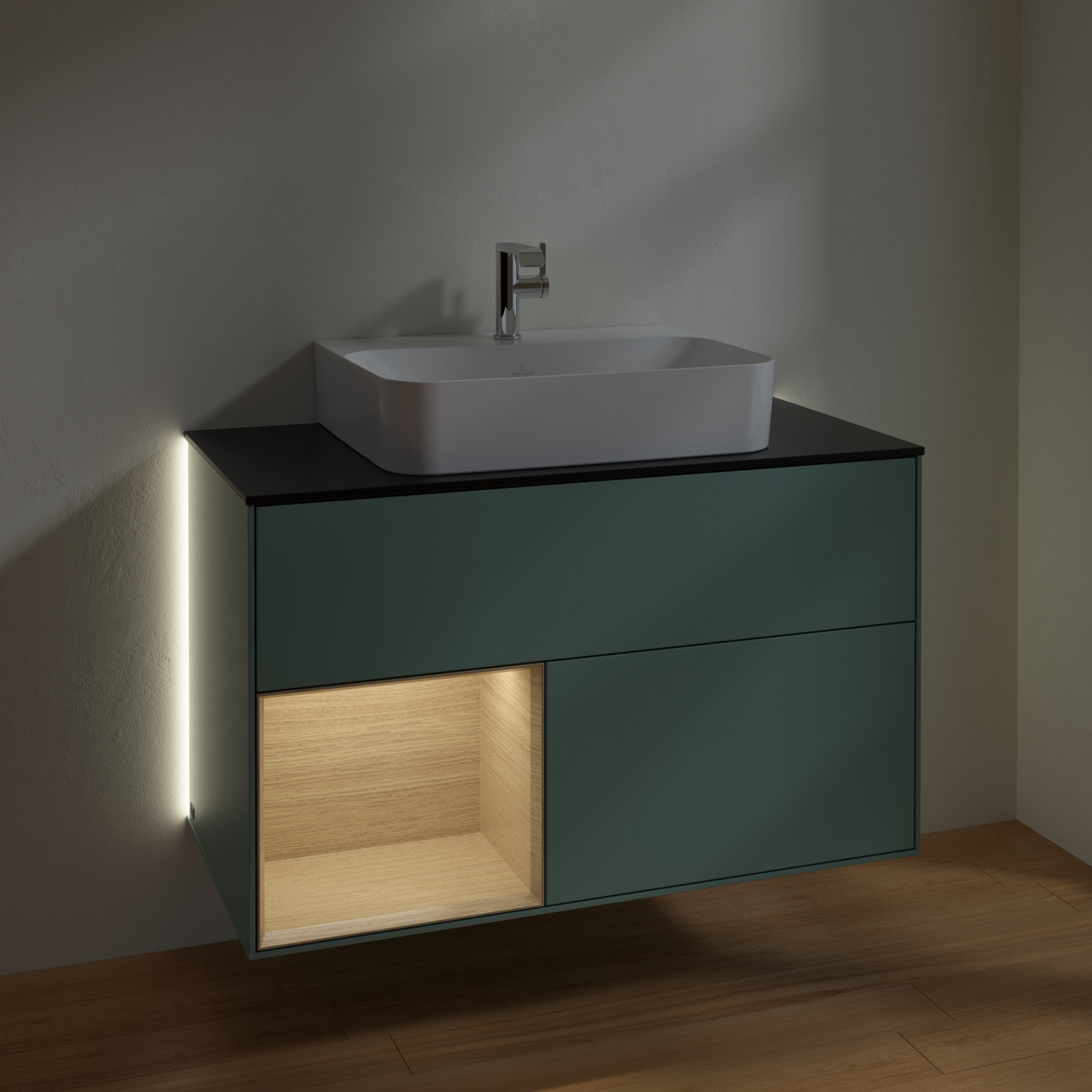 Finion Vanity unit, with lighting, 2 pull-out compartments, 1000x603x501mm, Body: Olive Matt Lacquer, Front: Olive Matt Lacquer, Shelf: Oak Veneer, Cover plate: Glass Black Matt