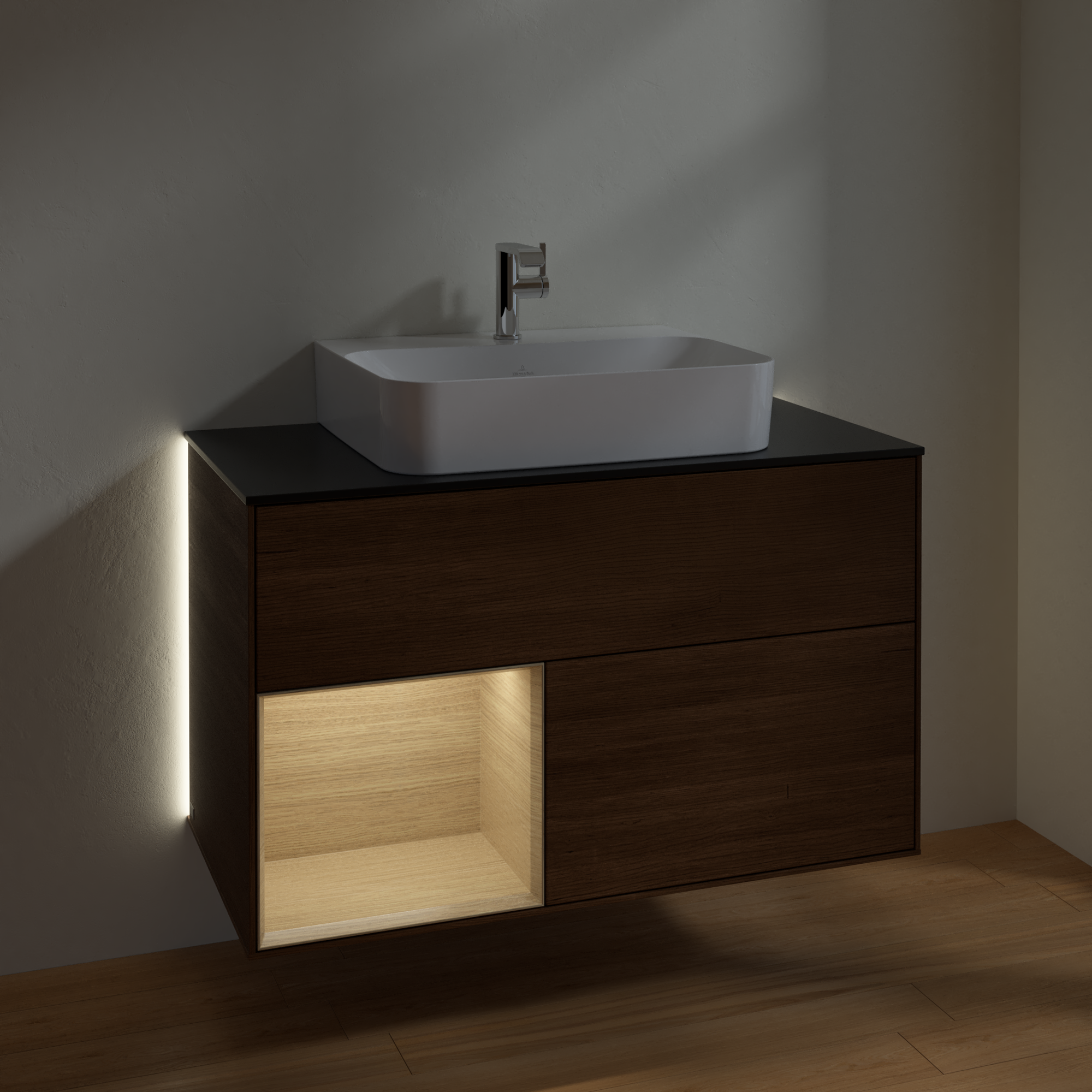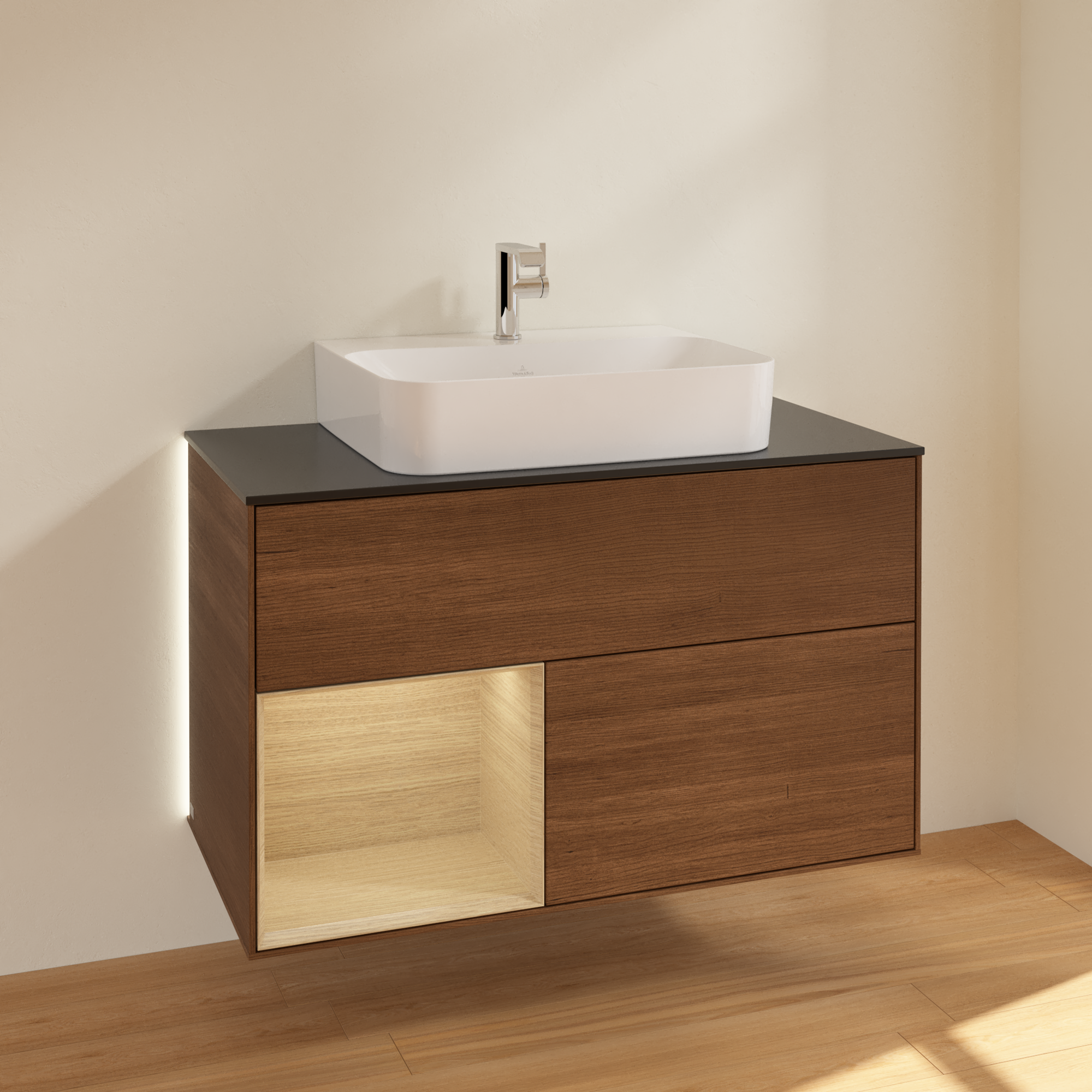 Finion Vanity unit, with lighting, 2 pull-out compartments, 1000x603x501mm, Body: Walnut Veneer, Front: Walnut Veneer, Shelf: Oak Veneer, Cover plate: Glass Black Matt