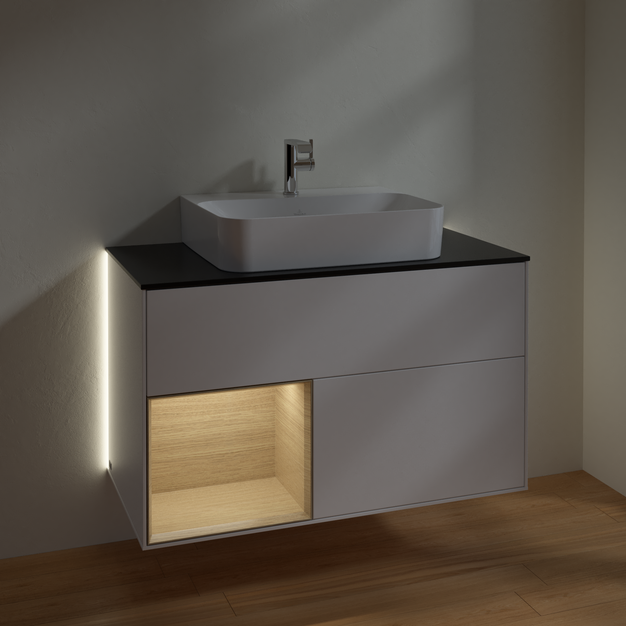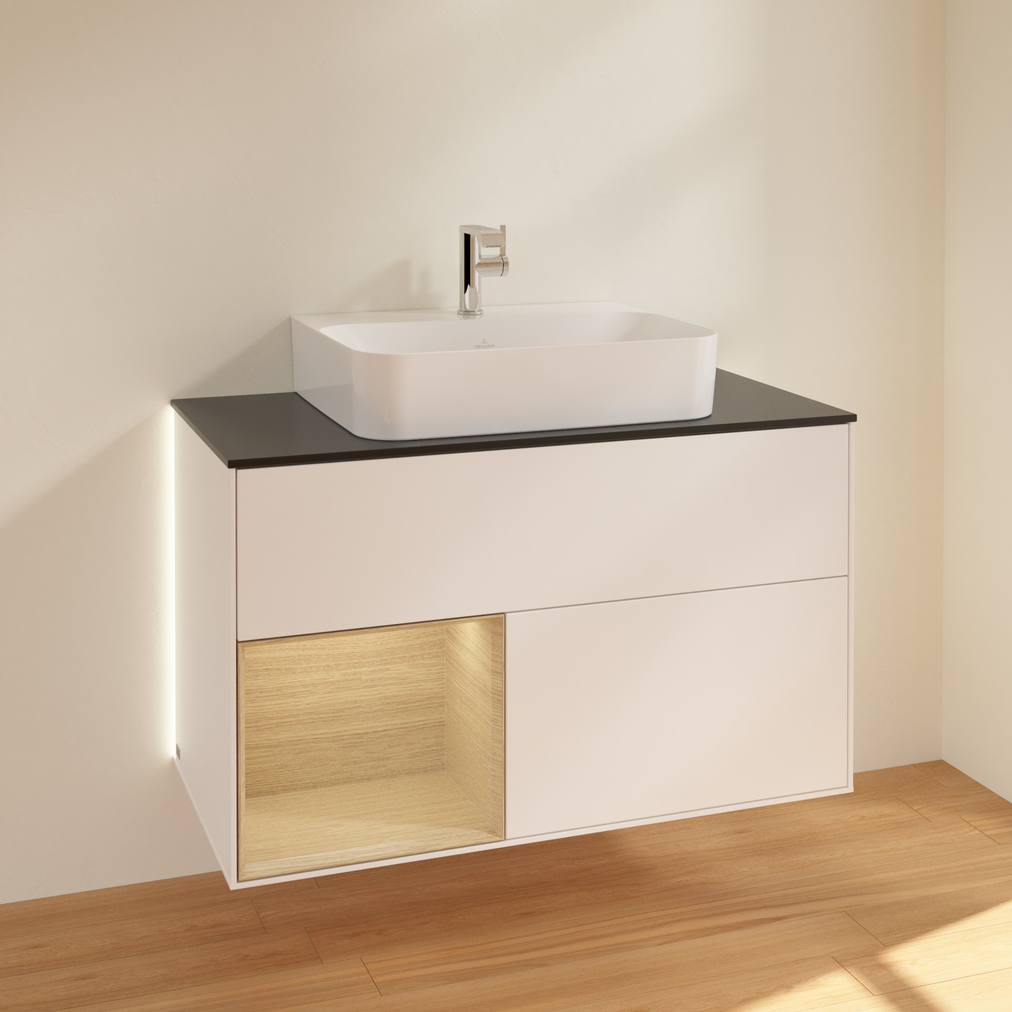 Finion Vanity unit, with lighting, 2 pull-out compartments, 1000x603x501mm, Body: White Matt Lacquer, Front: White Matt Lacquer, Shelf: Oak Veneer, Cover plate: Glass Black Matt