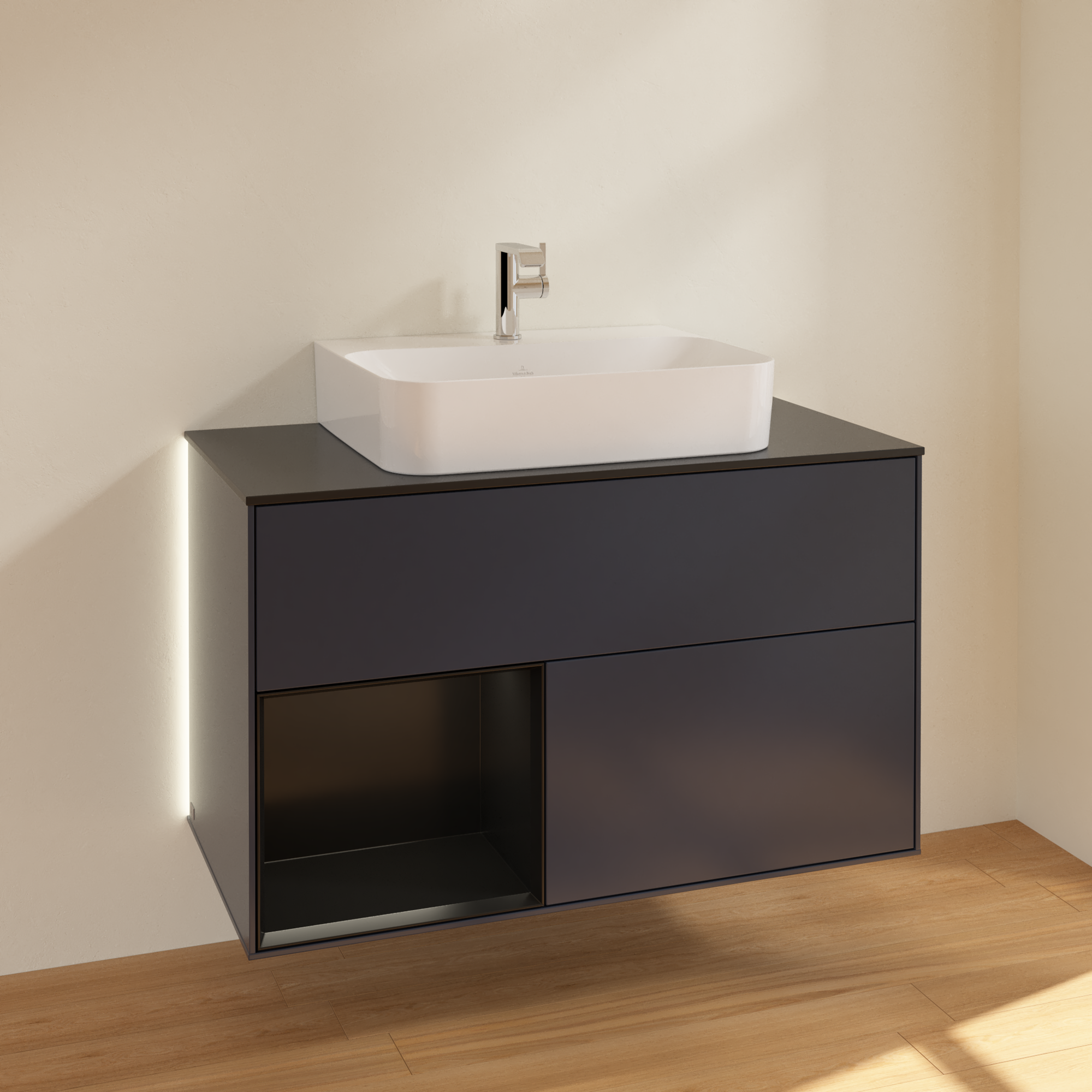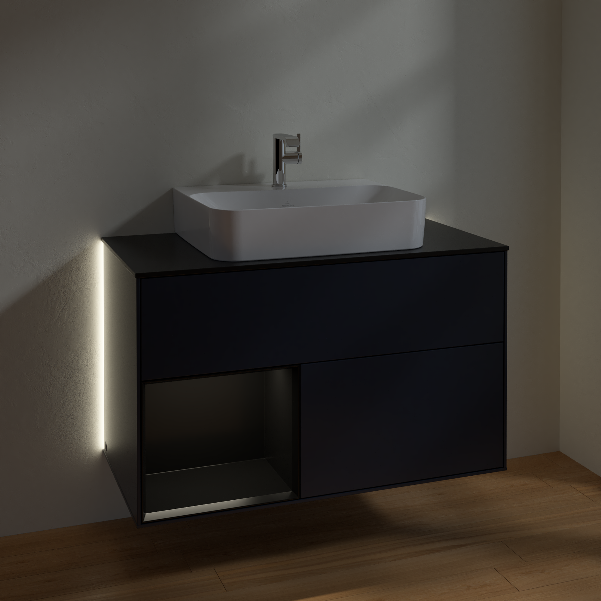 Finion Vanity unit, with lighting, 2 pull-out compartments, 1000x603x501mm, Body: Midnight Blue Matt Lacquer, Front: Midnight Blue Matt Lacquer, Shelf: Black Matt Lacquer, Cover plate: Glass Black Matt