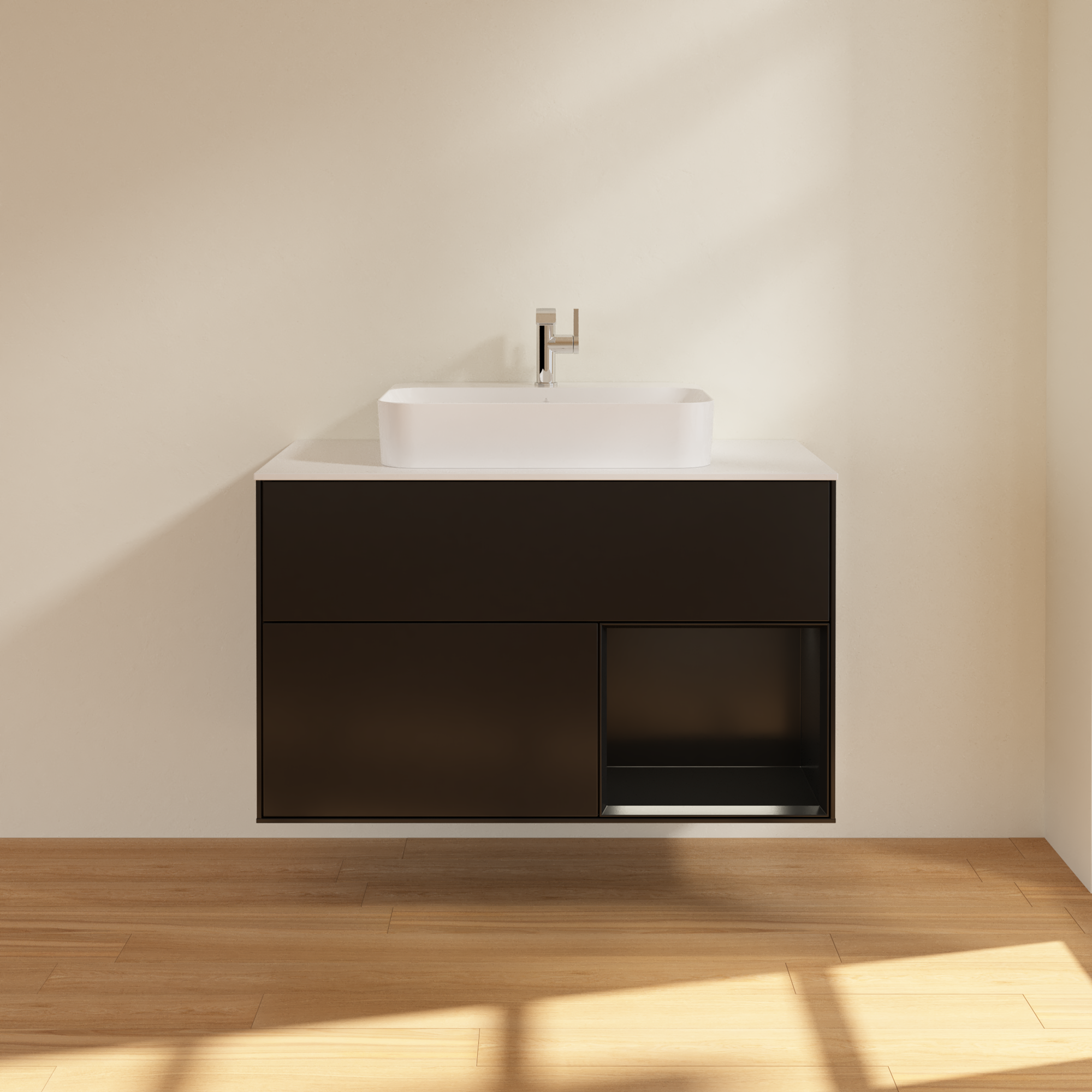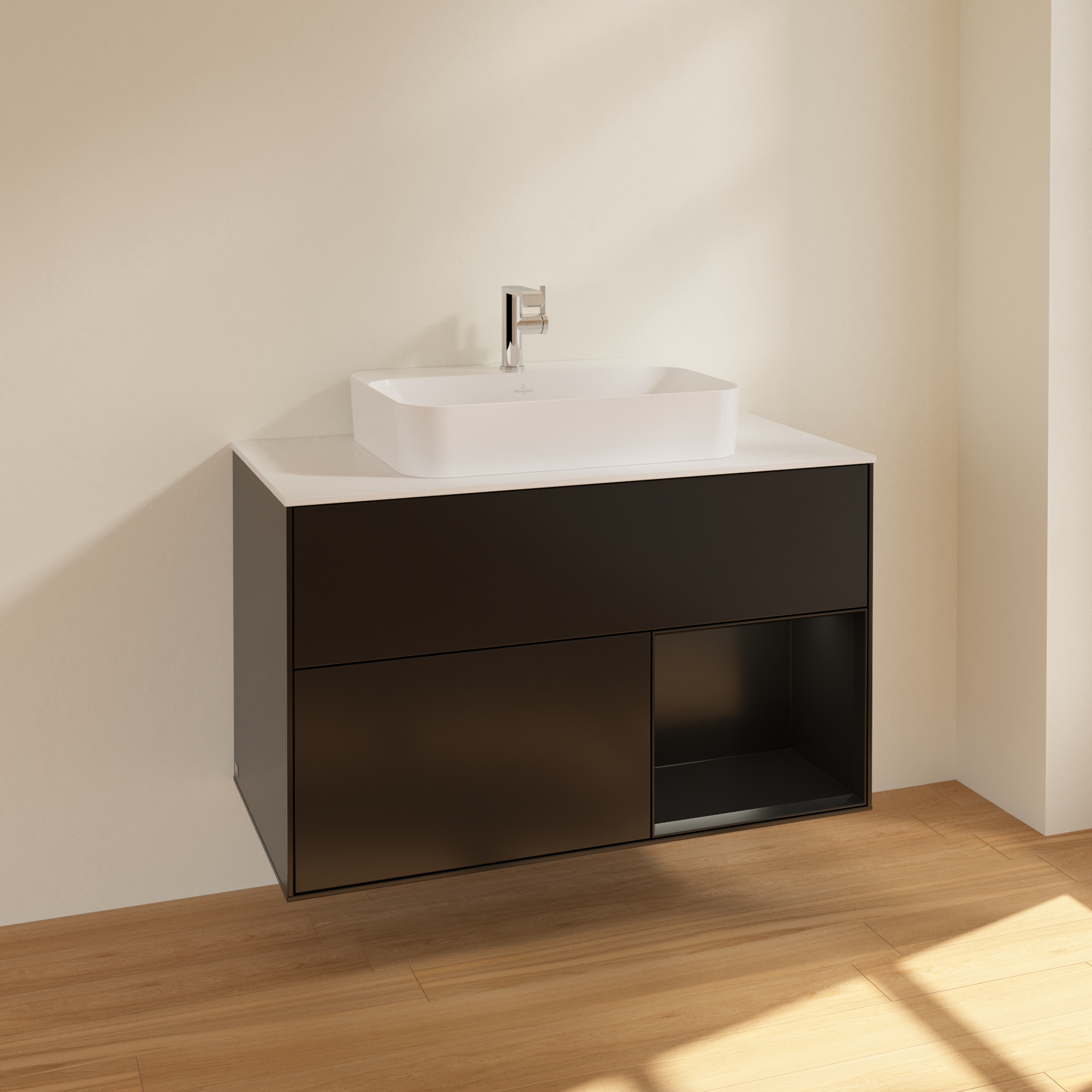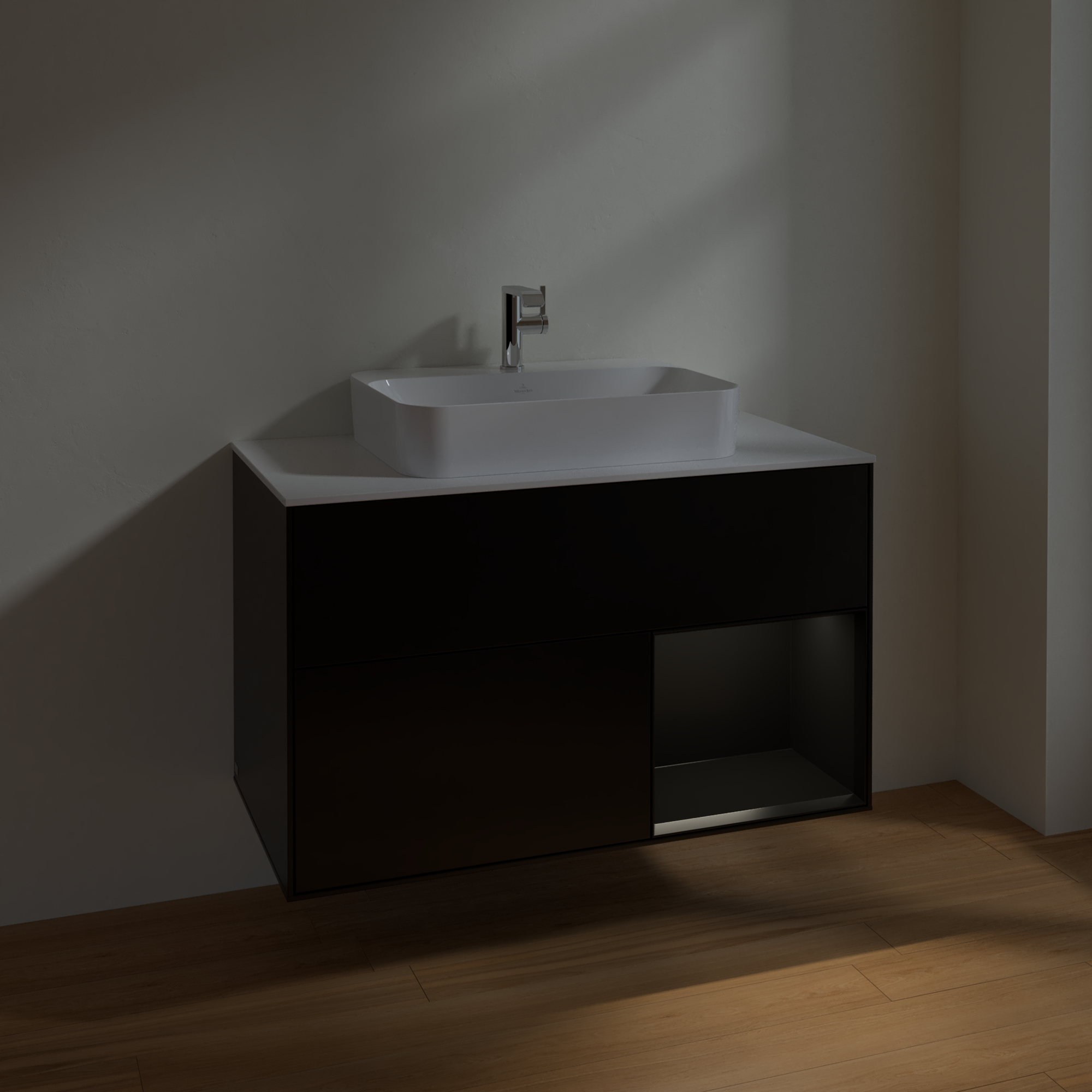 Finion Vanity unit, with lighting, 2 pull-out compartments, 1000x603x501mm, Body: Black Matt Lacquer, Front: Black Matt Lacquer, Shelf: Black Matt Lacquer, Cover plate: Glass White Matt