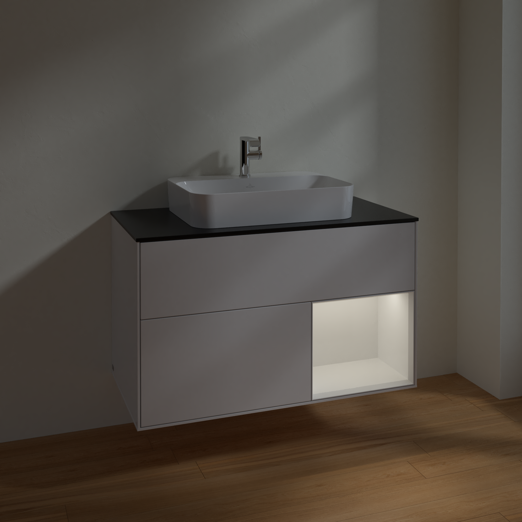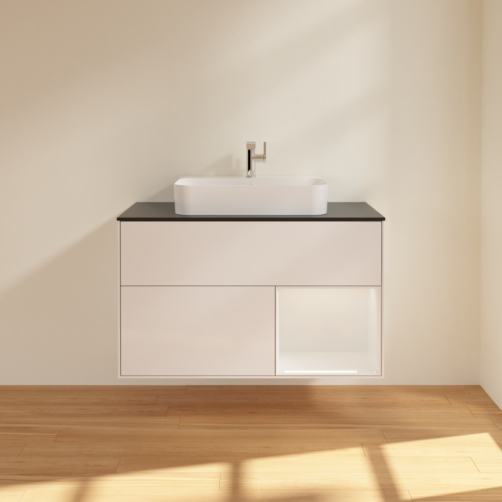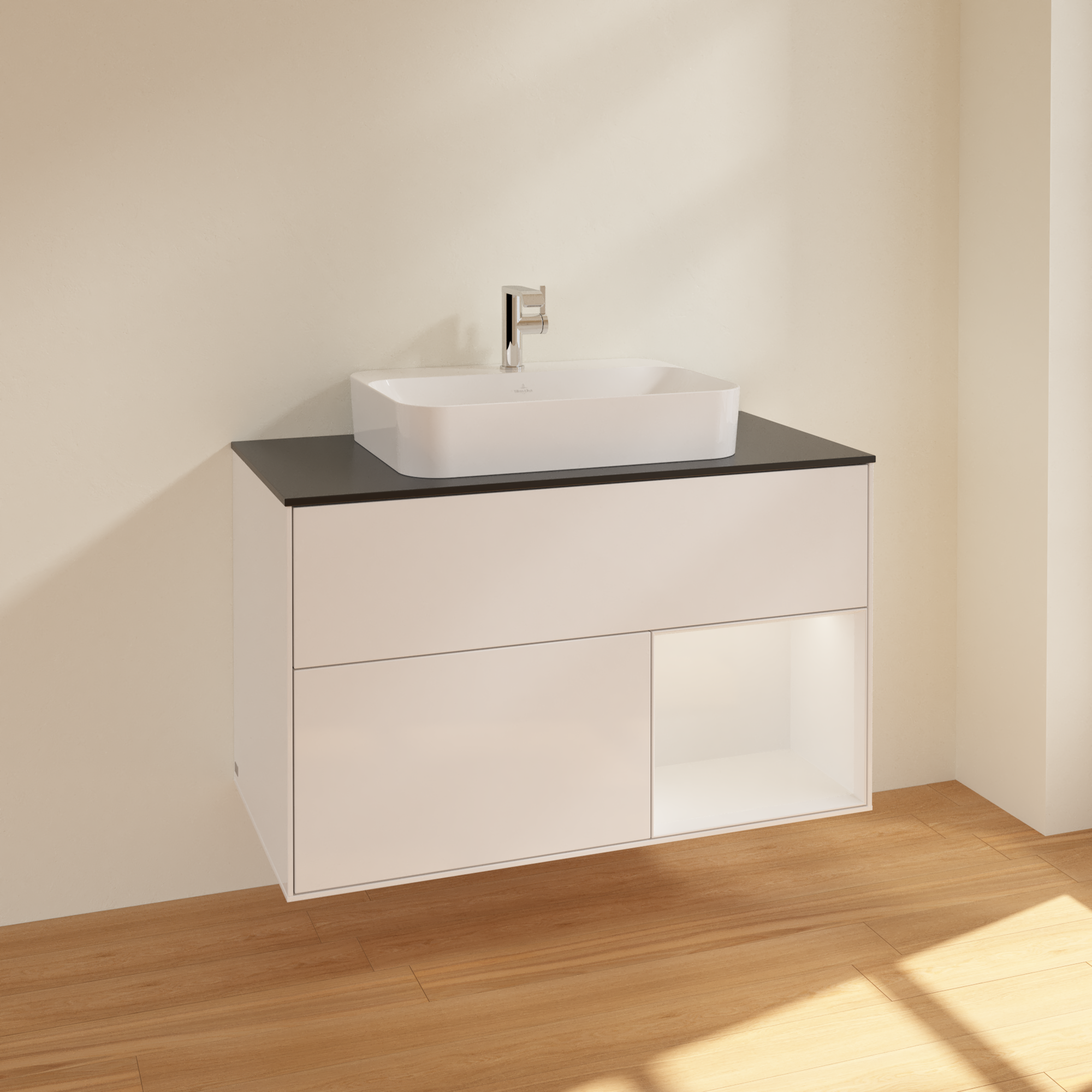 Finion Vanity unit, with lighting, 2 pull-out compartments, 1000x603x501mm, Body: Glossy White Lacquer, Front: Glossy White Lacquer, Shelf: Glossy White Lacquer, Cover plate: Glass Black Matt