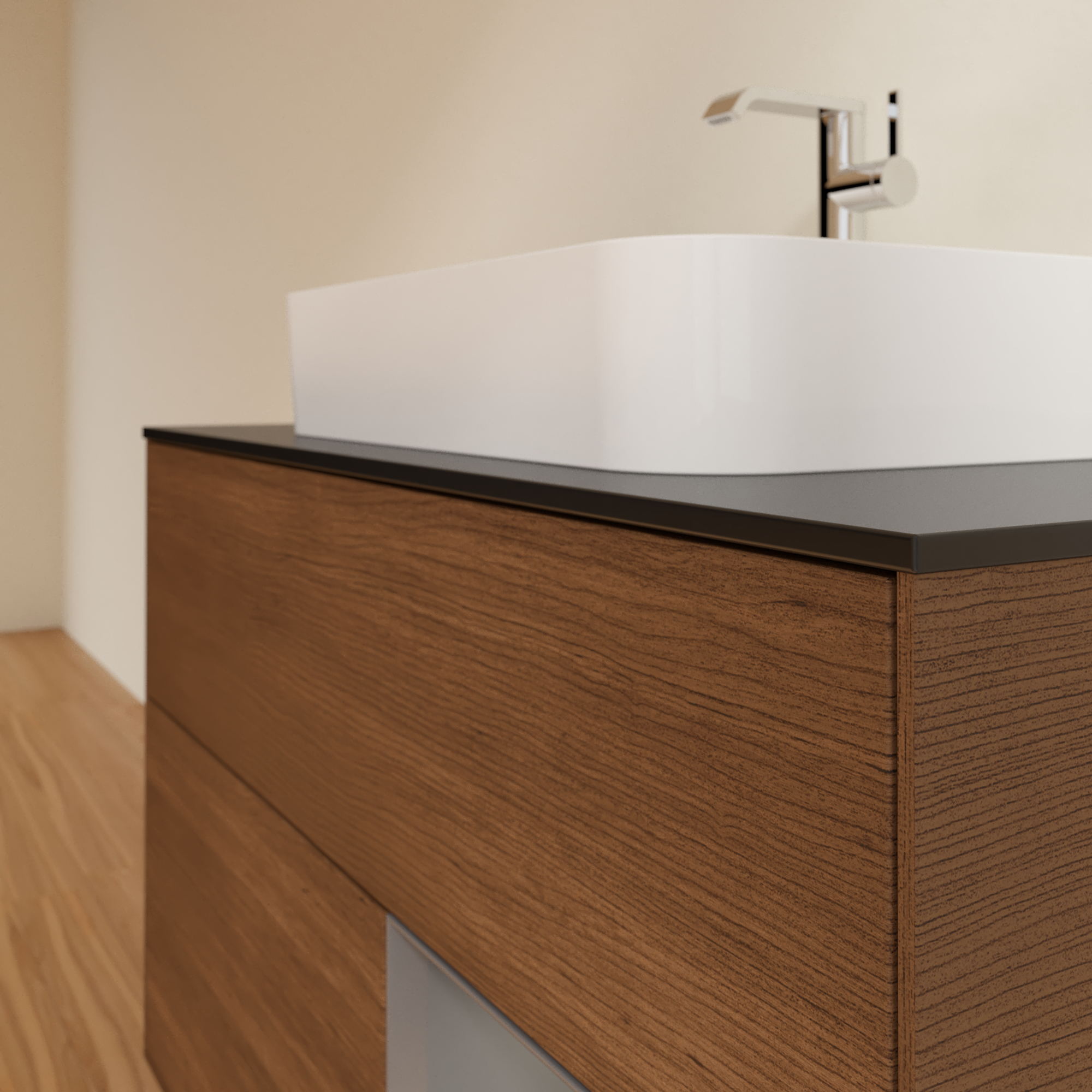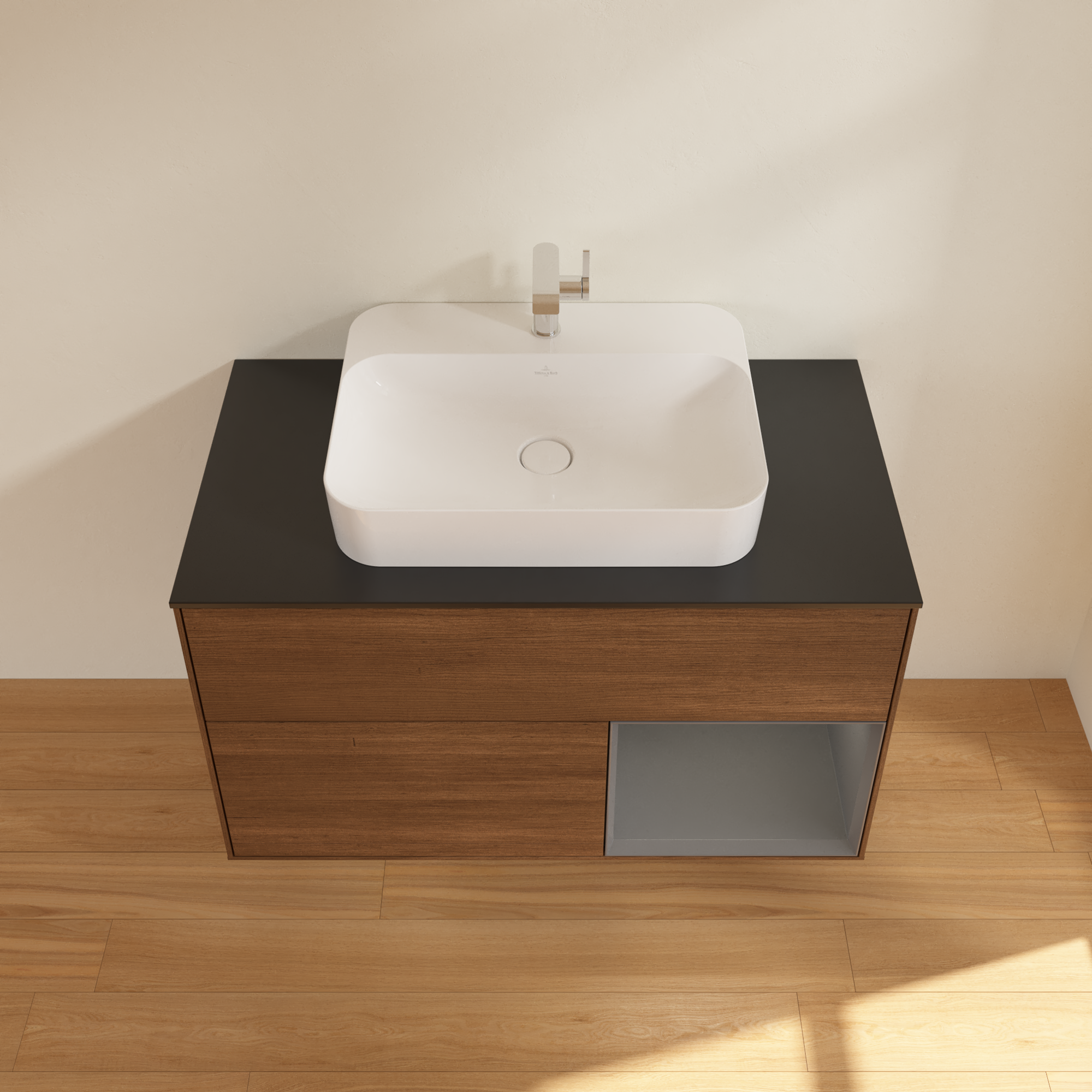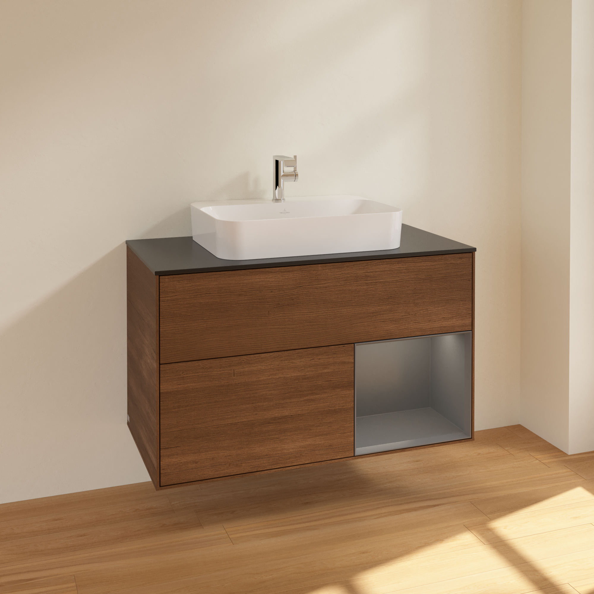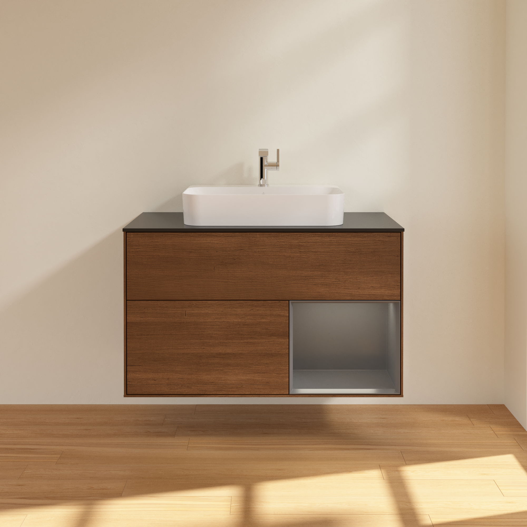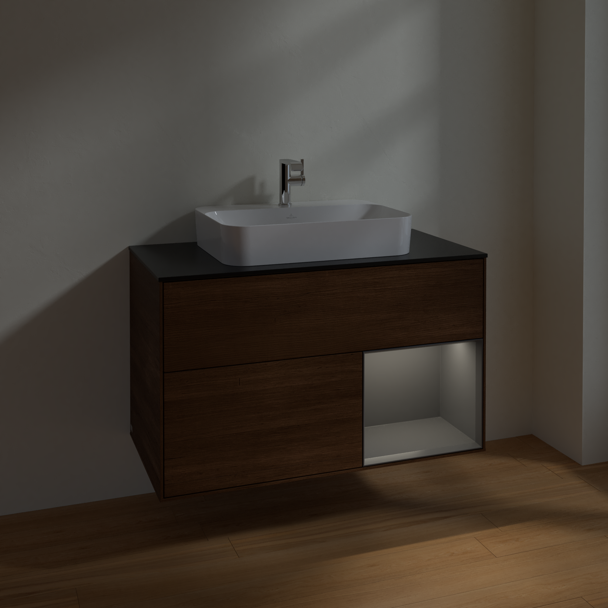 Finion Vanity unit, with lighting, 2 pull-out compartments, 1000x603x501mm, Body: Walnut Veneer, Front: Walnut Veneer, Shelf: Anthracite Matt Lacquer, Cover plate: Glass Black Matt