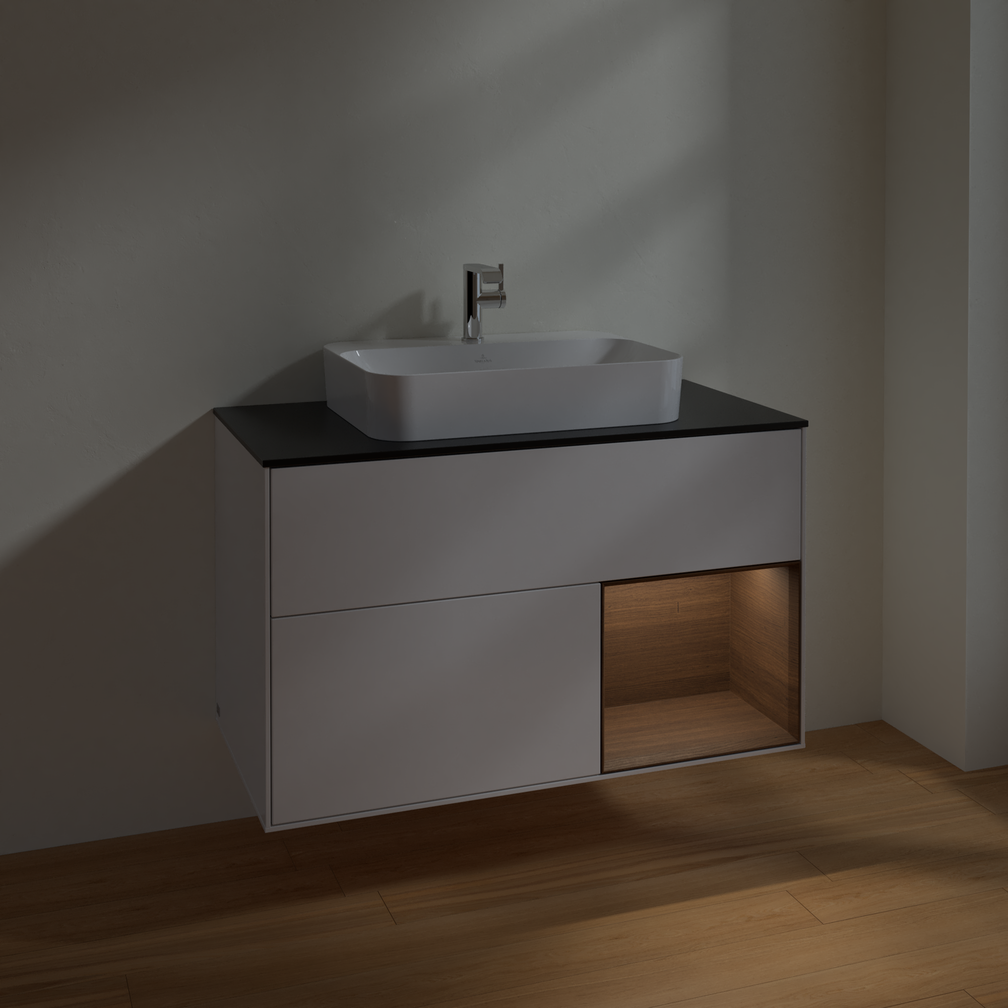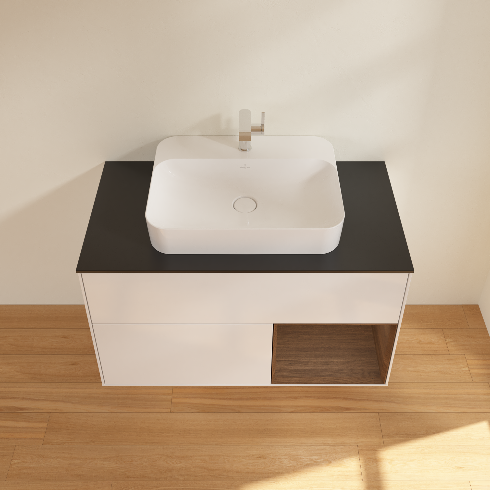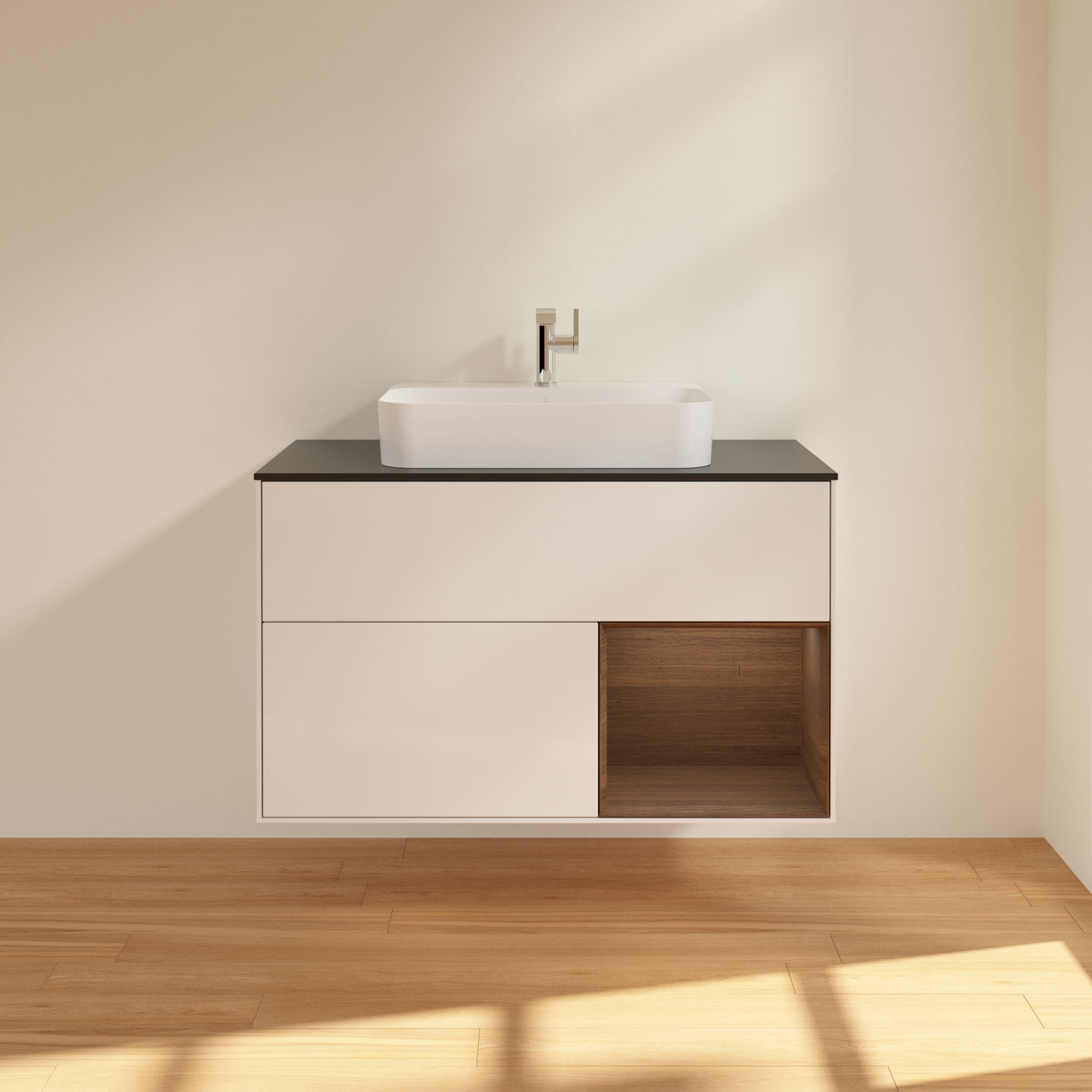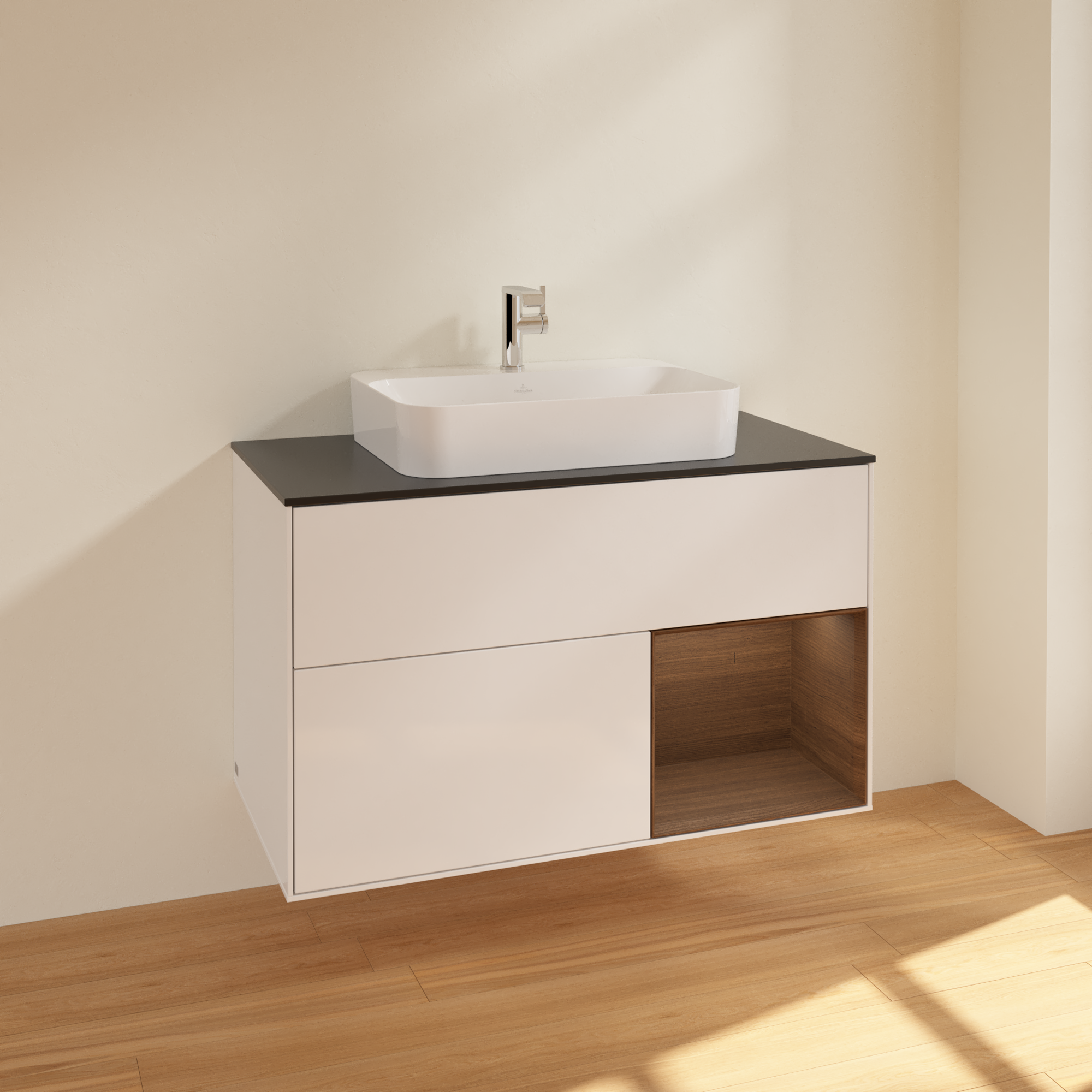 Finion Vanity unit, with lighting, 2 pull-out compartments, 1000x603x501mm, Body: Glossy White Lacquer, Front: Glossy White Lacquer, Shelf: Walnut Veneer, Cover plate: Glass Black Matt