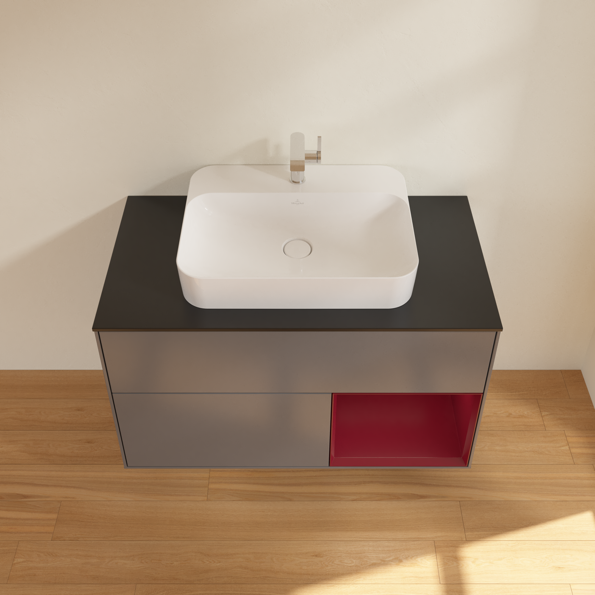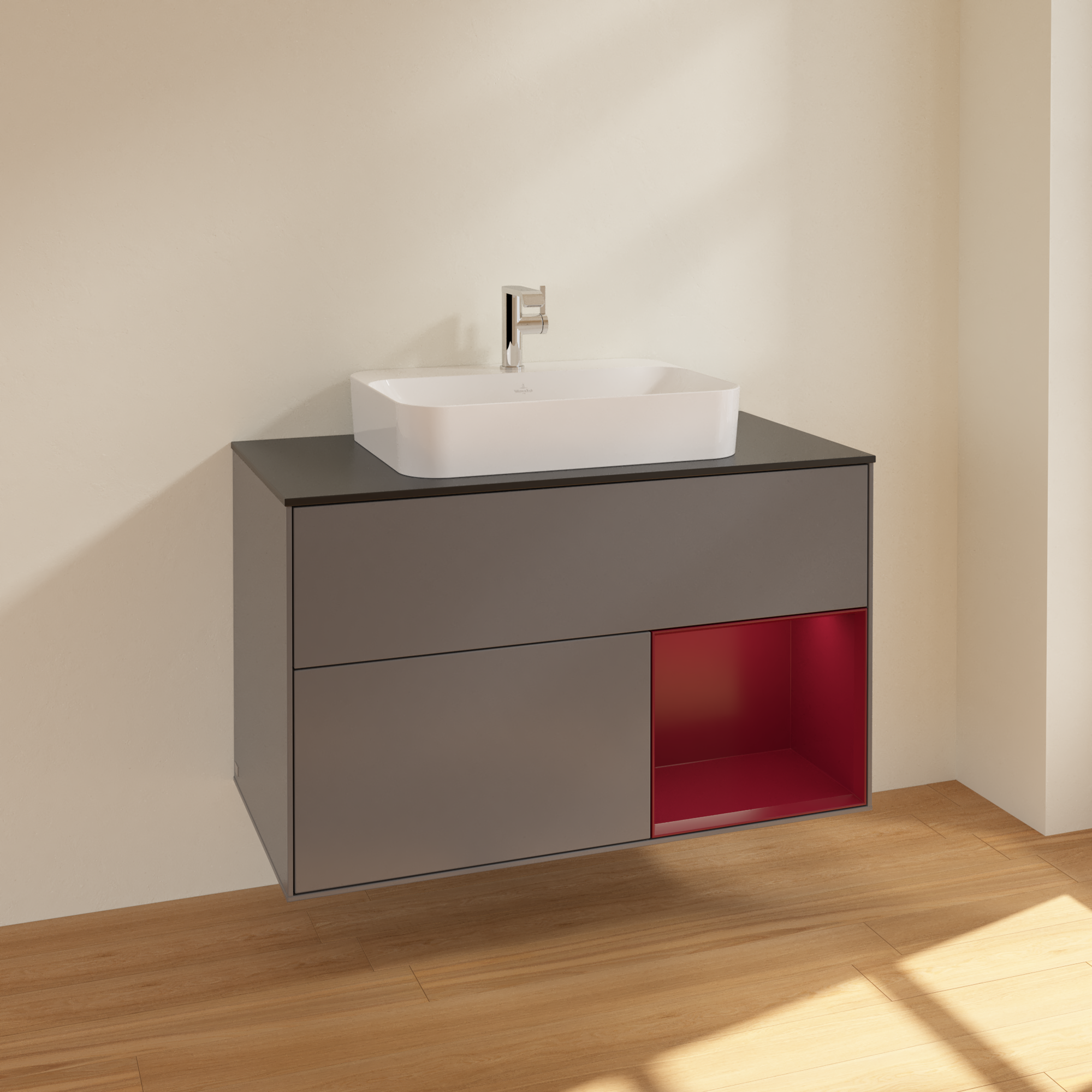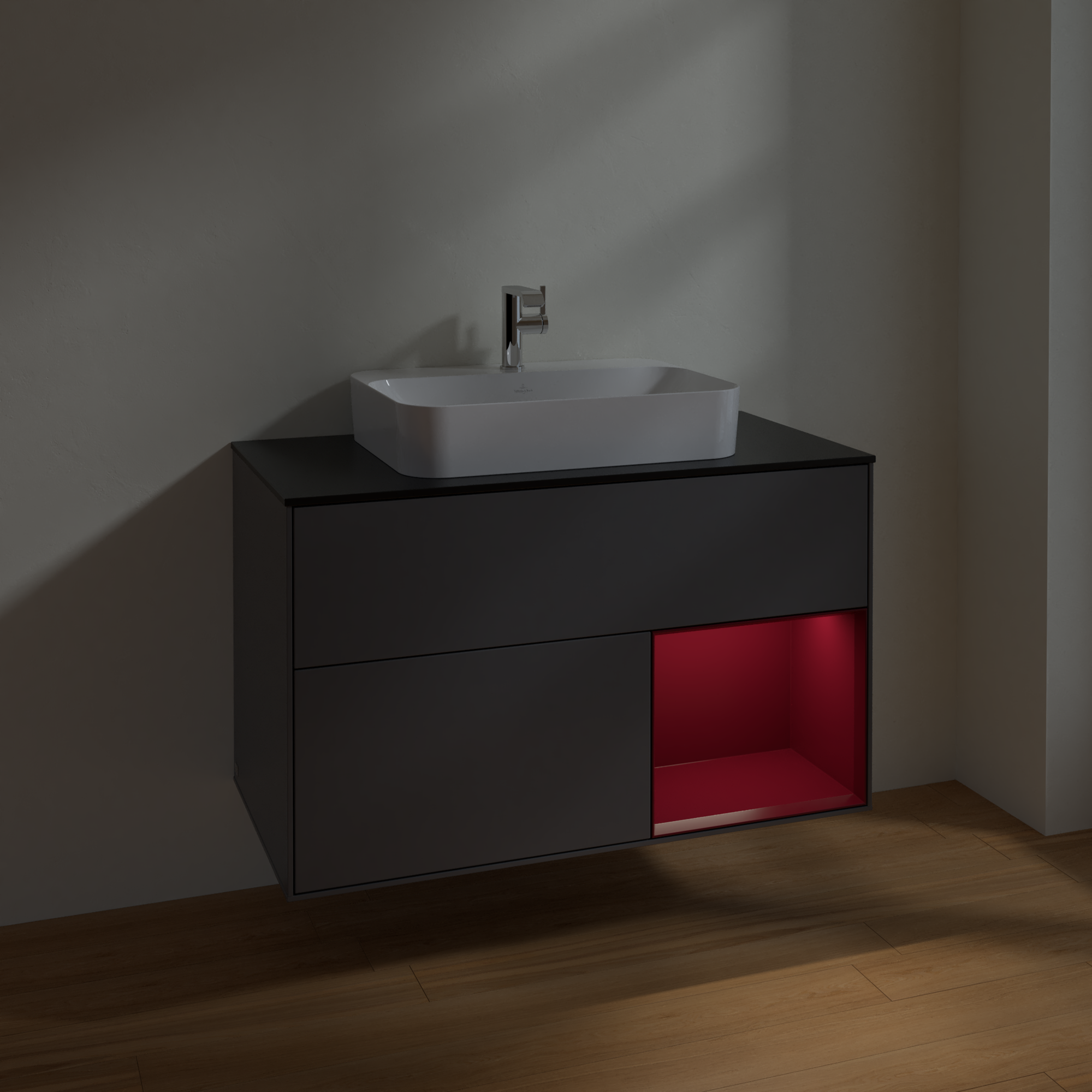 Finion Vanity unit, with lighting, 2 pull-out compartments, 1000x603x501mm, Body: Anthracite Matt Lacquer, Front: Anthracite Matt Lacquer, Shelf: Peony Matt Lacquer, Cover plate: Glass Black Matt