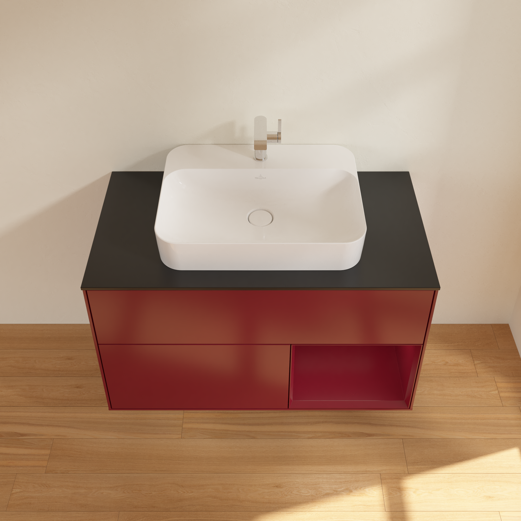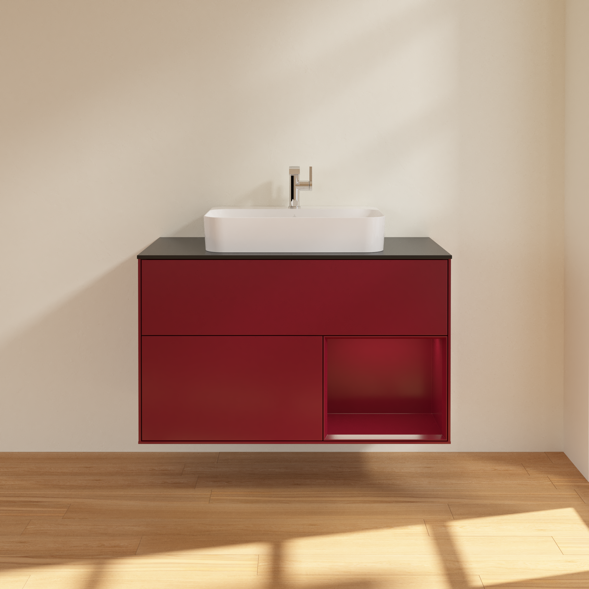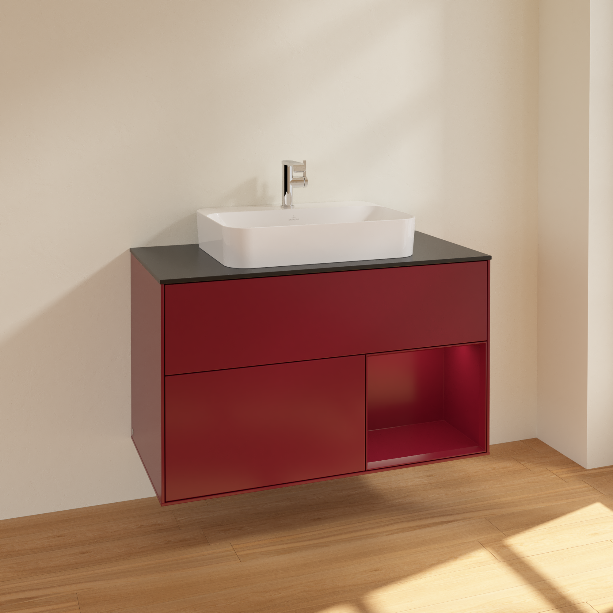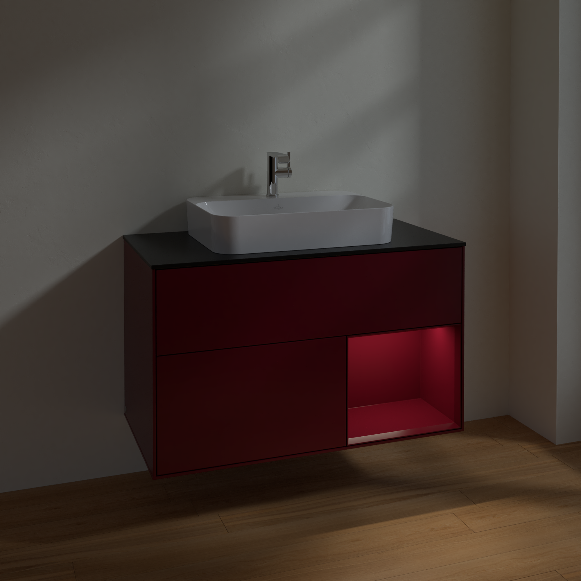 Finion Vanity unit, with lighting, 2 pull-out compartments, 1000x603x501mm, Body: Peony Matt Lacquer, Front: Peony Matt Lacquer, Shelf: Peony Matt Lacquer, Cover plate: Glass Black Matt