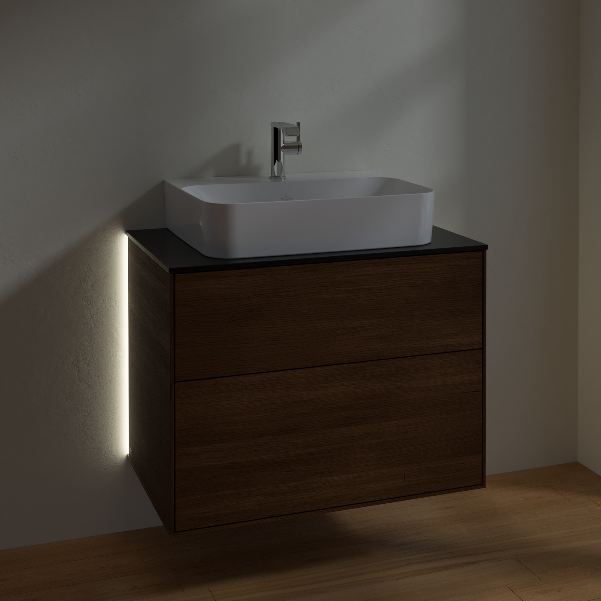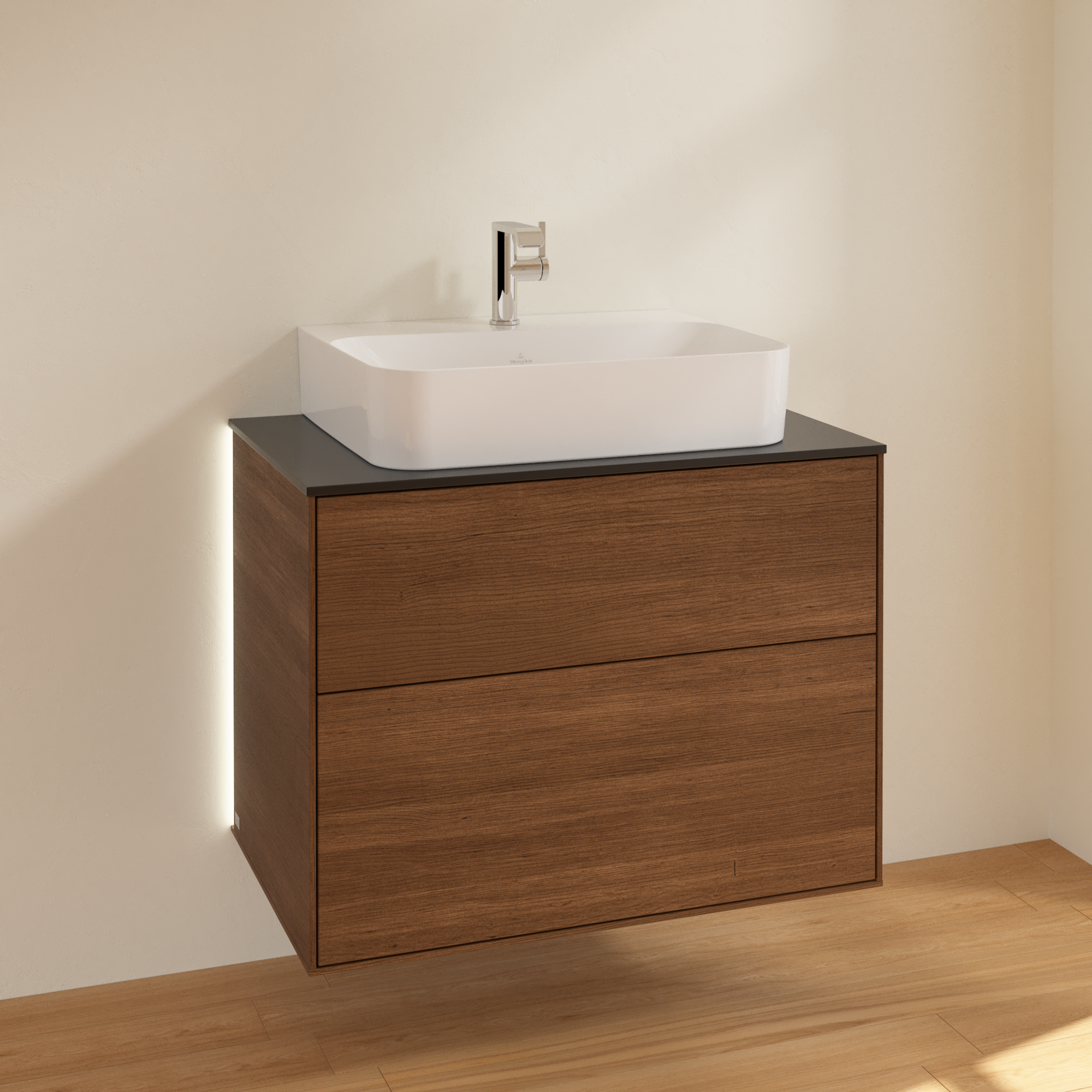 Finion Vanity unit, with lighting, 2 pull-out compartments, 800x603x501mm, Body: Walnut Veneer, Front: Walnut Veneer, Cover plate: Glass Black Matt