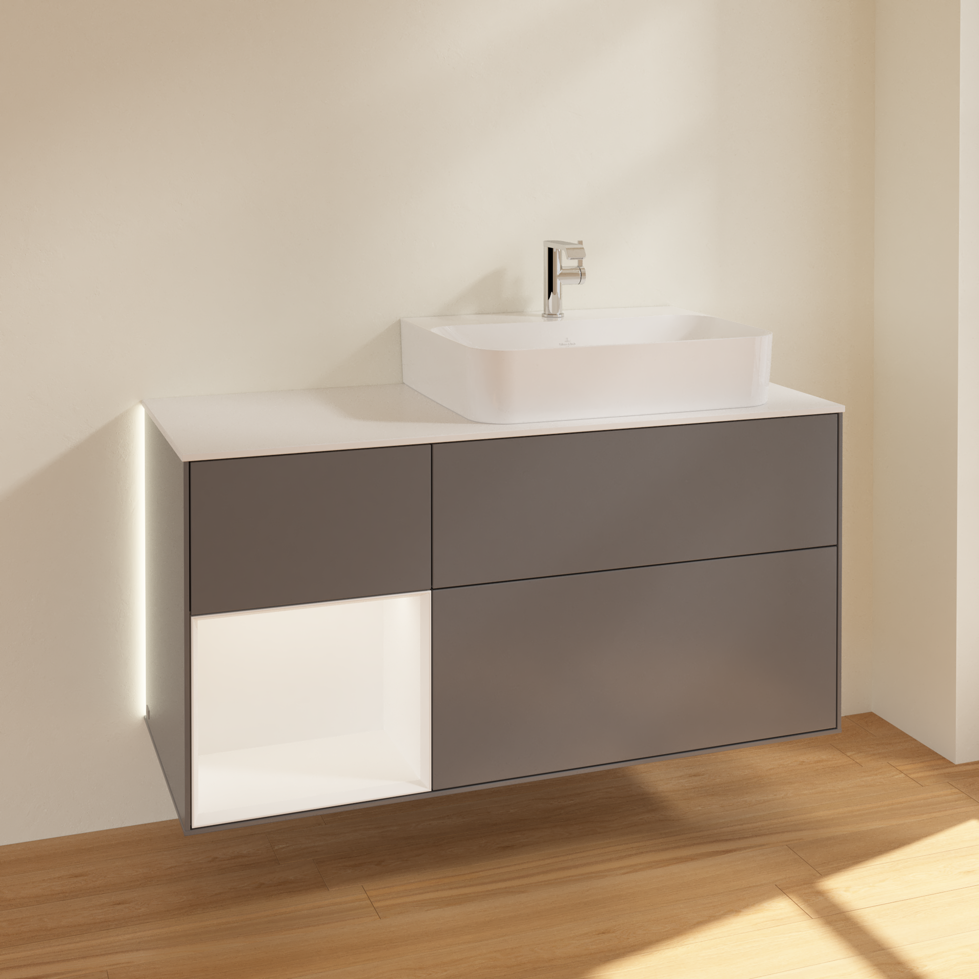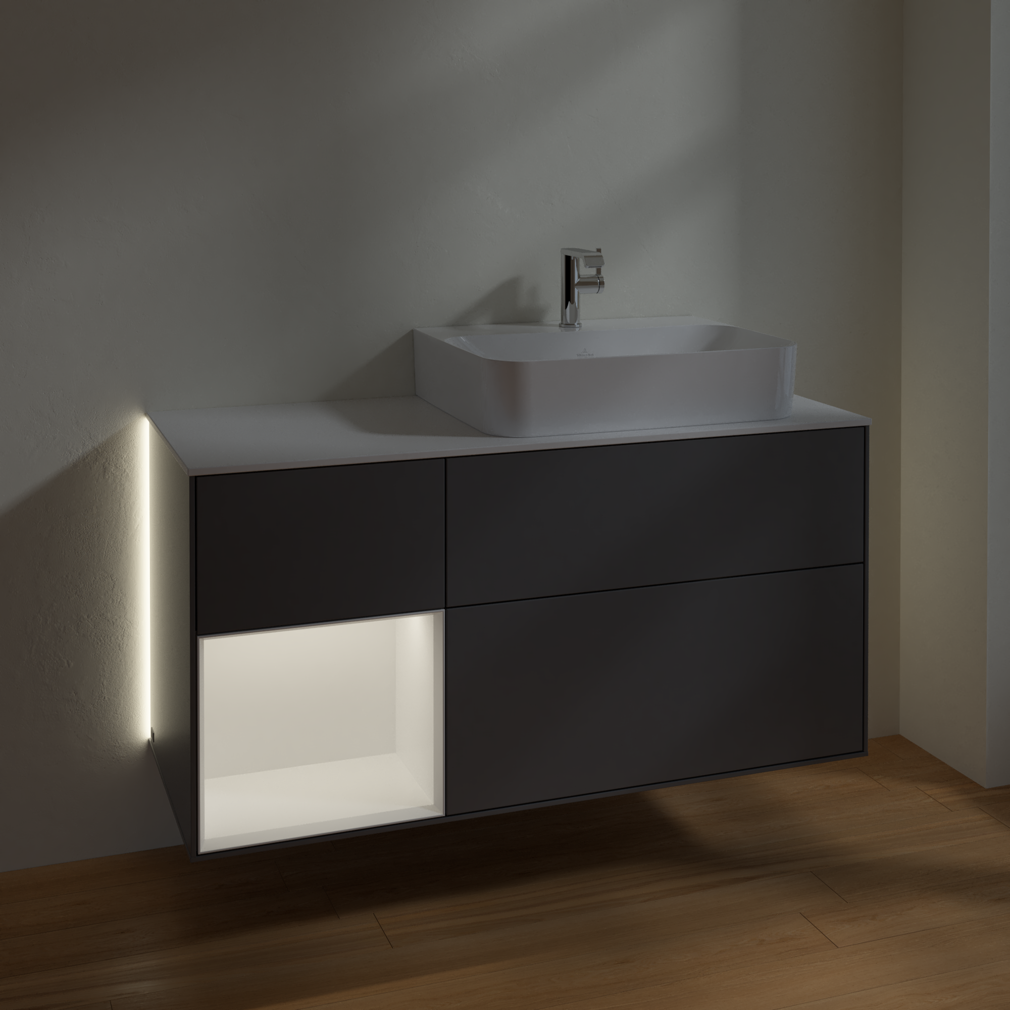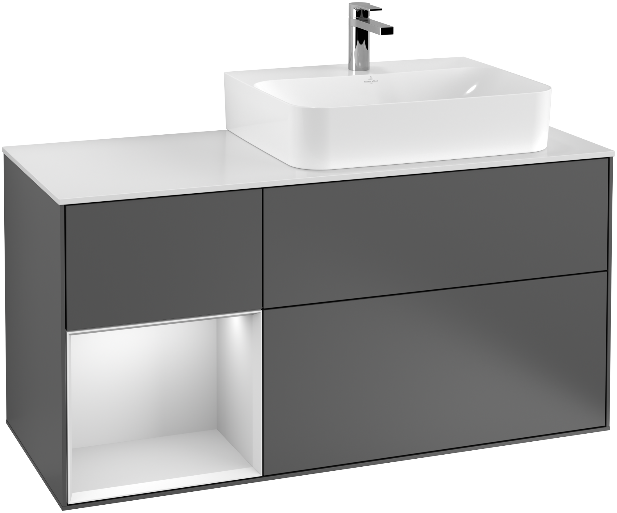 Finion Vanity unit, with lighting, 3 pull-out compartments, 1200x603x501mm, Body: Anthracite Matt Lacquer, Front: Anthracite Matt Lacquer, Shelf: White Matt Lacquer, Cover plate: Glass White Matt