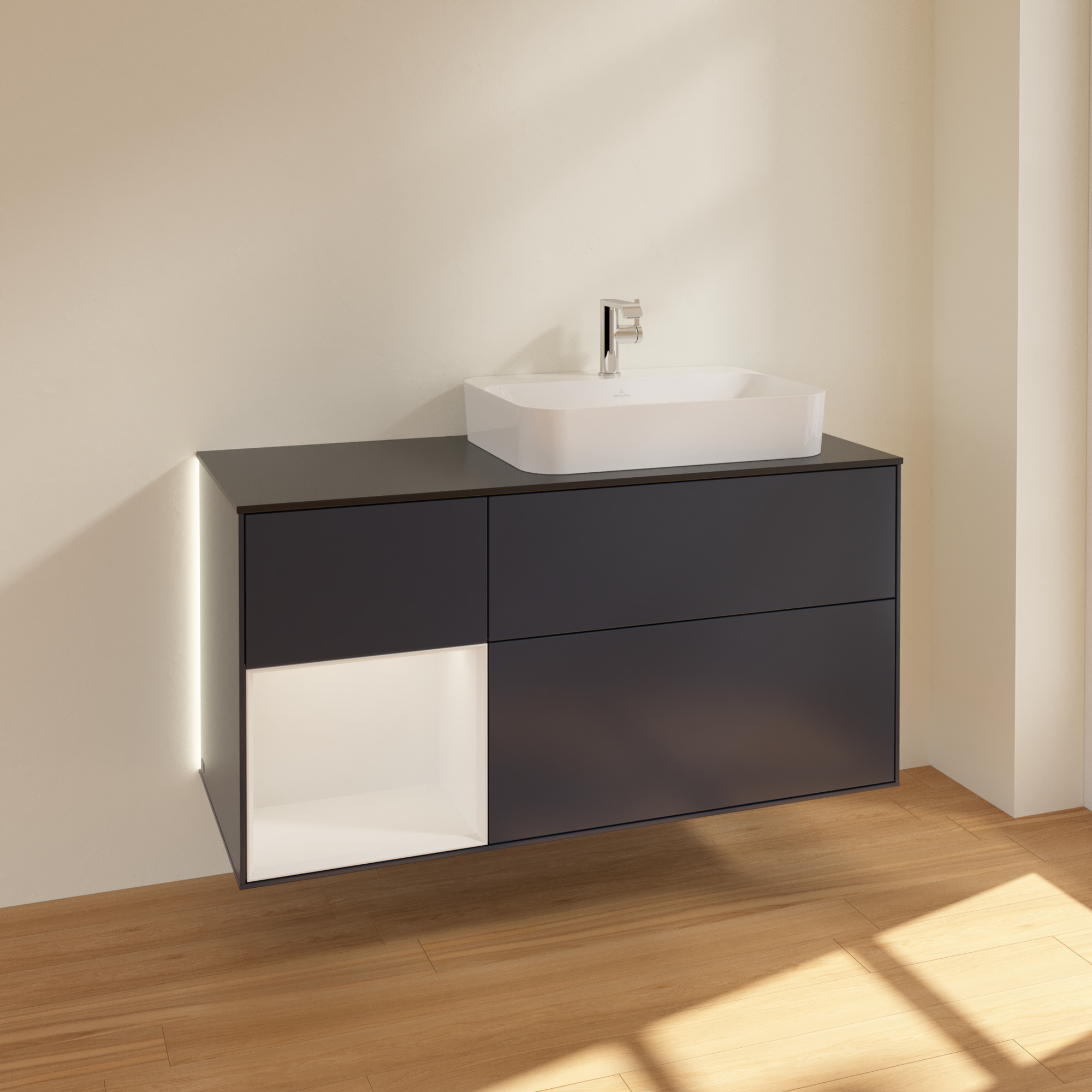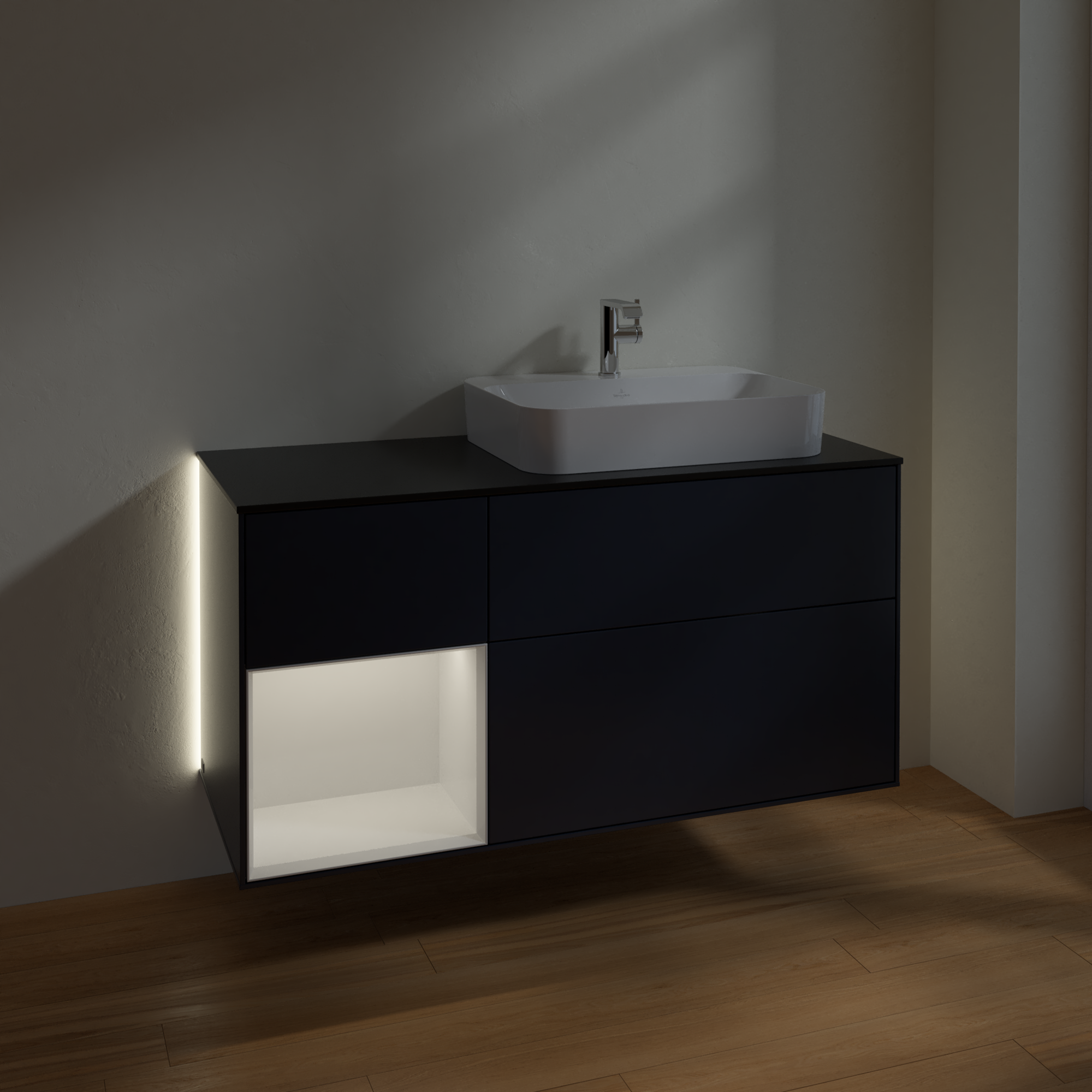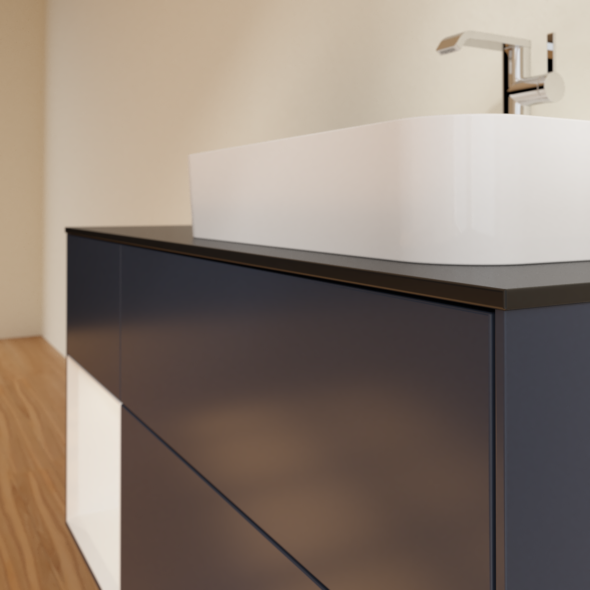 Finion Vanity unit, with lighting, 3 pull-out compartments, 1200x603x501mm, Body: Midnight Blue Matt Lacquer, Front: Midnight Blue Matt Lacquer, Shelf: Glossy White Lacquer, Cover plate: Glass Black Matt