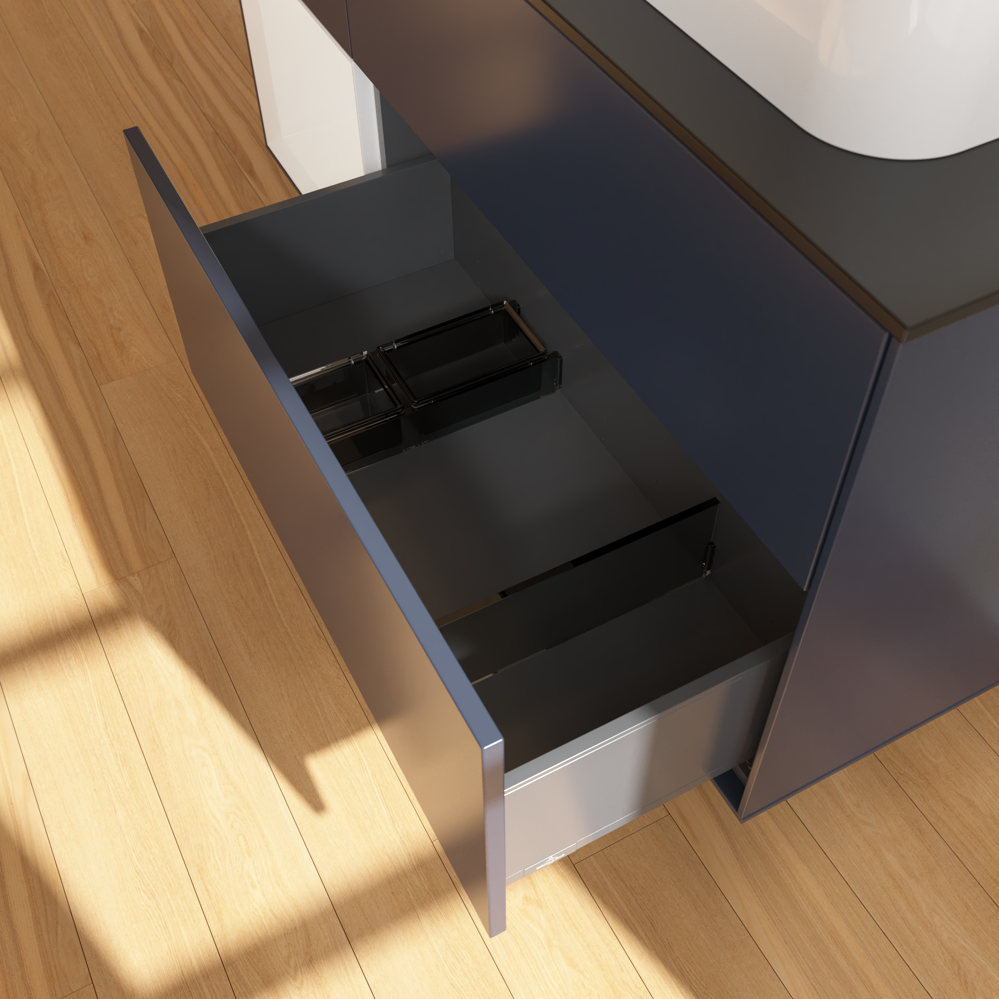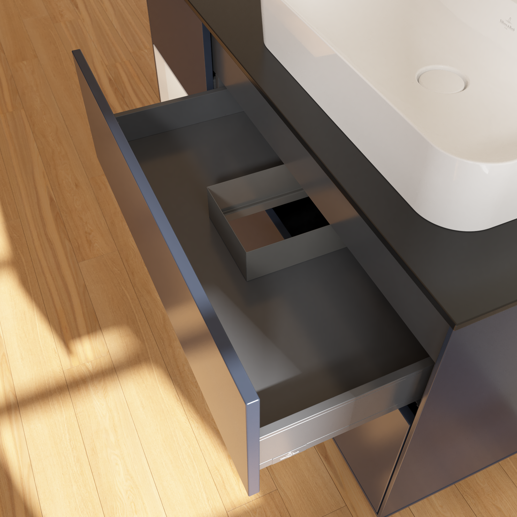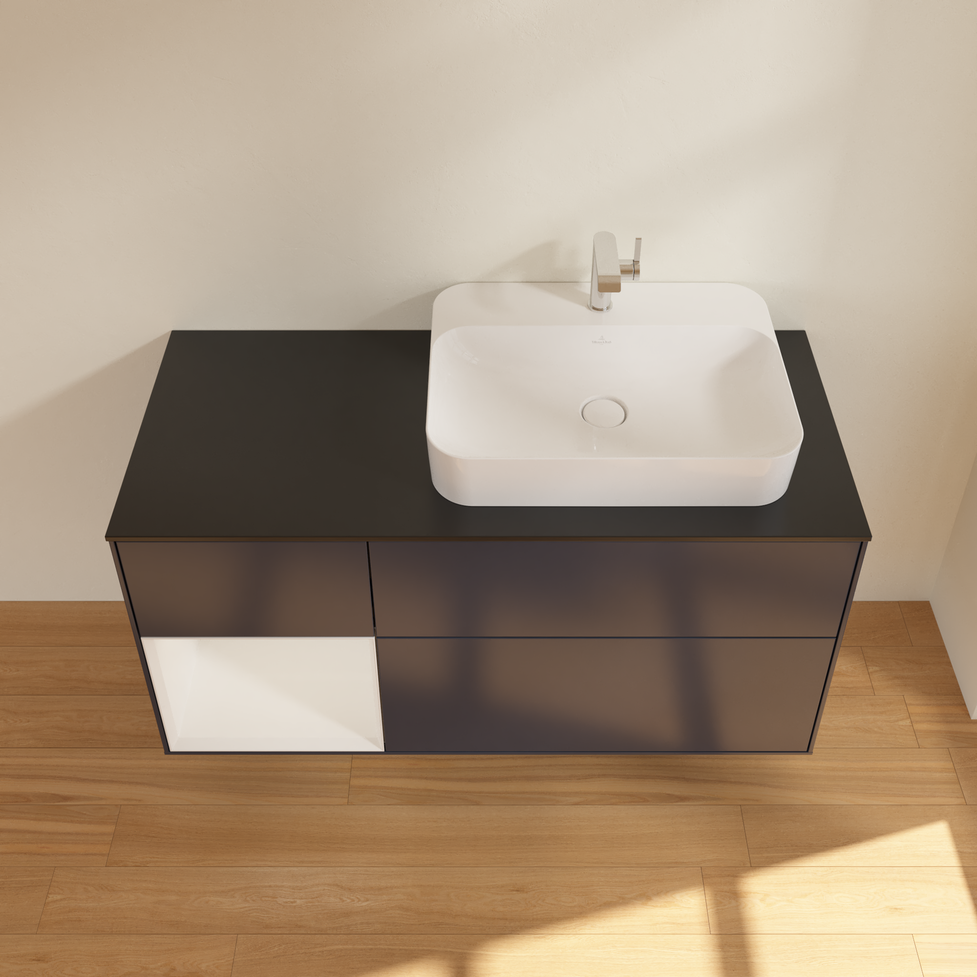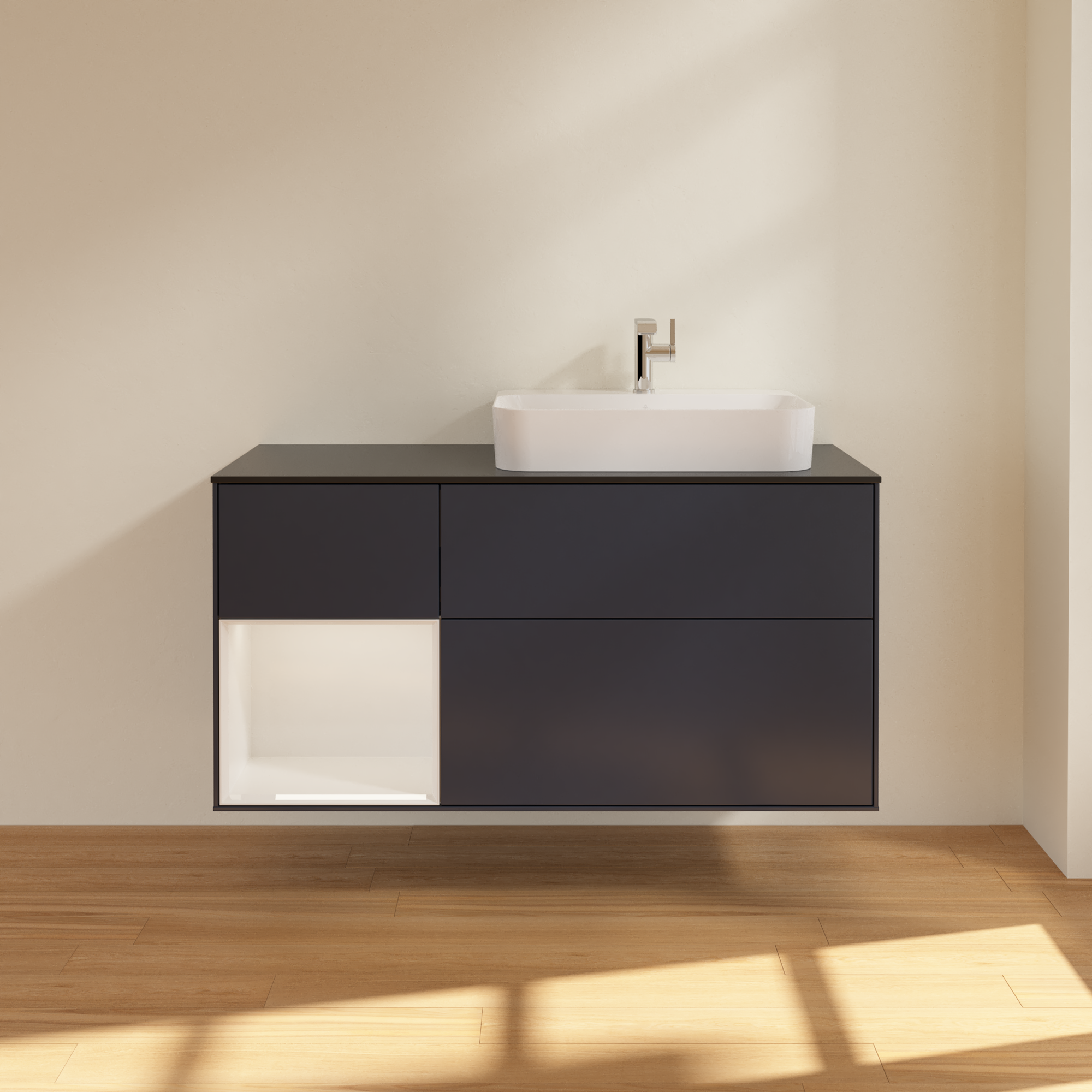 Finion Vanity unit, with lighting, 3 pull-out compartments, 1200x603x501mm, Body: Midnight Blue Matt Lacquer, Front: Midnight Blue Matt Lacquer, Shelf: Glossy White Lacquer, Cover plate: Glass Black Matt
