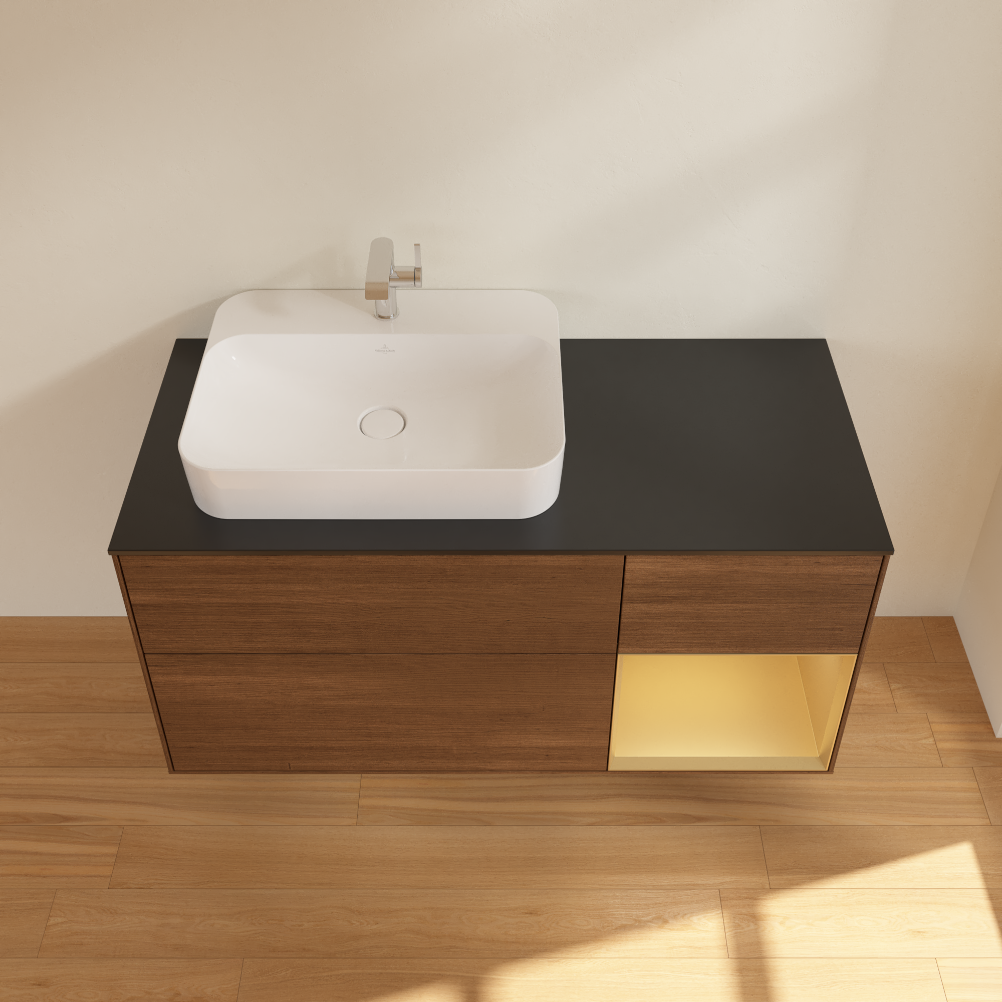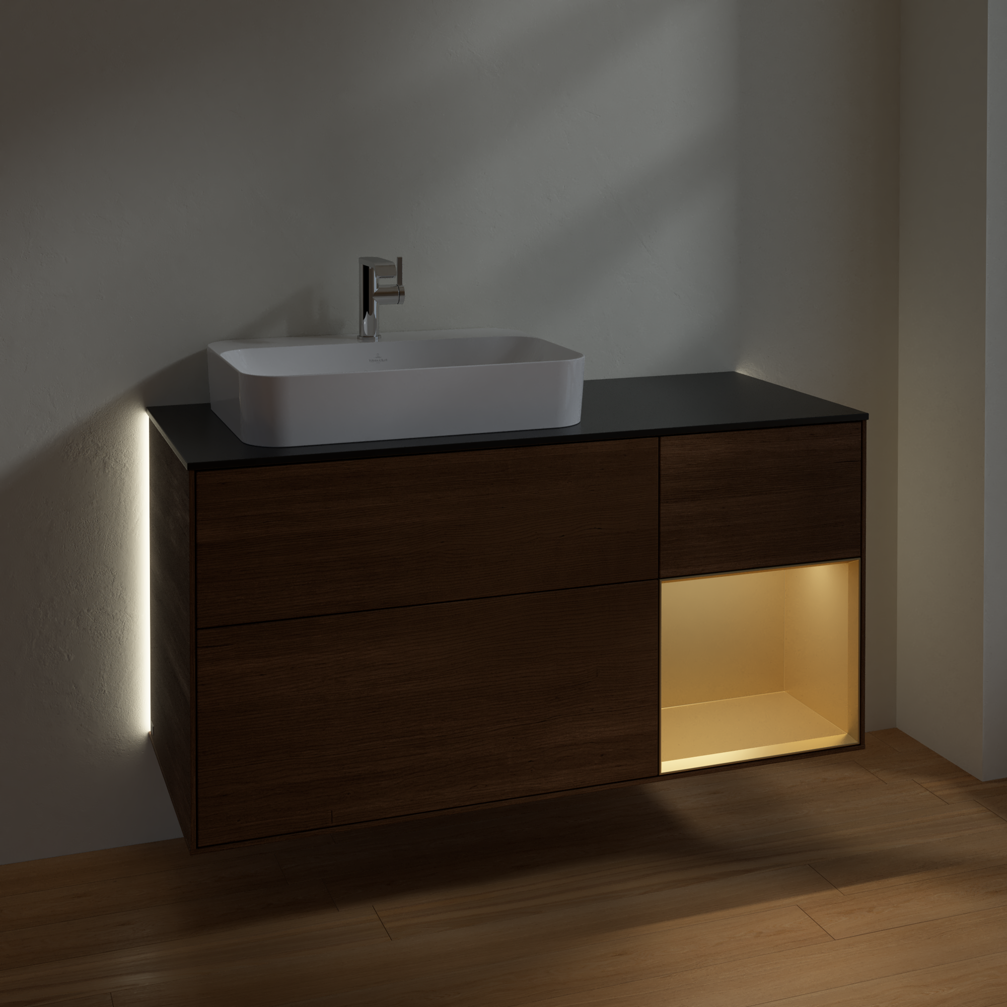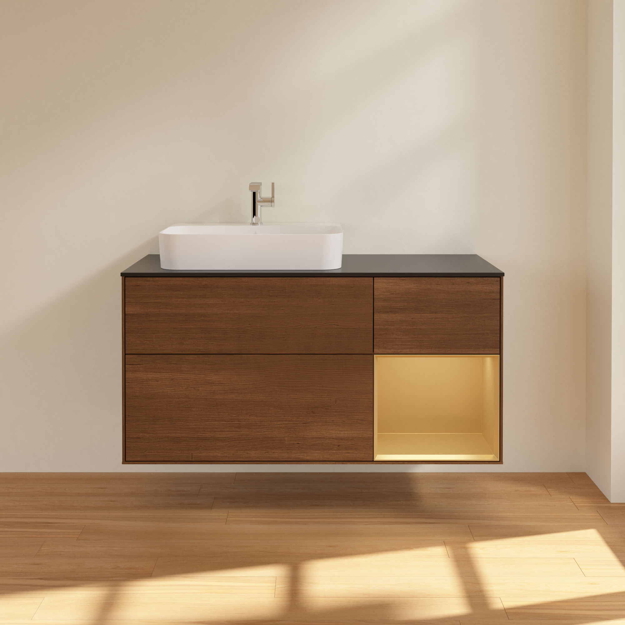 Finion Vanity unit, with lighting, 3 pull-out compartments, 1200x603x501mm, Body: Walnut Veneer, Front: Walnut Veneer, Shelf: Gold Matt Lacquer, Cover plate: Glass Black Matt