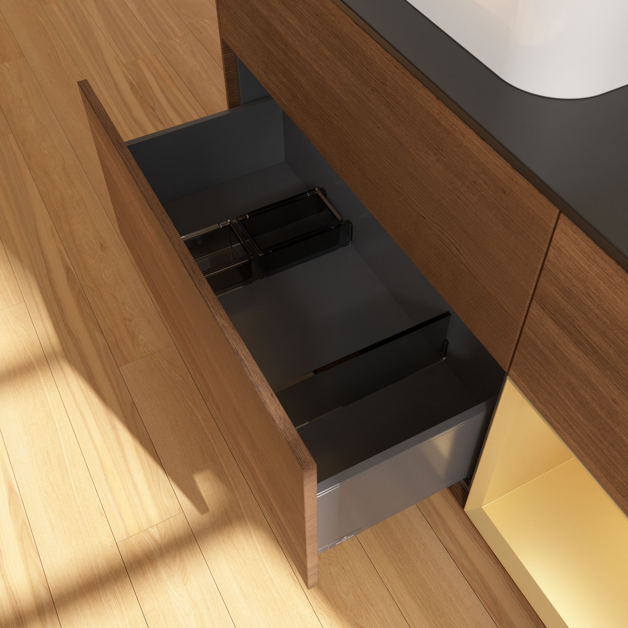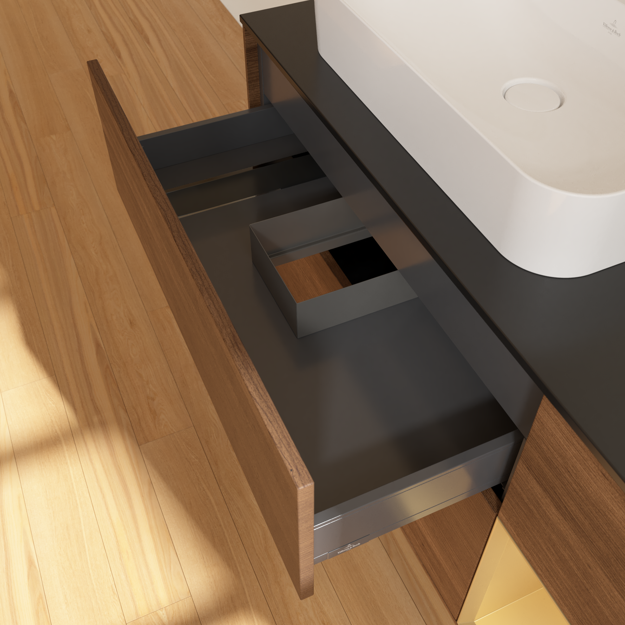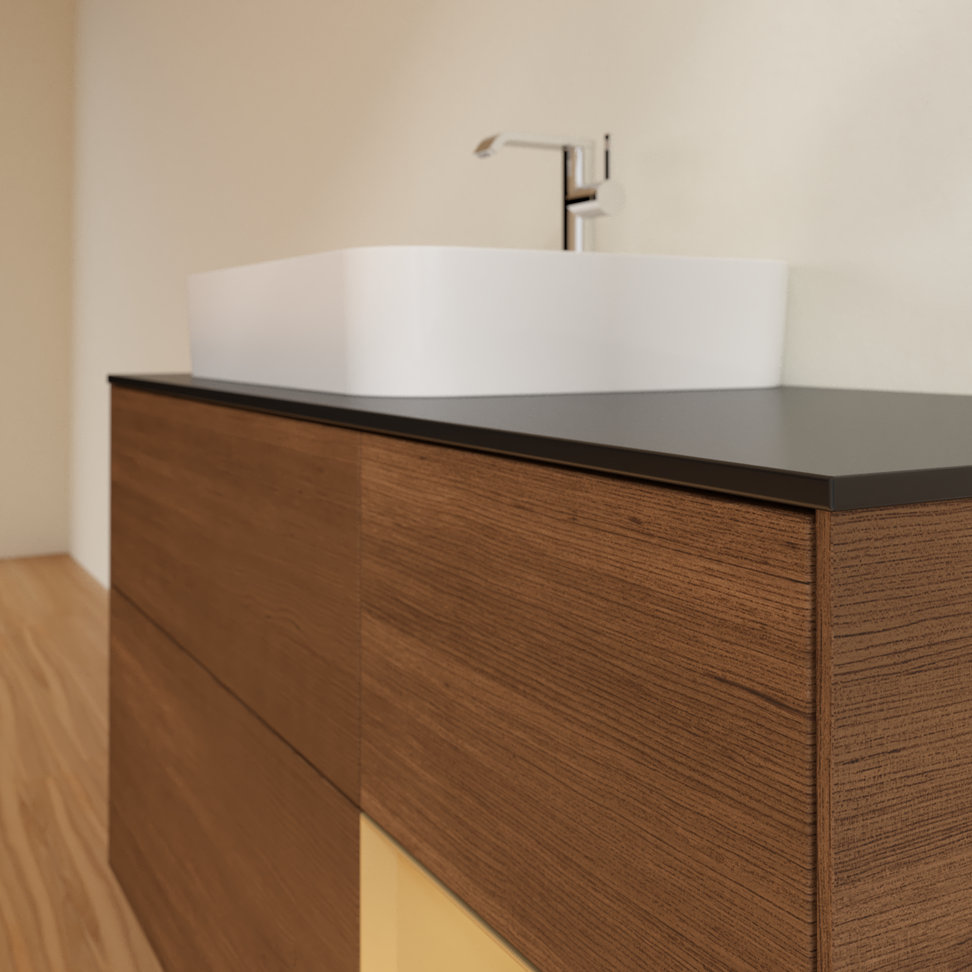 Finion Vanity unit, with lighting, 3 pull-out compartments, 1200x603x501mm, Body: Walnut Veneer, Front: Walnut Veneer, Shelf: Gold Matt Lacquer, Cover plate: Glass Black Matt