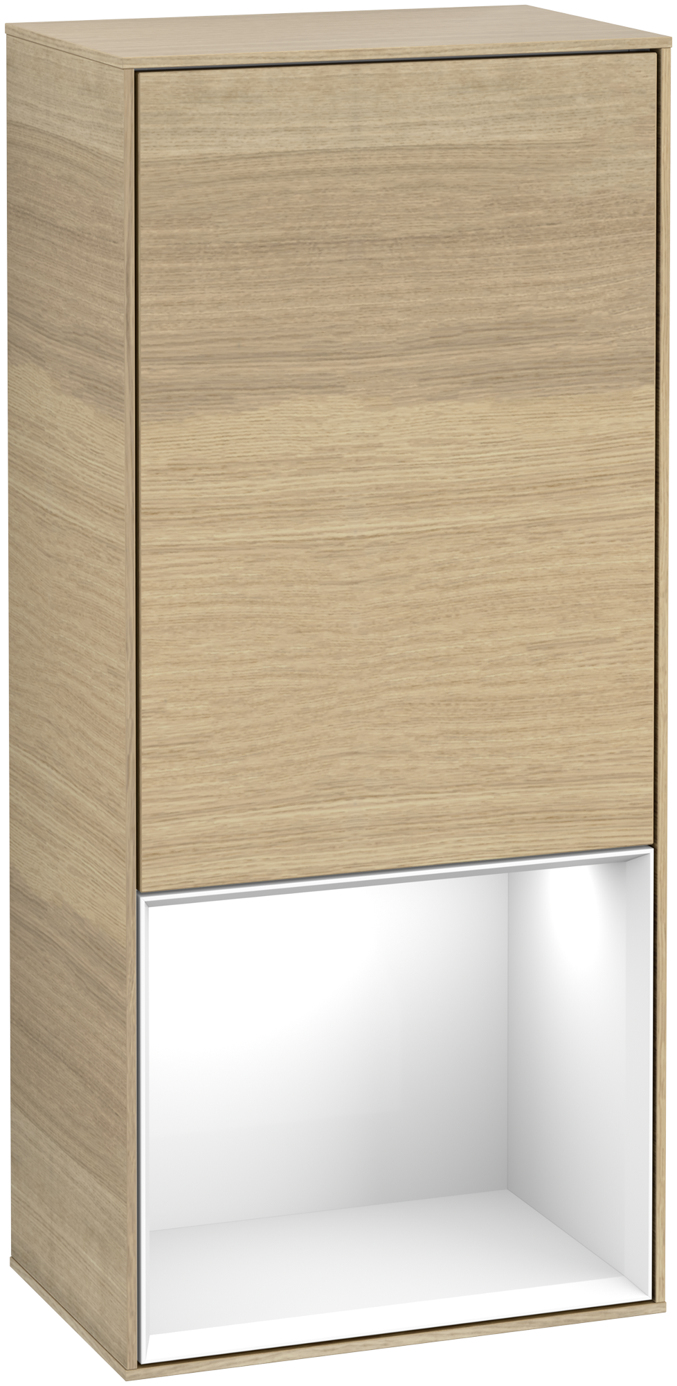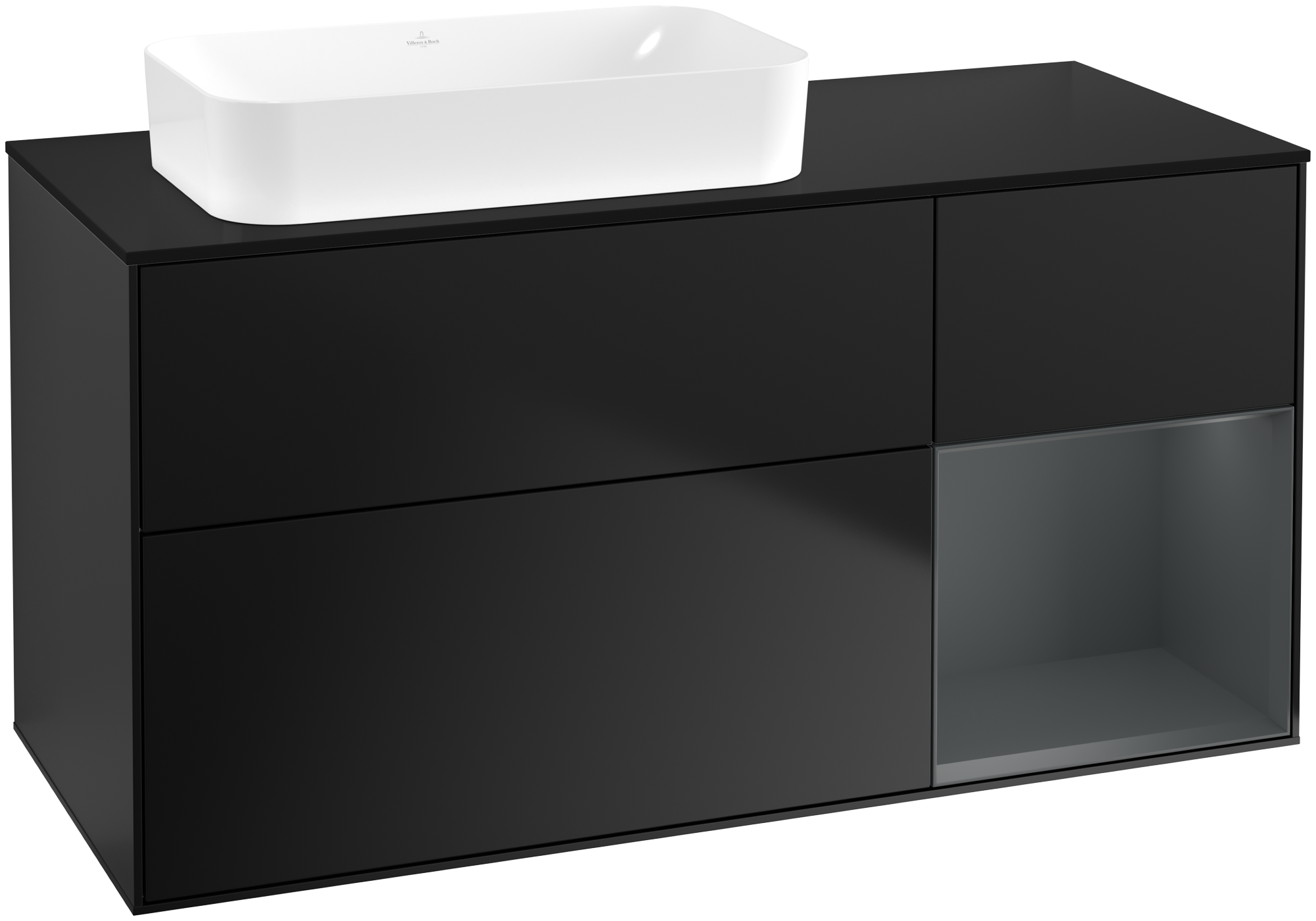 • High-quality surfaces in 10 gloss paint colours and 1 wood veneer as well as 2 stylish glass shelves for surface-mounted washbasins
