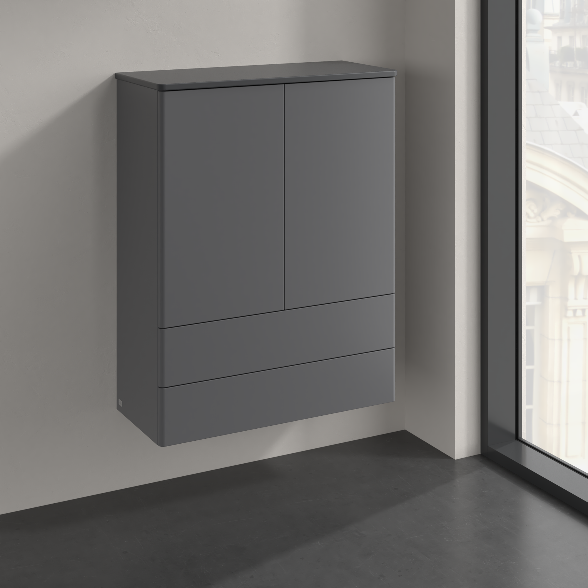 Antao Highboard, 2 doors, 814x1039x356mm, Front without structure, Body: Anthracite Matt Lacquer, Front: Anthracite Matt Lacquer, Cover plate: Anthracite Matt Lacquer