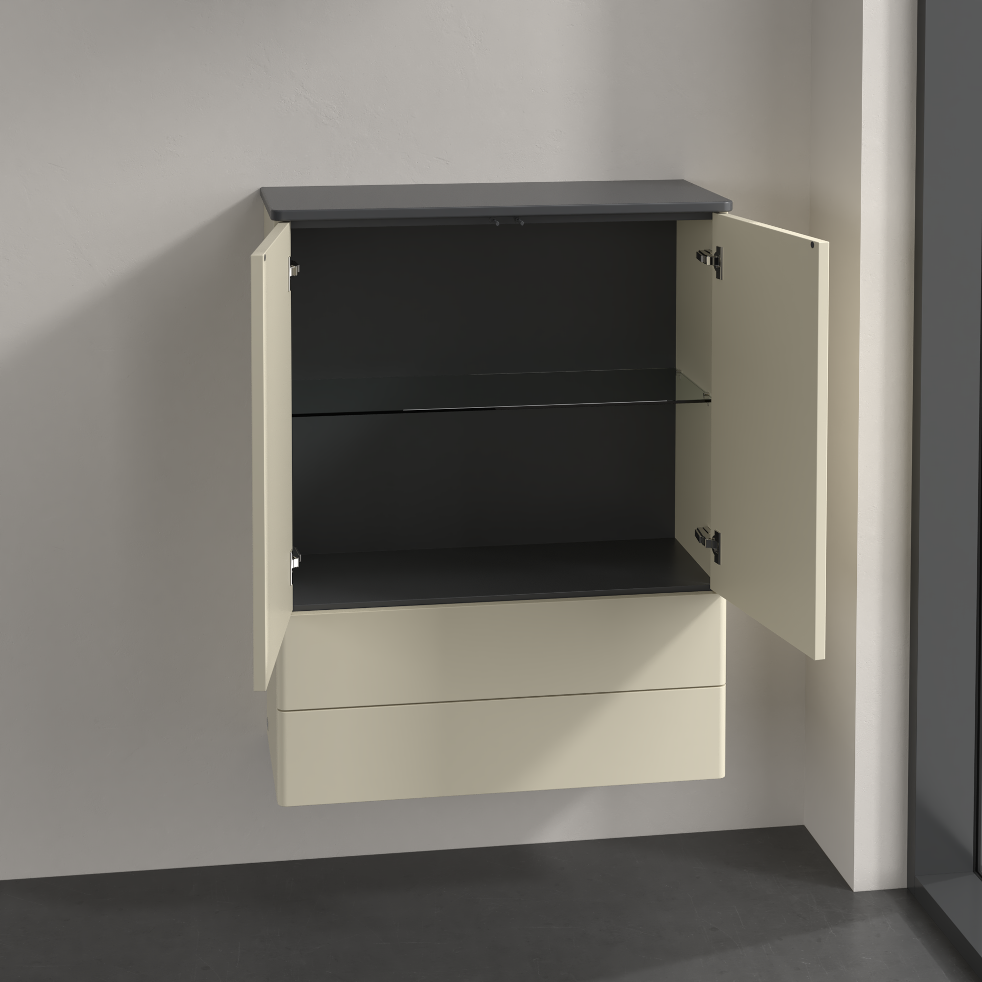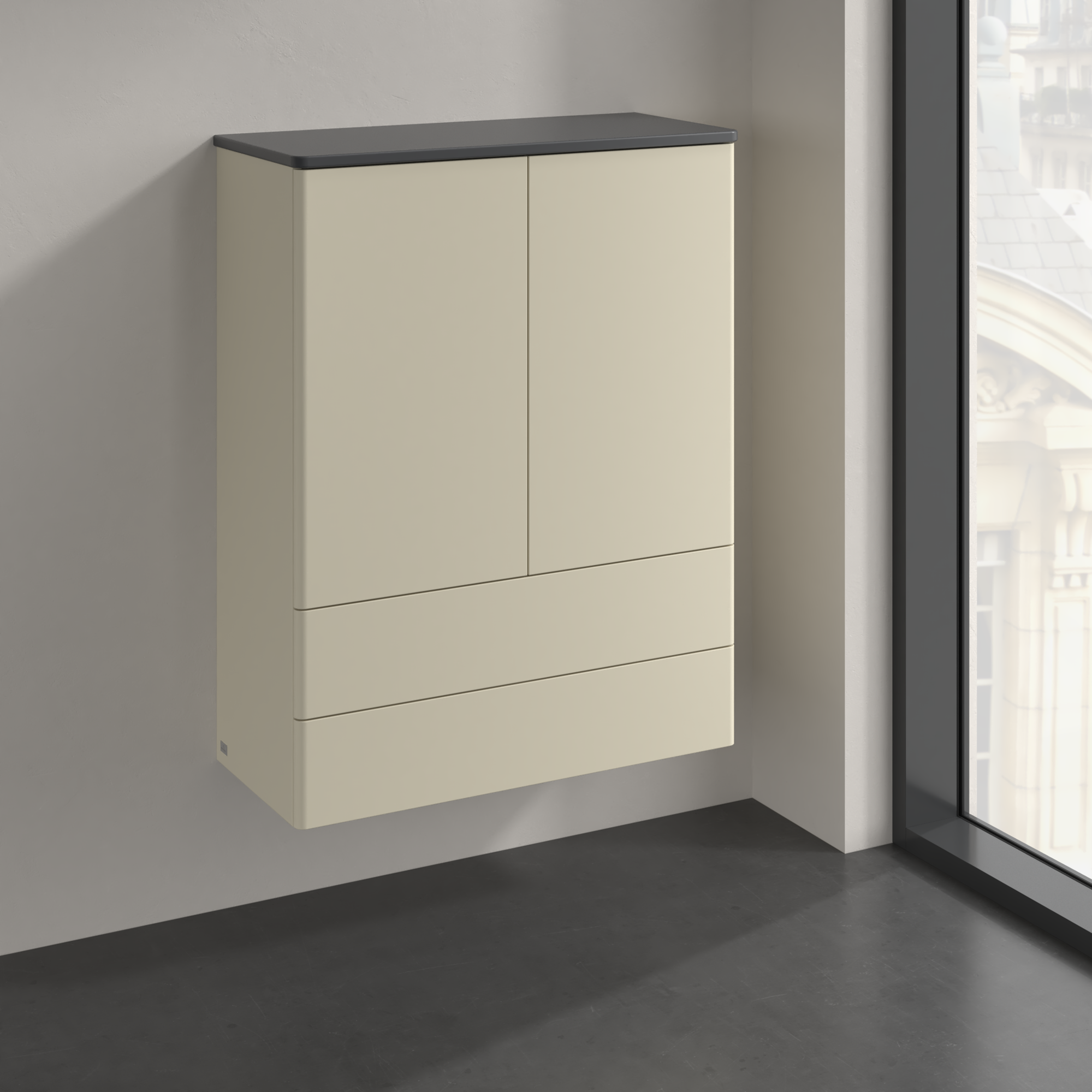 Antao Highboard, 2 doors, 814x1039x356mm, Front without structure, Body: Silk Grey Matt Lacquer, Front: Silk Grey Matt Lacquer, Cover plate: Silk Grey Matt Lacquer
