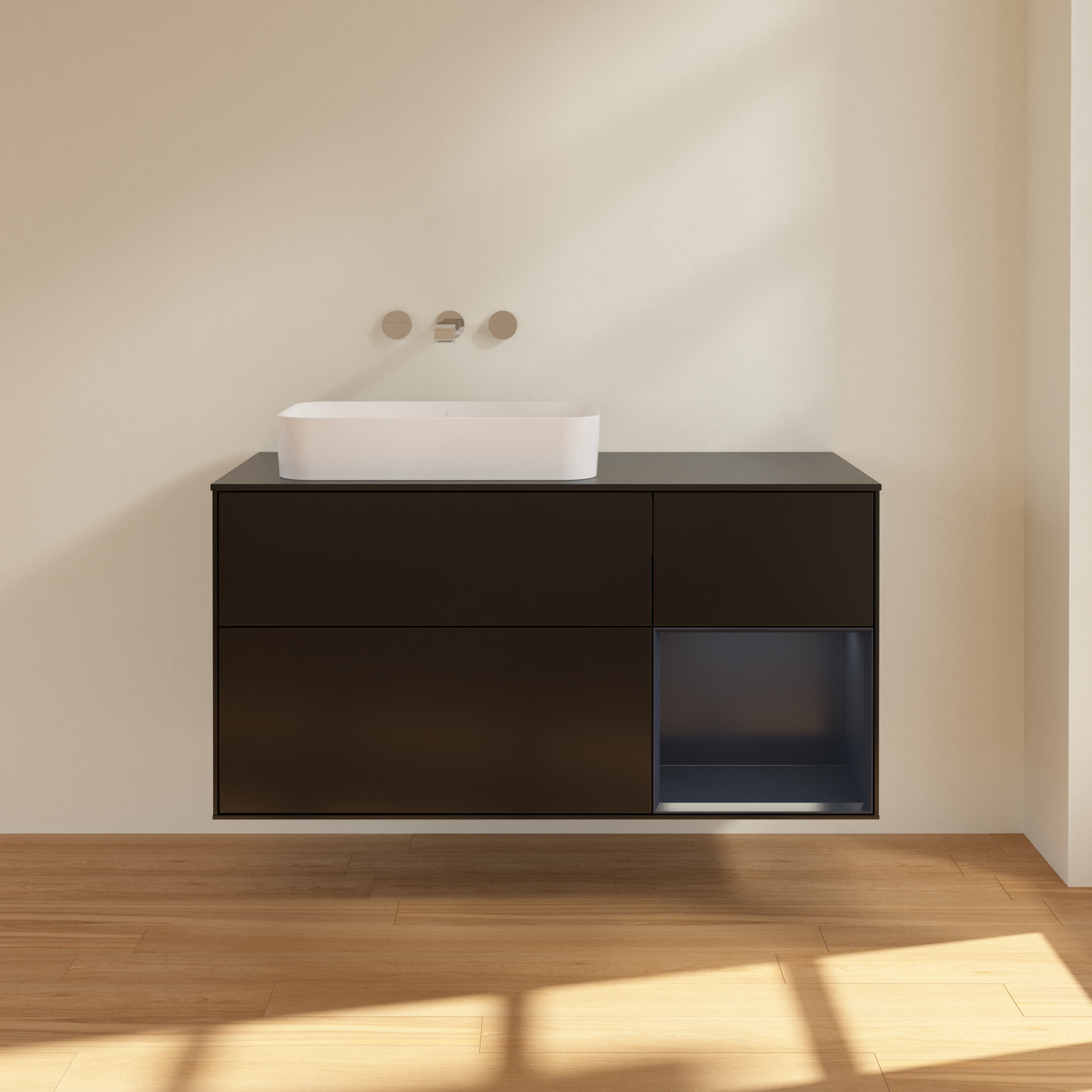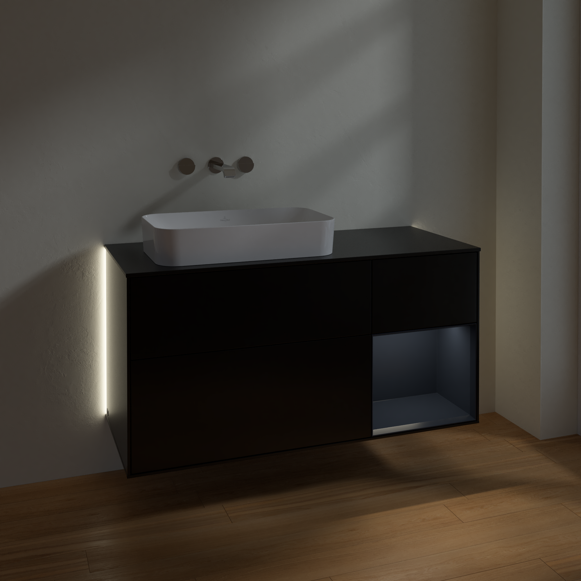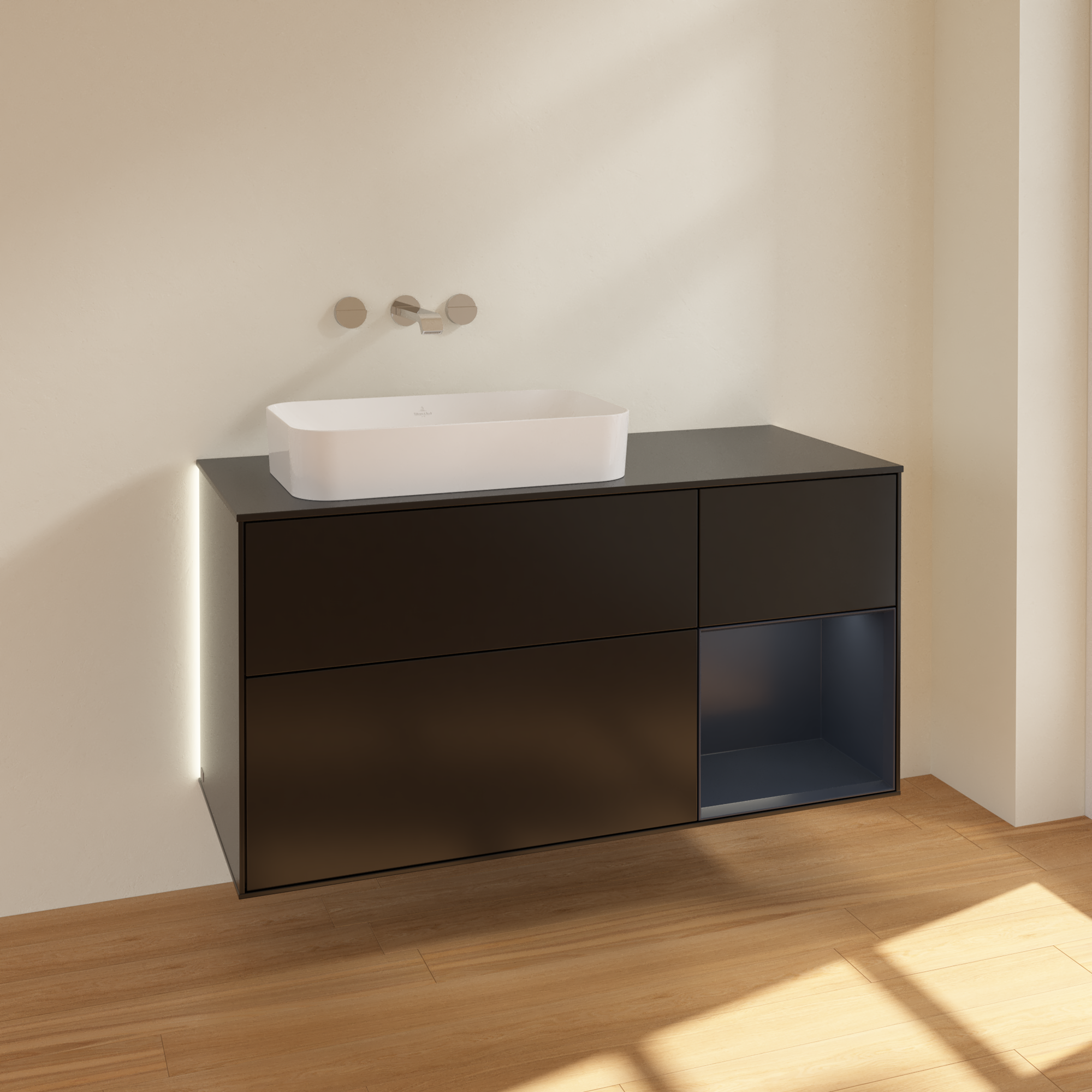 Finion Vanity unit, with lighting, 3 pull-out compartments, 1200x603x501mm, Body: Black Matt Lacquer, Front: Black Matt Lacquer, Shelf: Midnight Blue Matt Lacquer, Cover plate: Glass Black Matt