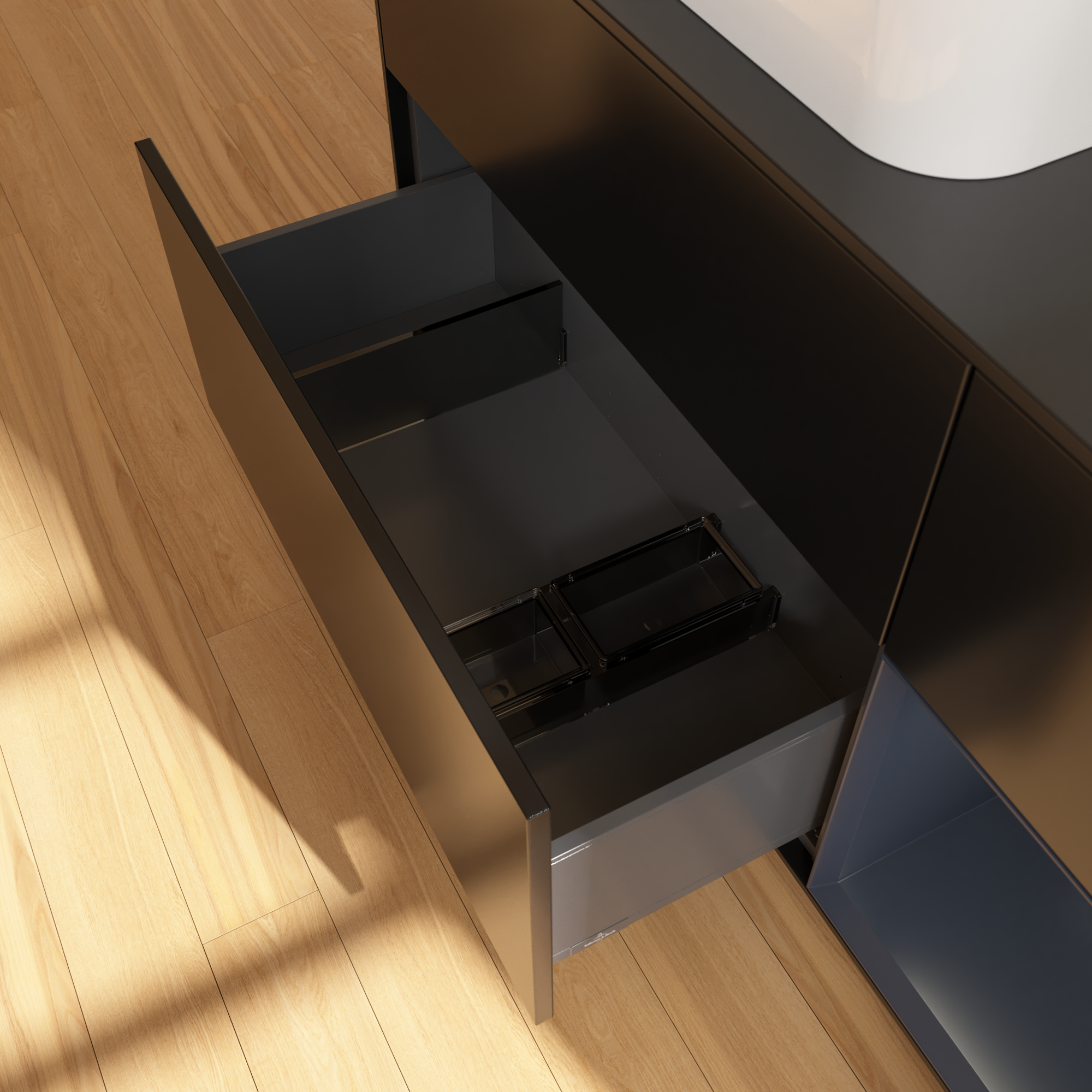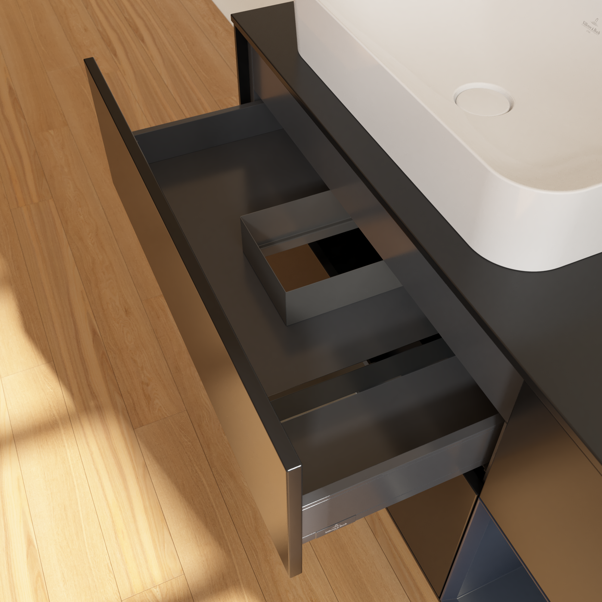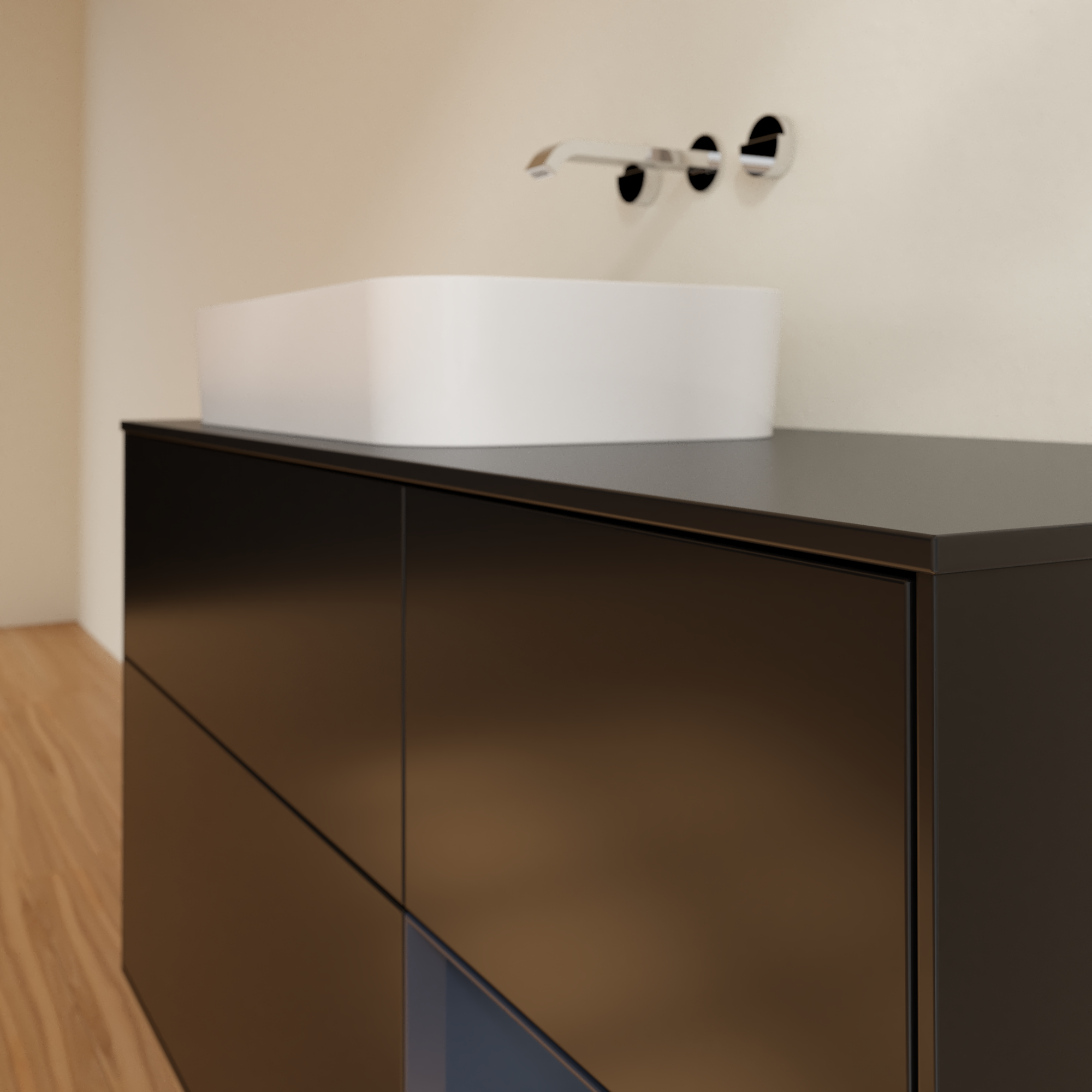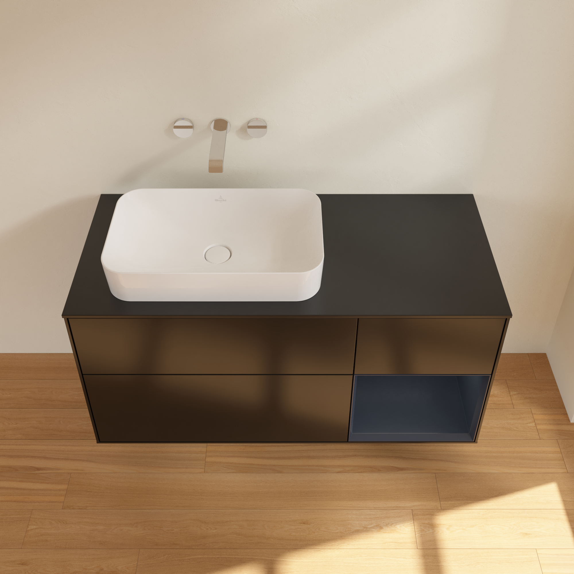 Finion Vanity unit, with lighting, 3 pull-out compartments, 1200x603x501mm, Body: Black Matt Lacquer, Front: Black Matt Lacquer, Shelf: Midnight Blue Matt Lacquer, Cover plate: Glass Black Matt