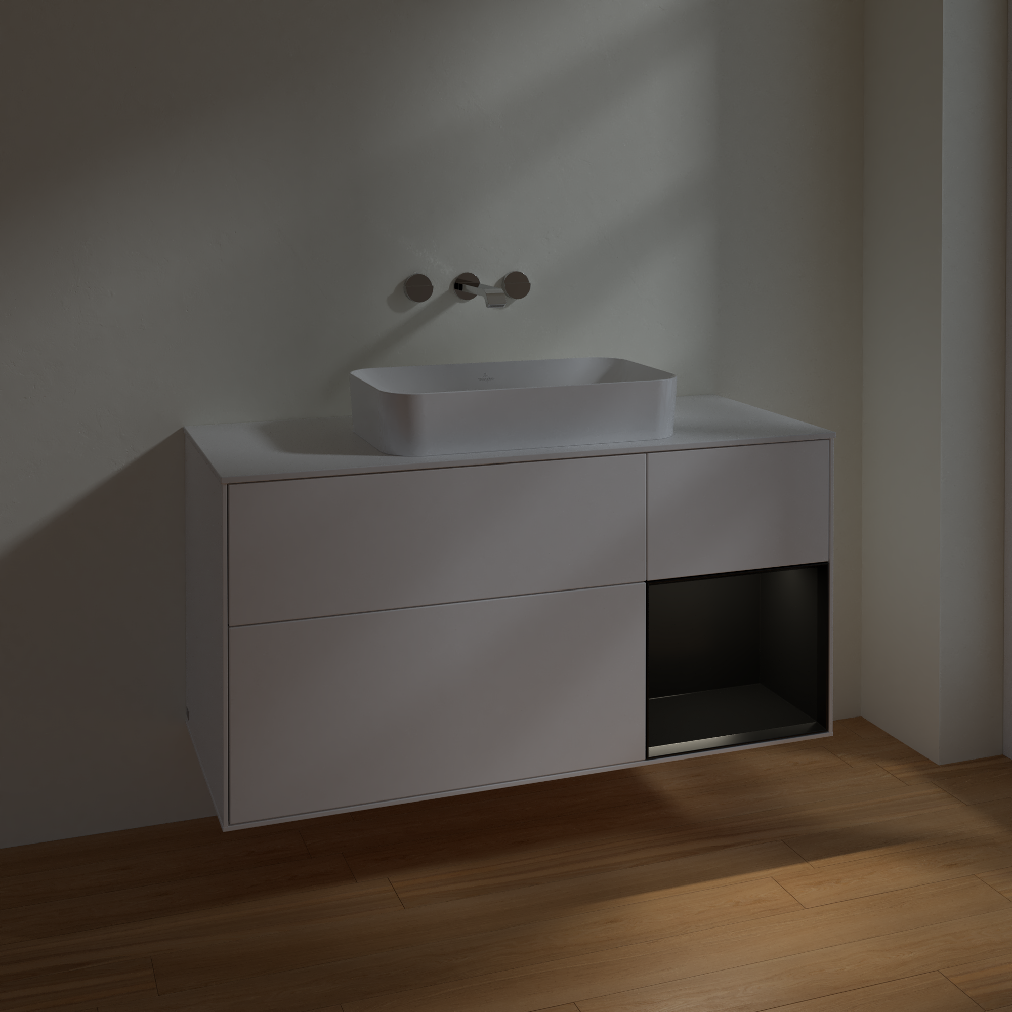 Finion Vanity unit, with lighting, 3 pull-out compartments, 1200x603x501mm, Body: White Matt Lacquer, Front: White Matt Lacquer, Shelf: Black Matt Lacquer, Cover plate: Glass White Matt