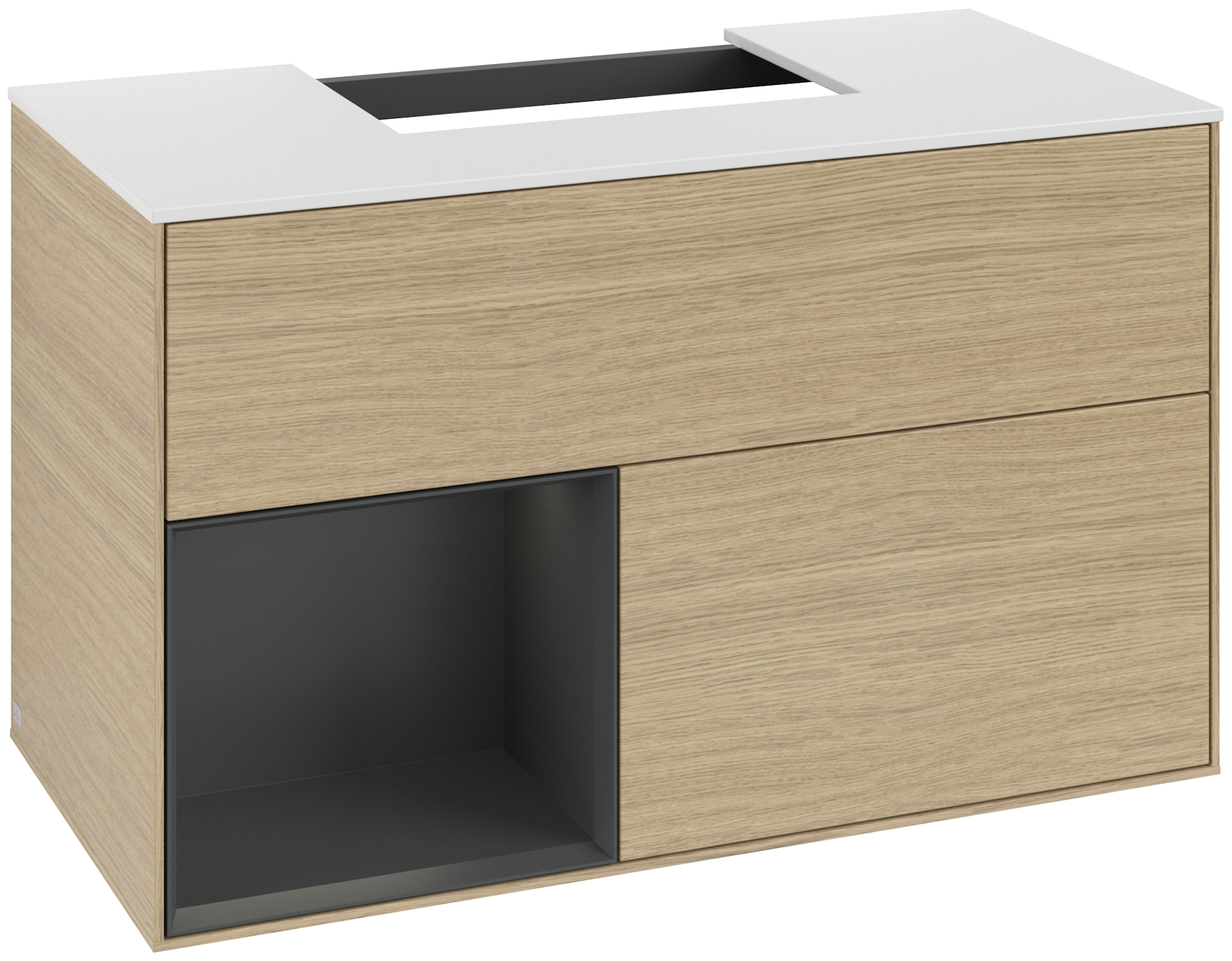 Finion Vanity unit, with lighting, 2 pull-out compartments, 1000x603x501mm, Body: Oak Veneer, Front: Oak Veneer, Shelf: Silk Grey Matt Lacquer, Cover plate: Glass White Matt