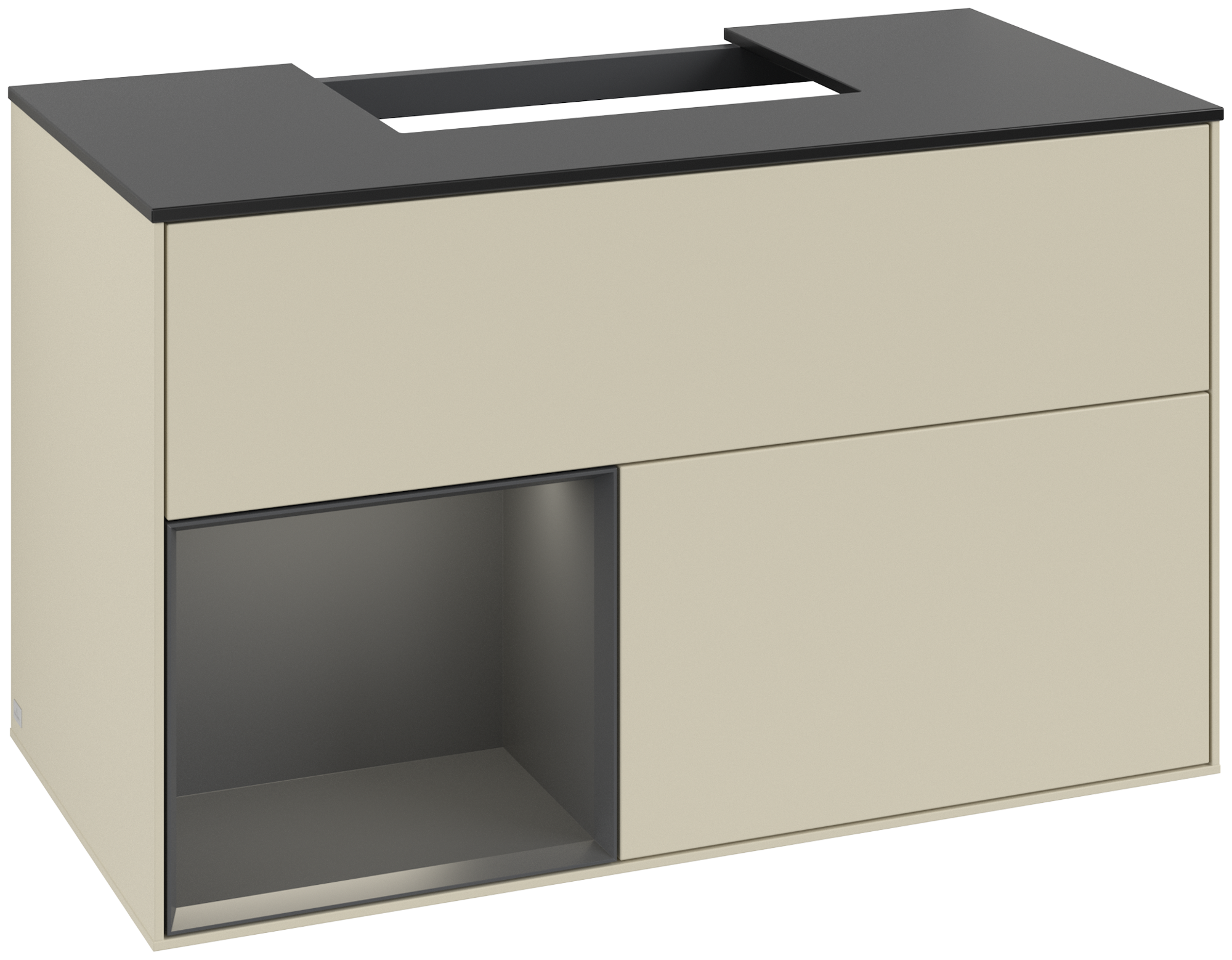 Finion Vanity unit, with lighting, 2 pull-out compartments, 1000x603x501mm, Body: Silk Grey Matt Lacquer, Front: Silk Grey Matt Lacquer, Shelf: Walnut Veneer, Cover plate: Glass Black Matt